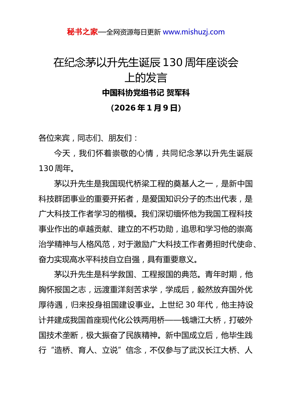 秘书之家—全网资源每日更新 www.mishuzj.com在纪念茅以升先生诞辰 130 周年座谈会上的发言中国科协党组书记 贺军科(2026 年 1 月 9 日)各位来宾,同志们、朋友们:今天,我们怀着崇敬的心情,共同纪念茅以升先生诞辰130 周年。茅以升先生是我国现代桥梁工程的奠基人之一,是新中国科技群团事业的重要开拓者,是爱国知识分子的杰出代表,是广大科技工作者学习的楷模。我们深切缅怀他为我国工程科技事业作出的卓越贡献、建立的不朽功勋,追思和学习他的崇高治学精神与人格风范,对于激励广大科技工作者勇担时代使命、奋力实现高水平科技自立自强,具有重要意义。茅以升先生是科学救国、工程报国的典范。青年时期,他胸怀报国之志,远渡重洋刻苦求学,学成后,毅然放弃国外优厚待遇,归来投身祖国建设事业。上世纪 30 年代,他主持设计并建成我国首座现代化公铁两用桥——钱塘江大桥,打破外国技术垄断,极大振奋了民族精神。新中国成立后,他毕生践行“造桥、育人、立说”信念,不仅参与了武汉长江大桥、人秘书之家—全网资源每日更新 www.mishuzj.com民大会堂等一系列重大工程建设,更通过教育、著述培养了大批工程技术人才,为我国现代交通与科技事业奠定坚实基础。茅以升先生是我国科技群团事业的重要奠基人。新中国成立前夕,他被推举为自然科学界代表出席第一届中国人民政治协商会议。1950 年科代会后,担任中华全国科学技术普及协会(全国科普)副主席。1958 年中国科学技术协会第一次全国代表大会后,他连续担任第一届、第二届全国委员会副主席,第三届名誉主席,为中国科协的创立、建设与发展作出了杰出贡献。他坚持运用马克思主义立场观点方法,深入研究社会主义教育、科技、人才事业发展相关问题,受到党和国家高度重视,对我国现代化建设产生积极影响。茅以升先生是学术繁荣的坚定推动者。他深刻认识到学术交流对科技发展的促进作用,大力倡导学术民主,营造“百花齐放、百家争鸣”的学术氛围。他积极推动科技社团建设,亲自担任中国土木工程学会的首任理事长,发起成立土力学及基础工程领域的全国学术组织,并努力促成加入国际相关学术组织,为我国工程科技界融入国际学术舞台打开通道。此外,他大力推动科技与文化深度融合,发起成立中国文物保护技术协会等交叉领域科技社团,主持修撰《中国古桥技术史》等系列著作,致力从我国古桥建筑技术工艺中挖掘中华优秀传统文化秘书之家—全网资源每日更新 www.mishuzj.com创新基因。茅以升先生是我国科普事业的卓越开拓者。他提出“科学属于人民”,把科普看作中国通向现代化的桥梁,主张科研和科普相辅相成。他撰写了大量兼具科学严谨性与文学感染力的科普名篇,主编《自然科学小丛书》等系列读物,激发无数青少年的科学梦想。从上世纪 50 年代起,他便积极呼吁建设国家级科技馆,并于 80 年代担任中国科协中国科技馆筹建委员会主任,面对项目缓建等困难,他多方奔走、积极建言,推动科技馆从蓝图变为现实,为我国现代科技馆体系建设作出了开创性贡献。茅以升先生留给我们的不仅是矗立于江河之上的座座丰碑更是穿越时空、历久弥新的精神财富。我们要学习他矢志不渝、科技报国的爱国情怀,始终心怀“国之大者”,自觉将个人理想融入国家发展大局,把爱国之情、报国之志转化为创新创造的实际行动。我们要学习他严谨求实、精益求精的科学态度,以“十年磨一剑”的执着和“毫米不差”的严谨,突破关键核心技术,锻造精品工程,在科技报国、为民造福的道路上不断追求卓越。我们要学习他甘为人梯、奖掖后学的育人精神,把发现、培养、提携青年人才作为义不容辞的责任,鼓励探索、宽容失败,为青年成长铺路搭桥。秘书之家—全网资源每日更新 www.mishuzj.com近年来,中国科协大力弘扬茅以升先生等老一辈科学家优良传统,积极推动科学家题材文艺作品编创展演,广泛开展科学道德和学风建设宣讲,竭力支持茅以升科技教育基金会发展,科技事业发展的社会环境持续优化。同志们,朋友们!纪念,是为了更好的前行。让我们更加紧密地团结在以习近平同志为核心的党中央周围,深入学习贯彻党的二十大和二十届历次全会精...