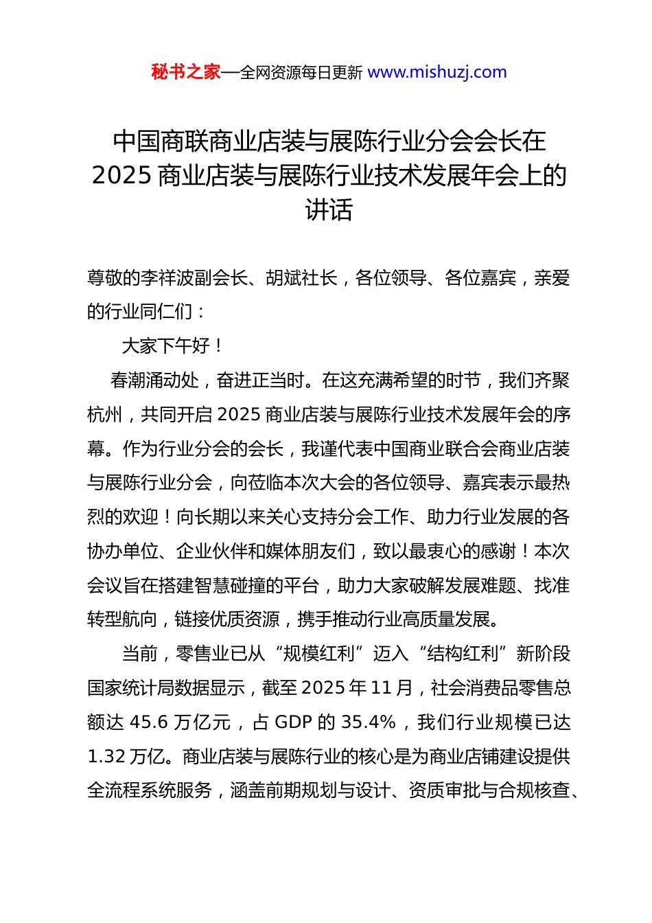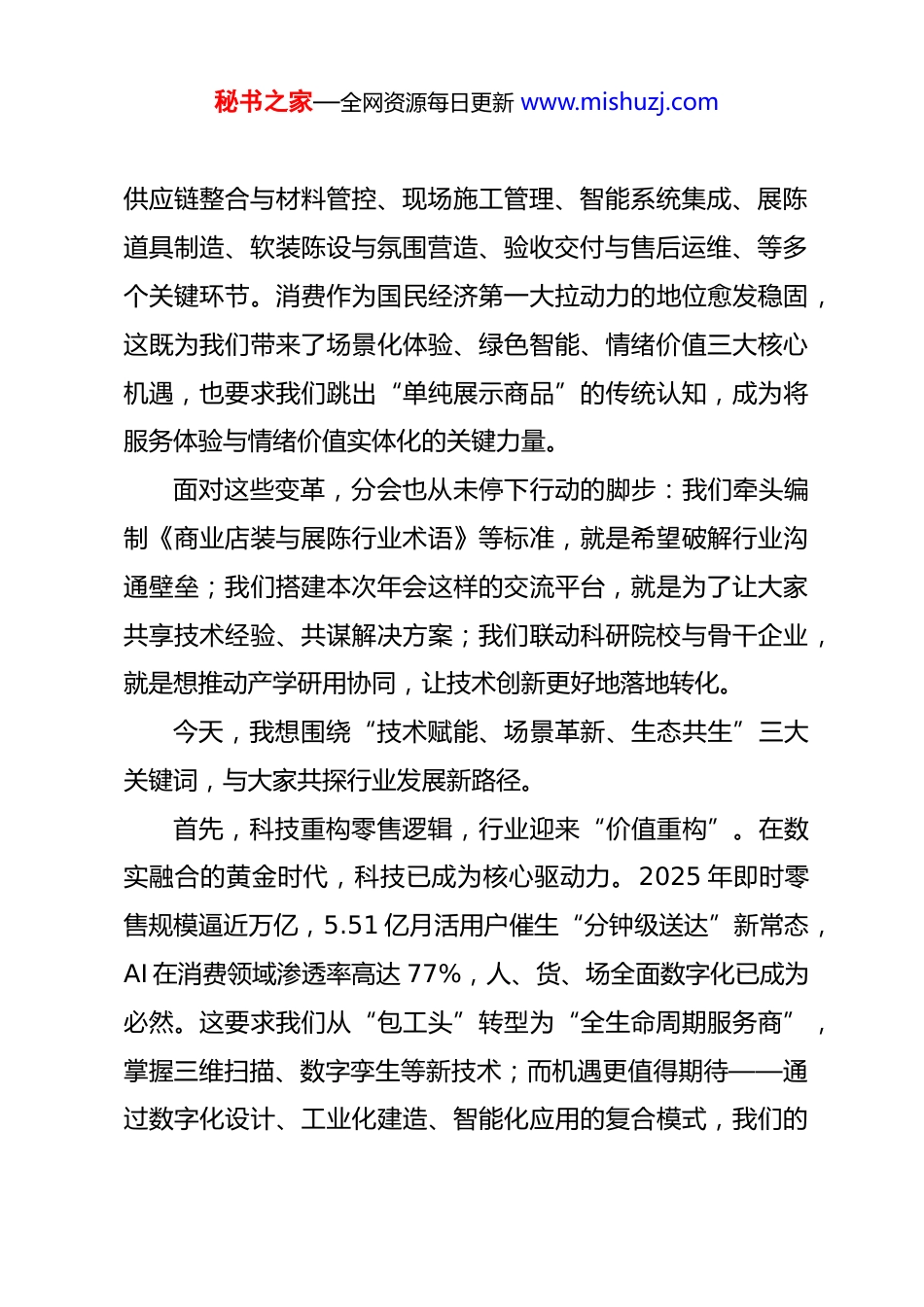 秘书之家—全网资源每日更新 www.mishuzj.com中国商联商业店装与展陈行业分会会长在2025 商业店装与展陈行业技术发展年会上的讲话尊敬的李祥波副会长、胡斌社长,各位领导、各位嘉宾,亲爱的行业同仁们:大家下午好! 春潮涌动处,奋进正当时。在这充满希望的时节,我们齐聚杭州,共同开启 2025 商业店装与展陈行业技术发展年会的序幕。作为行业分会的会长,我谨代表中国商业联合会商业店装与展陈行业分会,向莅临本次大会的各位领导、嘉宾表示最热烈的欢迎!向长期以来关心支持分会工作、助力行业发展的各协办单位、企业伙伴和媒体朋友们,致以最衷心的感谢!本次会议旨在搭建智慧碰撞的平台,助力大家破解发展难题、找准转型航向,链接优质资源,携手推动行业高质量发展。当前,零售业已从“规模红利”迈入“结构红利”新阶段国家统计局数据显示,截至 2025 年 11 月,社会消费品零售总额达 45.6 万亿元,占 GDP 的 35.4%,我们行业规模已达1.32 万亿。商业店装与展陈行业的核心是为商业店铺建设提供全流程系统服务,涵盖前期规划与设计、资质审批与合规核查、秘书之家—全网资源每日更新 www.mishuzj.com供应链整合与材料管控、现场施工管理、智能系统集成、展陈道具制造、软装陈设与氛围营造、验收交付与售后运维、等多个关键环节。消费作为国民经济第一大拉动力的地位愈发稳固,这既为我们带来了场景化体验、绿色智能、情绪价值三大核心机遇,也要求我们跳出“单纯展示商品”的传统认知,成为将服务体验与情绪价值实体化的关键力量。面对这些变革,分会也从未停下行动的脚步:我们牵头编制《商业店装与展陈行业术语》等标准,就是希望破解行业沟通壁垒;我们搭建本次年会这样的交流平台,就是为了让大家共享技术经验、共谋解决方案;我们联动科研院校与骨干企业,就是想推动产学研用协同,让技术创新更好地落地转化。今天,我想围绕“技术赋能、场景革新、生态共生”三大关键词,与大家共探行业发展新路径。首先,科技重构零售逻辑,行业迎来“价值重构”。在数实融合的黄金时代,科技已成为核心驱动力。2025 年即时零售规模逼近万亿,5.51 亿月活用户催生“分钟级送达”新常态,AI 在消费领域渗透率高达 77%,人、货、场全面数字化已成为必然。这要求我们从“包工头”转型为“全生命周期服务商”,掌握三维扫描、数字孪生等新技术;而机遇更值得期待——通过数字化设计、工业化建造、智能化应用的复合模式,我们的秘书之家—全网资源每日更新 www.mishuzj.com毛利率可提升 5 个点,客户粘性与生命周期价值将大幅增长。其次,聚焦三大“破局点”,扎实推进数字化转型。面对传统模式下设计工具落后、效率偏低、管理粗放的痛点,转型的核心抓手在于:一是以 BIM 技术为核心的数字化设计,可减少 30%返工率、缩短 15%工期,用数据驱动替代经验依赖;二是工业化建造,通过工厂预制、现场装配,减少 80%建筑垃圾、缩短 40%工期,筑牢低成本运作基础;三是智能化应用,施工端靠 BIM+IoT 实现人料机实时调度,AI 质检让验收效率提升 50%,生产端以数字孪生驱动柔性产线,定制化道具交付周期缩短 30%。更要强调的是,高质量发展离不开绿色智能底色。这既是响应国家“双碳”战略的必然要求,更是企业核心竞争力的关键体现。希望大家积极采用环保材料,建立全生命周期环保管控,融合智能照明、温控等节能技术,更要主动应用中商联《绿色商业店铺评价规范》(T/CGCC92—2024),让绿色成为行业发展的鲜明底色。最后,唯有生态共生,方能行稳致远。店装展陈企业要主动转型为“数字化解决方案服务商”,将美学审美与商业逻辑深度融合,既懂空间设计,更通数据应用;品牌方要给予创新空间,共探数字化展陈新模式;技术服务商要推出轻量化、低秘书之家—全网资源每日更新 www.mishuzj.com成本方案,降低转型门槛。协会也将持续发挥桥梁作用,搭建交流平台、推动标准落地、组织标杆参访,助力大家少走弯路、携手共进。也希望大家能珍惜这次技术年会的机会,畅所欲言、深度交流,在思想碰撞中寻找创新灵感,在资源对接中拓展合作空间。协会将继续秉持“构建...