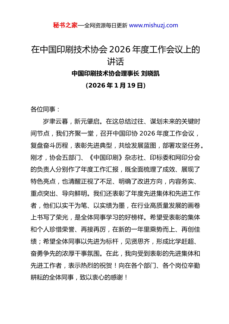 秘书之家—全网资源每日更新 www.mishuzj.com在中国印刷技术协会 2026 年度工作会议上的讲话中国印刷技术协会理事长 刘晓凯(2026 年 1 月 19 日)各位同事:岁聿云暮,新元肇启。在这总结过往、谋划未来的关键时间节点,我们齐聚一堂,召开中国印协 2026 年度工作会议,复盘奋斗历程,表彰先进典型,共绘发展蓝图,部署攻坚任务。刚才,协会五部门、《中国印刷》杂志社、印标委和网印分会的负责人分别作了年度工作汇报,既全面梳理了成效、展现了特色亮点,也清醒正视了不足、明确了改进方向,内容务实、重点突出、导向鲜明。我们还表彰了年度先进集体和先进工作者,他们以实干为笔、以实绩为墨,在行业高质量发展的画卷上书写了荣光,是全体同事学习的好榜样。希望受表彰的集体和个人珍惜荣誉、再接再厉,在新的一年里乘势而上、再创佳绩;希望全体同事以先进为标杆,见贤思齐,形成比学赶超、奋勇争先的浓厚干事氛围。在此,我向受到表彰的先进集体和先进工作者,表示热烈的祝贺!向在各个部门、各个岗位辛勤耕耘的全体同事,致以衷心的感谢!秘书之家—全网资源每日更新 www.mishuzj.com 2025 年是“十四五”规划收官决胜之年,是印刷业以新质生产力破局突围、向数智绿色融合转型的攻坚之年,更是协会锚定使命、实干笃行的奋进之年。一年来,在中宣部的坚强领导下,我们高举习近平新时代中国特色社会主义思想伟大旗帜,深入学习贯彻党的二十大和二十届历次全会精神,深刻领悟习近平文化思想的核心要义,团结带领全行业坚定信心、攻坚克难、锐意进取,在党建引领、品牌塑造、产业赋能、人才培育、国际化拓展等方面均取得了一系列标志性成果,为“十四五”印刷业高质量发展画上了圆满的句号。回望 2025年,我们凝心聚力、多点突破,各项工作亮点纷呈、成效卓著,交出了一份厚重提气的年度答卷。一是高举思想旗帜,政治引领走深走实。我们始终把政治建设摆在首位,以习近平新时代中国特色社会主义思想为指导,将习近平文化思想融入行业发展各领域、全过程。协会党支部严格落实“第一议题”制度,全年召开支委会 15 次、党员大会 14 次,举办党课 4 次、骨干培训班 3 期、主题党日活动 2次,围绕中央八项规定精神开展专题学习教育,通过主题活动、专题党课、网络直播培训等形式,推动党的创新理论入脑入心、落地生根。成功召开第十届全国会员代表大会、协会成立 45周年印刷业高质量发展大会,以会议为纽带凝聚了行业共识,秘书之家—全网资源每日更新 www.mishuzj.com以庆典为契机传承匠心精神,切实增强了全行业的凝聚力、向心力、战斗力,为印刷业高质量发展和新质生产力的形成提供了坚强的思想保障和政治引领。二是深耕品牌矩阵,行业影响持续攀升。我们以品牌活动为抓手,搭建高水平交流展示平台,激活产业动能。第十届全印展筹备工作蹄疾步稳,招展质量与进度双超预期。我们走访重点参展商、召开新闻发布会及区域推介会,在北京、温州、东莞等行业集聚地开展专题推广和供需对接活动,持续扩大展会覆盖面与行业影响力,打造全球印刷业交流合作的核心枢纽。圆满完成第 33 届全国书博会“智印未来”主题展服务工作,组织 26 家产业链企业参展,在 1800 平方米展区内将非遗文化与数字印刷相融、时尚卡牌与互动定制共生,生动展现了印刷科技的魅力与文化传承的温度。成功举办国际网印及数字化智能印刷展会,展览面积近 2 万平方米,吸引 60 多个国家和地区 3 万人次海内外专业观众,集中展示了全产业链创新成果,为行业技术迭代和国际合作搭建了坚实桥梁。三是聚焦新质生产力,产业赋能精准有力。我们紧扣行业转型需求,以整体性发力筑牢服务根基,统筹推进各项业务精准落地。深度参与《印刷业“十五五”发展规划》《印刷业数字化三年行动计划(2025-2027)》等顶层规划的编制工作,秘书之家—全网资源每日更新 www.mishuzj.com为行业发展谋篇布局。承接第五届中国印刷业创新发展大会“印刷服务美好生活”专题展和中国科协“科学文化中国行—印刷之旅”项目,以群众喜闻乐见的形式传播行业声音,让印刷之美浸润生活、滋养人心。统筹推进数...