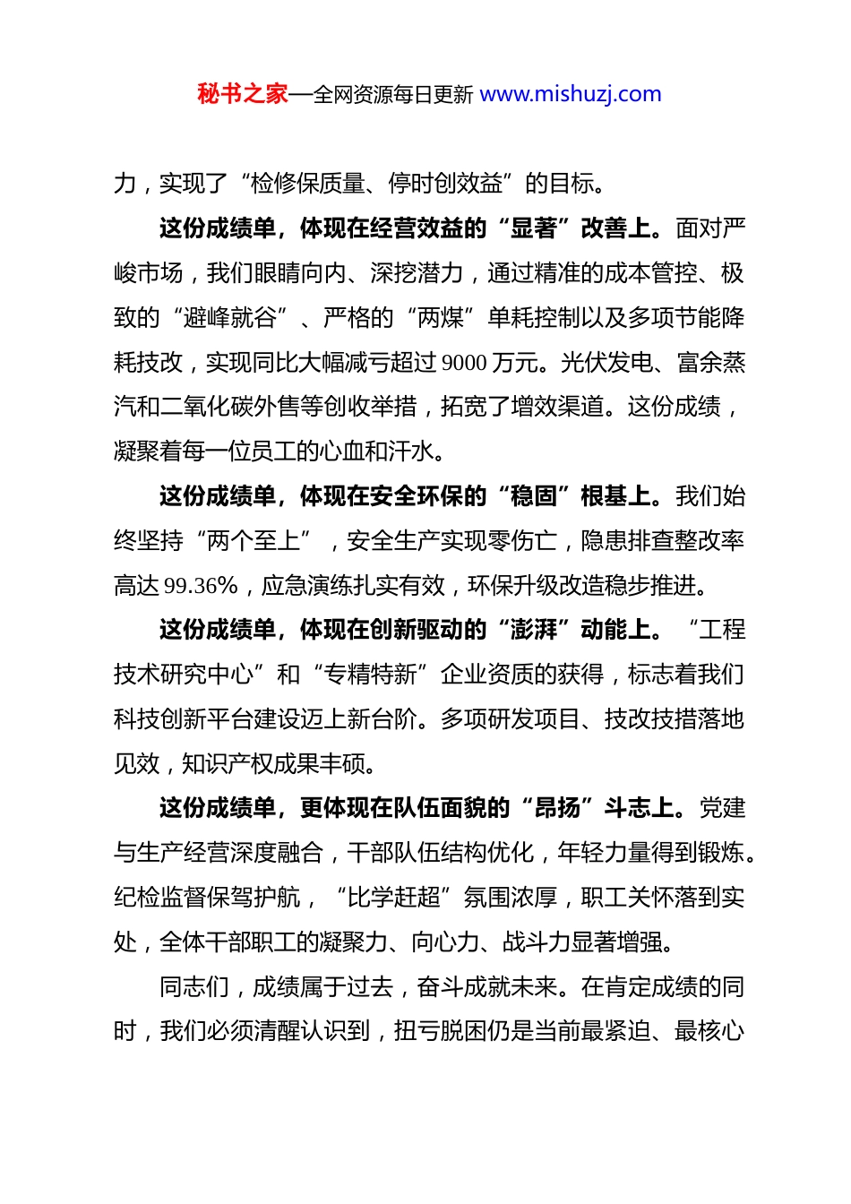 秘书之家—全网资源每日更新 www.mishuzj.com中新化工公司总经理、党委副书记尚阳锋在2026 年首次早调会上的讲话同志们:大家新年好!今天我们召开新年的首次调度会,既是收心聚力、部署工作的动员会,也是承前启后、再启新程的誓师会。刚刚过去的 2025 年,是新乡园区在集团公司的坚强领导下,应对挑战、砥砺奋进、成果丰硕的一年。我们深入贯彻上级各项决策部署,紧紧围绕“稳大局、强融合、开新局”的工作主线,全园上下同心同德、迎难而上,在极为不易的形势下,打赢了生产经营的攻坚战、安全环保的保卫战、改革创新的主动战,交出了一份可圈可点、亮点纷呈的答卷,为“十五五”良好开局打下了决定性基础。在此,我代表园区领导班子,向一年来辛勤付出、拼搏奉献的全体干部职工,致以最崇高的敬意和最诚挚的感谢!回首 2025,我们奋力拼搏,成绩来之不易。这份成绩单,体现在生产运行的“硬核”突破上。甲醇装置全年保持高效稳定运行,全年共计运行 346 天,产能释放率131%,实现运行天数与产量任务创历史新高。年度大修周期从20 天压缩至 9.5 天,展现了我们卓越的组织能力和强大的战斗秘书之家—全网资源每日更新 www.mishuzj.com力,实现了“检修保质量、停时创效益”的目标。这份成绩单,体现在经营效益的“显著”改善上。面对严峻市场,我们眼睛向内、深挖潜力,通过精准的成本管控、极致的“避峰就谷”、严格的“两煤”单耗控制以及多项节能降耗技改,实现同比大幅减亏超过 9000 万元。光伏发电、富余蒸汽和二氧化碳外售等创收举措,拓宽了增效渠道。这份成绩,凝聚着每一位员工的心血和汗水。这份成绩单,体现在安全环保的“稳固”根基上。我们始终坚持“两个至上”,安全生产实现零伤亡,隐患排查整改率高达 99.36%,应急演练扎实有效,环保升级改造稳步推进。这份成绩单,体现在创新驱动的“澎湃”动能上。“工程技术研究中心”和“专精特新”企业资质的获得,标志着我们科技创新平台建设迈上新台阶。多项研发项目、技改技措落地见效,知识产权成果丰硕。这份成绩单,更体现在队伍面貌的“昂扬”斗志上。党建与生产经营深度融合,干部队伍结构优化,年轻力量得到锻炼。纪检监督保驾护航,“比学赶超”氛围浓厚,职工关怀落到实处,全体干部职工的凝聚力、向心力、战斗力显著增强。同志们,成绩属于过去,奋斗成就未来。在肯定成绩的同时,我们必须清醒认识到,扭亏脱困仍是当前最紧迫、最核心秘书之家—全网资源每日更新 www.mishuzj.com的任务,安全环保的基础仍需不断夯实,创新成果的转化效益有待进一步提升,部分环节的管理精细化水平还有提升空间。2026 年,是实施“十五五”规划的关键之年,也是园区深化改革、提质增效、迈向高质量发展的攻坚之年。站在新的起点,我们面临的机遇与挑战并存,但机遇大于挑战。展望 2026,我们锚定目标,奋力开创新局。新的一年,我们要坚持“稳”字当头、稳中求进。稳生产、稳运行、稳安全、稳队伍,筑牢高质量发展的基本盘。继续优化生产组织,确保装置“安、稳、长、满、优”运行,力争主要产品产量、质量再上新台阶。新的一年,我们要聚焦“效”字发力、深化提质。将“一切成本皆可降”的理念贯彻到底,深化精细化管理,拓展降本增效新路径。全力开拓市场,优化产品结构,千方百计提升营业收入和盈利水平,坚决打赢扭亏增盈翻身仗。新的一年,我们要突出“改”字攻坚、激发活力。持续推进改革创新,加快在研项目的产业化步伐,特别是推动延链补链项目落地。盘活闲置资产,优化资源配置,激发内生动力和发展活力。新的一年,我们要严守“安”字底线、筑牢屏障。以“时时放心不下”的责任感,压实全员安全生产责任制,狠抓隐患秘书之家—全网资源每日更新 www.mishuzj.com排查治理,确保安全风险可控在控。全力争取环保绩效 B 级认定成功,推动本质安全环保水平持续提升。新的一年,我们要强化“人”字为本、凝聚合力。打造“价值党建”新品牌,加强干部人才队伍建设,关心关爱职工,畅通职业发展通道,营造干事创业的良好氛围,让每一位员工都能与园区共同成长、共享发展成果。同志们,号角已经吹响,征...