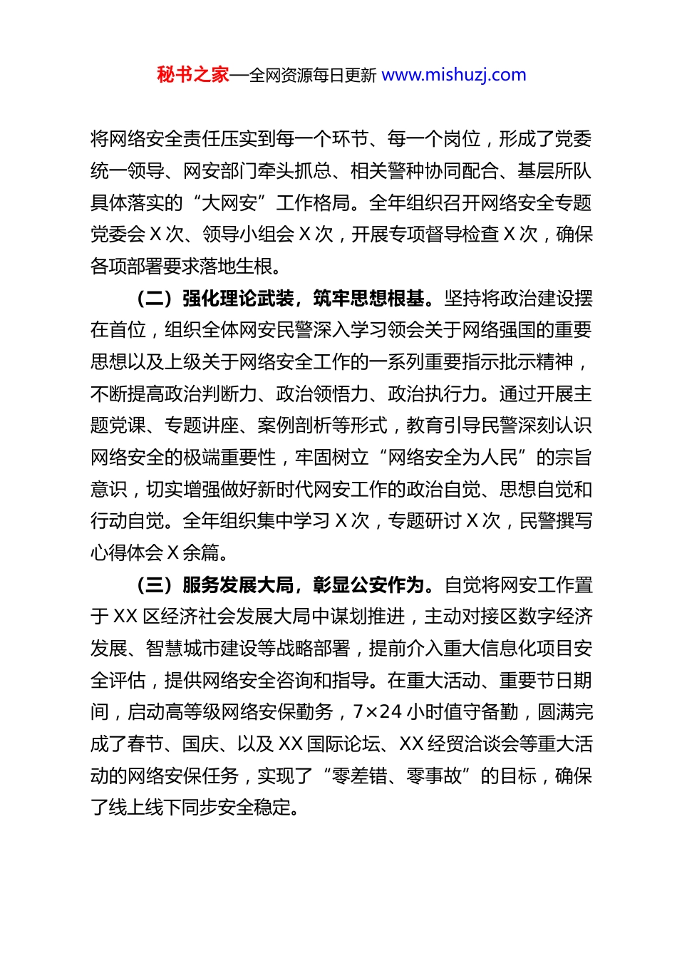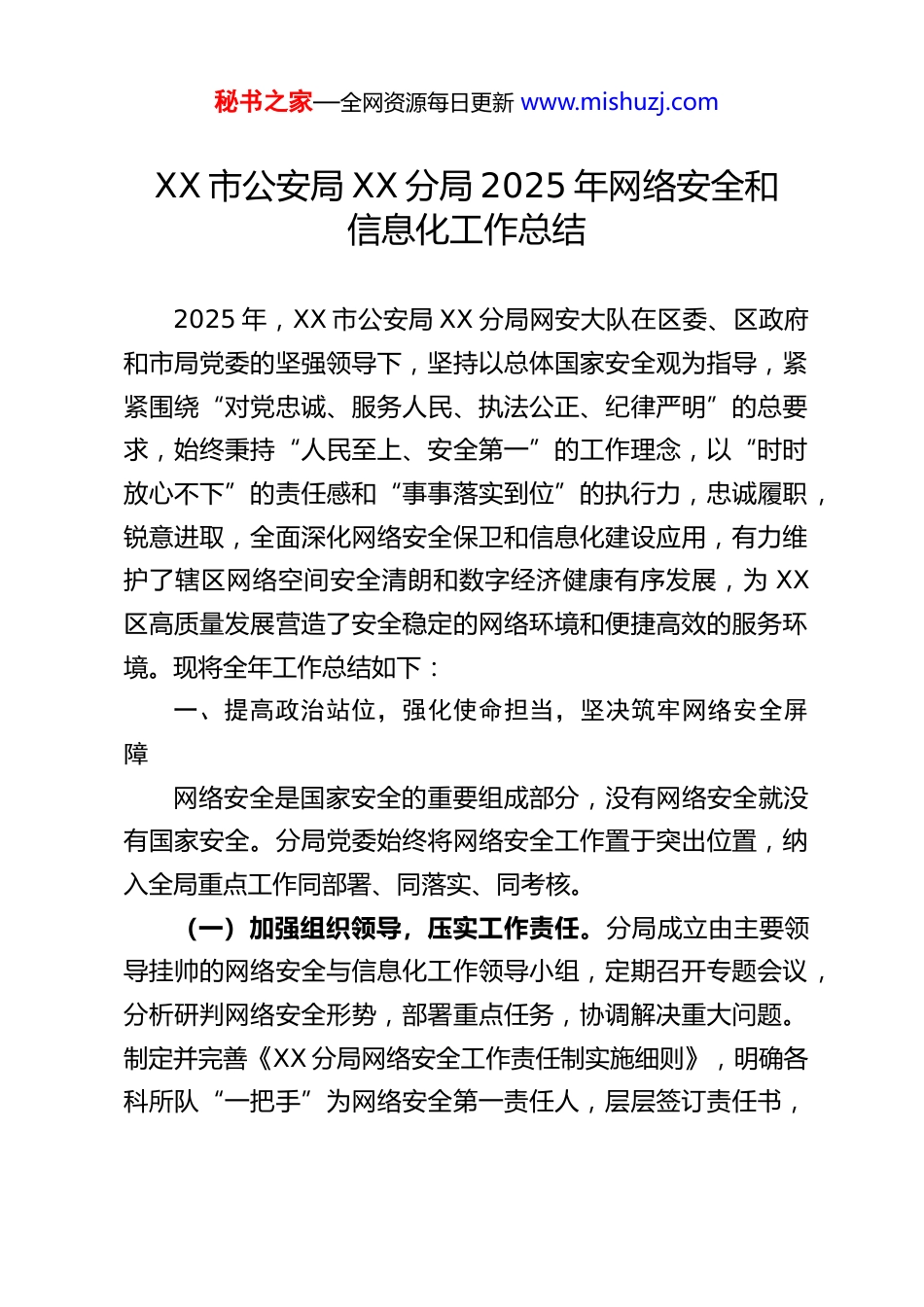 秘书之家—全网资源每日更新 www.mishuzj.comXX 市公安局 XX 分局 2025 年网络安全和信息化工作总结2025 年,XX 市公安局 XX 分局网安大队在区委、区政府和市局党委的坚强领导下,坚持以总体国家安全观为指导,紧紧围绕“对党忠诚、服务人民、执法公正、纪律严明”的总要求,始终秉持“人民至上、安全第一”的工作理念,以“时时放心不下”的责任感和“事事落实到位”的执行力,忠诚履职,锐意进取,全面深化网络安全保卫和信息化建设应用,有力维护了辖区网络空间安全清朗和数字经济健康有序发展,为 XX区高质量发展营造了安全稳定的网络环境和便捷高效的服务环境。现将全年工作总结如下:一、提高政治站位,强化使命担当,坚决筑牢网络安全屏障网络安全是国家安全的重要组成部分,没有网络安全就没有国家安全。分局党委始终将网络安全工作置于突出位置,纳入全局重点工作同部署、同落实、同考核。(一)加强组织领导,压实工作责任。分局成立由主要领导挂帅的网络安全与信息化工作领导小组,定期召开专题会议,分析研判网络安全形势,部署重点任务,协调解决重大问题。制定并完善《XX 分局网络安全工作责任制实施细则》,明确各科所队“一把手”为网络安全第一责任人,层层签订责任书,秘书之家—全网资源每日更新 www.mishuzj.com将网络安全责任压实到每一个环节、每一个岗位,形成了党委统一领导、网安部门牵头抓总、相关警种协同配合、基层所队具体落实的“大网安”工作格局。全年组织召开网络安全专题党委会 X 次、领导小组会 X 次,开展专项督导检查 X 次,确保各项部署要求落地生根。(二)强化理论武装,筑牢思想根基。坚持将政治建设摆在首位,组织全体网安民警深入学习领会关于网络强国的重要思想以及上级关于网络安全工作的一系列重要指示批示精神,不断提高政治判断力、政治领悟力、政治执行力。通过开展主题党课、专题讲座、案例剖析等形式,教育引导民警深刻认识网络安全的极端重要性,牢固树立“网络安全为人民”的宗旨意识,切实增强做好新时代网安工作的政治自觉、思想自觉和行动自觉。全年组织集中学习 X 次,专题研讨 X 次,民警撰写心得体会 X 余篇。(三)服务发展大局,彰显公安作为。自觉将网安工作置于 XX 区经济社会发展大局中谋划推进,主动对接区数字经济发展、智慧城市建设等战略部署,提前介入重大信息化项目安全评估,提供网络安全咨询和指导。在重大活动、重要节日期间,启动高等级网络安保勤务,7×24 小时值守备勤,圆满完成了春节、国庆、以及 XX 国际论坛、XX 经贸洽谈会等重大活动的网络安保任务,实现了“零差错、零事故”的目标,确保了线上线下同步安全稳定。秘书之家—全网资源每日更新 www.mishuzj.com二、坚持技术驱动,夯实防护基础,全面提升主动防御能力面对日益严峻复杂的网络安全形势,我们坚持向科技要警力、要战斗力,大力加强技术手段建设,推动网络安全防护从被动应对向主动预警、从单点防御向体系防护转变。(一)深化基础设施防护,守住安全底线。将关键信息基础设施安全保护作为重中之重。联合区工信、通管等部门,对全区能源、交通、金融、教育、医疗、水利、环保、广电等重点行业领域的 X 家单位的关键信息基础设施进行了两轮次全覆盖网络安全专项检查和技术检测,重点排查网络架构、边界安全、数据安全、应用安全等方面的风险隐患。针对发现的薄弱环节和安全隐患,建立台账,限期整改,跟踪问效。全年累计发现并督促整改中高危安全漏洞 X 个,安全配置缺陷 X 处,违规外联等问题 X 起,有效提升了关键信息基础设施的韧性和生存能力。严格落实网络安全等级保护制度,加强对第二级以上信息系统的备案、测评和整改督导,全年指导完成等级保护测评 X 家,备案信息系统 X 个,注销停用不合规系统备案 X 个。(二)加强网络资产治理,摸清安全底数。针对网络资产底数不清、管理不到位的问题,组织开展全区党政机关、企事业单位网络资产普查登记工作。利用技术扫描与人工核查相结合的方式,对 IP 地址、域名、网站、信息系统、云平台、物联网设备等各类网络资产进行梳理、核...