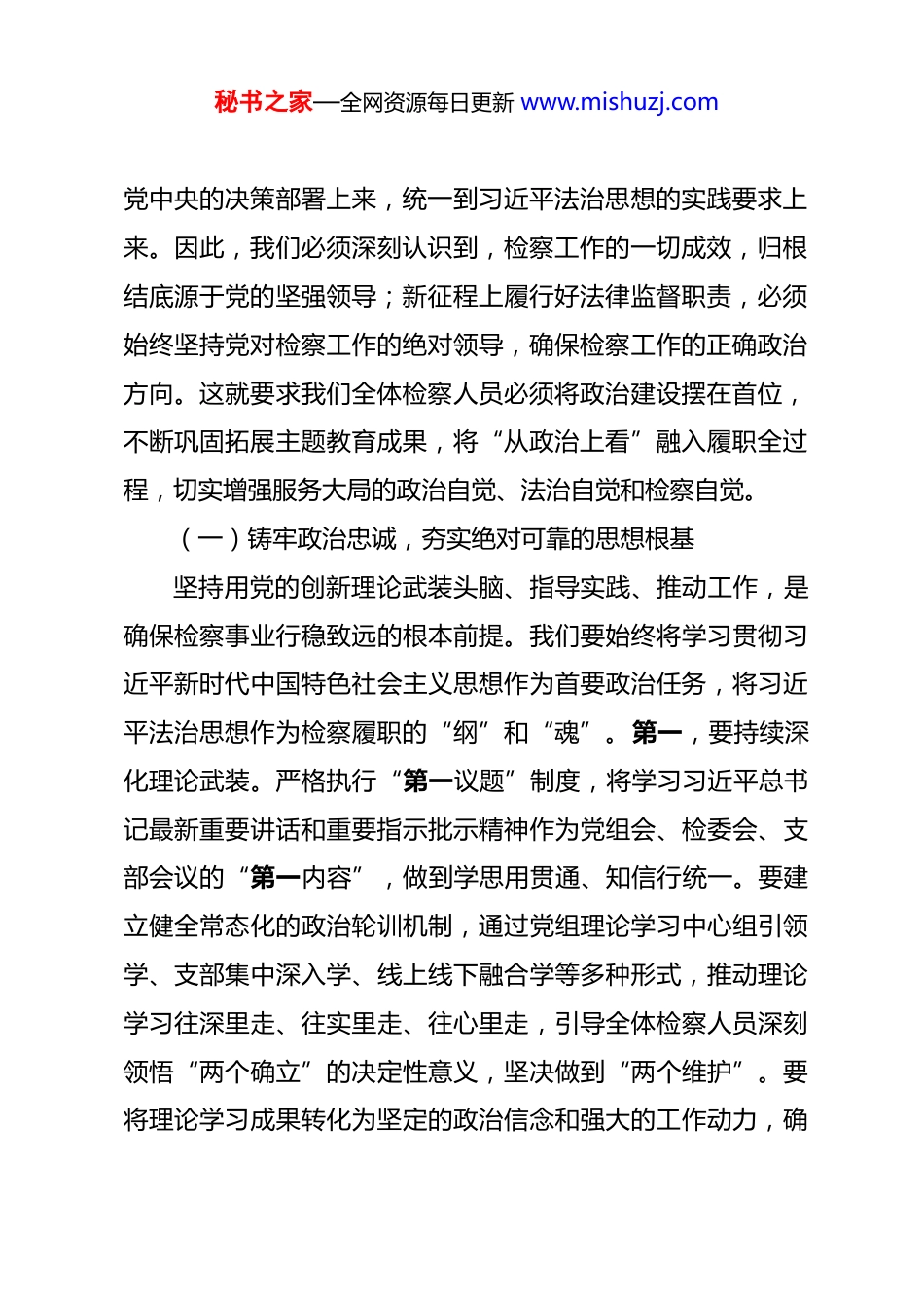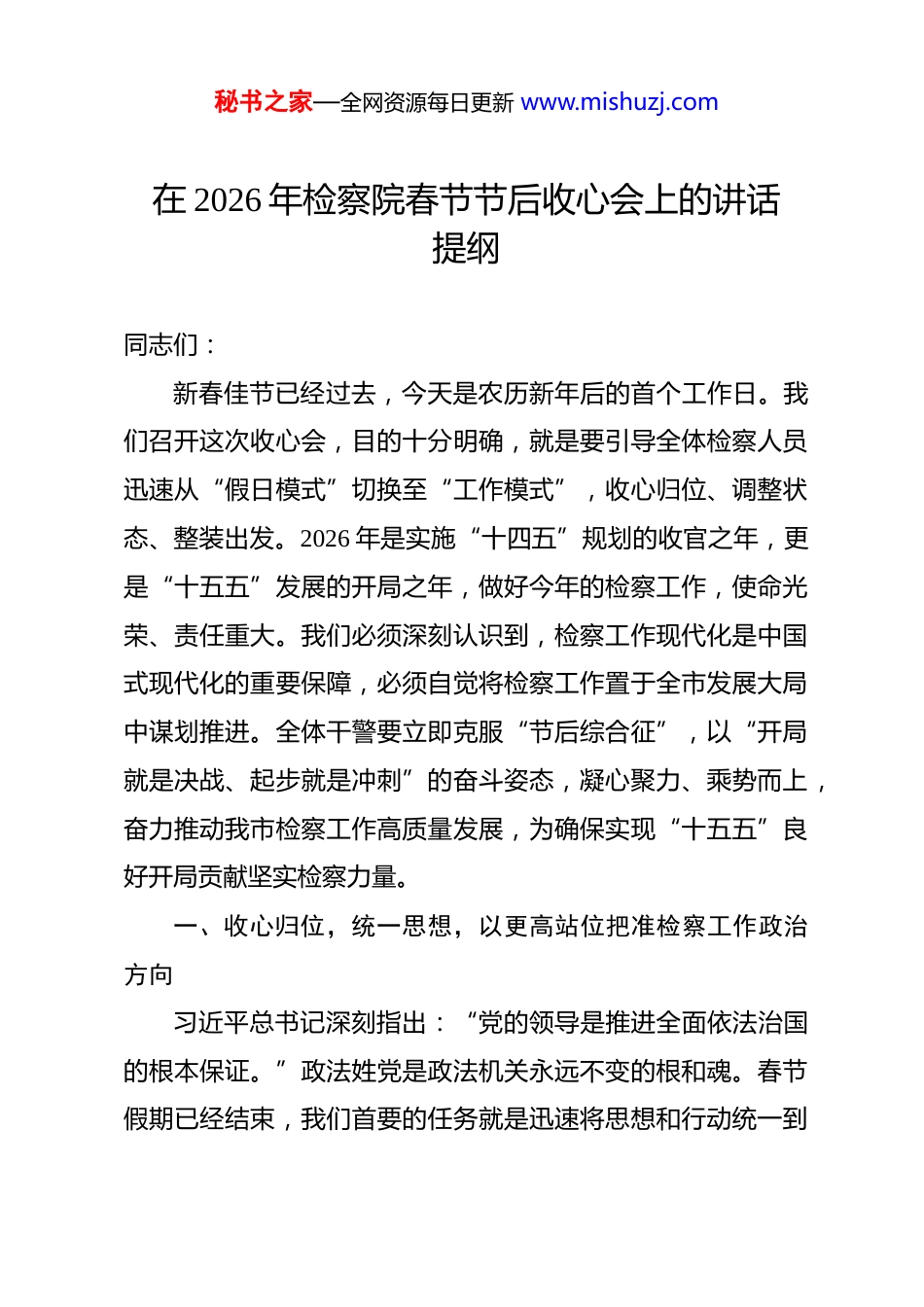 秘书之家—全网资源每日更新 www.mishuzj.com在 2026 年检察院春节节后收心会上的讲话提纲 同志们:新春佳节已经过去,今天是农历新年后的首个工作日。我们召开这次收心会,目的十分明确,就是要引导全体检察人员迅速从“假日模式”切换至“工作模式”,收心归位、调整状态、整装出发。2026 年是实施“十四五”规划的收官之年,更是“十五五”发展的开局之年,做好今年的检察工作,使命光荣、责任重大。我们必须深刻认识到,检察工作现代化是中国式现代化的重要保障,必须自觉将检察工作置于全市发展大局中谋划推进。全体干警要立即克服“节后综合征”,以“开局就是决战、起步就是冲刺”的奋斗姿态,凝心聚力、乘势而上,奋力推动我市检察工作高质量发展,为确保实现“十五五”良好开局贡献坚实检察力量。一、收心归位,统一思想,以更高站位把准检察工作政治方向习近平总书记深刻指出:“党的领导是推进全面依法治国的根本保证。”政法姓党是政法机关永远不变的根和魂。春节假期已经结束,我们首要的任务就是迅速将思想和行动统一到秘书之家—全网资源每日更新 www.mishuzj.com党中央的决策部署上来,统一到习近平法治思想的实践要求上来。因此,我们必须深刻认识到,检察工作的一切成效,归根结底源于党的坚强领导;新征程上履行好法律监督职责,必须始终坚持党对检察工作的绝对领导,确保检察工作的正确政治方向。这就要求我们全体检察人员必须将政治建设摆在首位,不断巩固拓展主题教育成果,将“从政治上看”融入履职全过程,切实增强服务大局的政治自觉、法治自觉和检察自觉。(一)铸牢政治忠诚,夯实绝对可靠的思想根基坚持用党的创新理论武装头脑、指导实践、推动工作,是确保检察事业行稳致远的根本前提。我们要始终将学习贯彻习近平新时代中国特色社会主义思想作为首要政治任务,将习近平法治思想作为检察履职的“纲”和“魂”。第一,要持续深化理论武装。严格执行“第一议题”制度,将学习习近平总书记最新重要讲话和重要指示批示精神作为党组会、检委会、支部会议的“第一内容”,做到学思用贯通、知信行统一。要建立健全常态化的政治轮训机制,通过党组理论学习中心组引领学、支部集中深入学、线上线下融合学等多种形式,推动理论学习往深里走、往实里走、往心里走,引导全体检察人员深刻领悟“两个确立”的决定性意义,坚决做到“两个维护”。要将理论学习成果转化为坚定的政治信念和强大的工作动力,确秘书之家—全网资源每日更新 www.mishuzj.com保在任何时候、任何情况下都始终同以习近平同志为核心的党中央保持高度一致,确保党的路线方针政策在检察机关不折不扣得到贯彻执行。第二,要严守政治纪律和政治规矩。检察机关是政治性极强的业务机关,也是业务性极强的政治机关。全体检察人员必须把严守政治纪律和政治规矩摆在更加突出的位置。要严格执行《中国共产党政法工作条例》和重大事项请示报告制度,凡属重大决策、重要案件、重点工作,都必须按规定及时向市委和上级院请示报告,确保检察工作始终在党的领导下开展。要严肃党内政治生活,认真落实民主集中制,用好批评和自我批评武器,不断增强党内政治生活的政治性、时代性、原则性、战斗性。要加强政治纪律教育,引导干警时刻绷紧政治纪律这根弦,坚决反对和抵制各种错误思潮和言行,自觉做政治上的“明白人”“老实人”。第三,要推动党建与业务深度融合。坚持抓党建、带队建、促业务,是提升检察工作质效的重要法宝。要坚决防止党建与业务“两张皮”现象,积极探索党建与检察业务深度融合的有效路径。要以提升组织力为重点,建强抓实基层党支部,推动党支部标准化规范化建设,把党支部建设成为坚强战斗堡垒。要创新党建活动载体,结合检察业务特点开展特色鲜明的主题党日活动,将政治理论学习、党性锻炼融入案件研讨、业务竞赛、司法为民实践之中。要健秘书之家—全网资源每日更新 www.mishuzj.com全党建考核评价机制,将服务大局、司法办案、队伍建设等业务工作的成效作为检验党建工作质量的重要标准,实现党建工作和业务工作目标同向、部署同步、工作同力,以高质量党建引领和保障检察工作高...