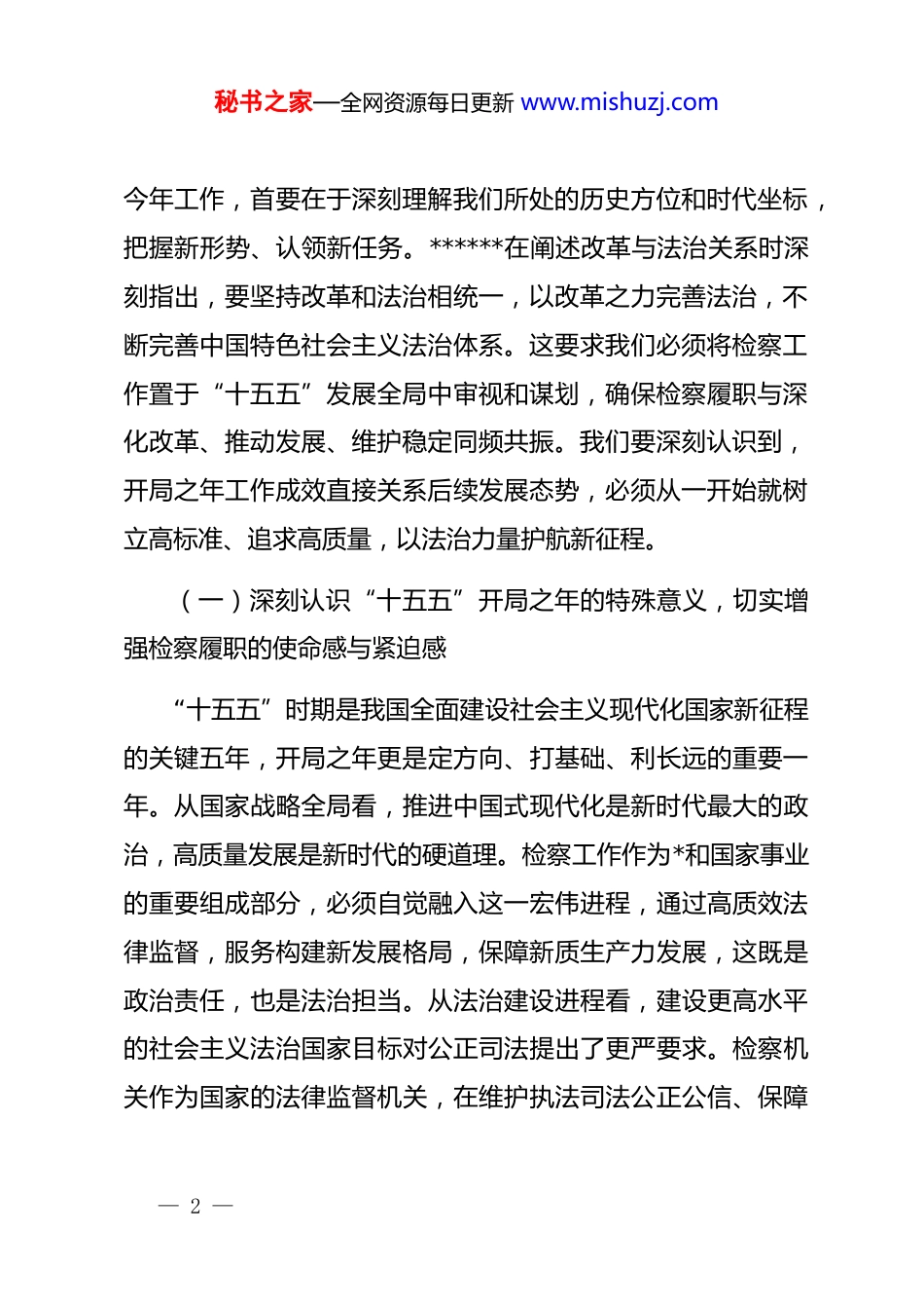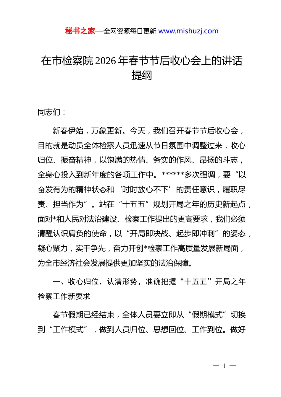 秘书之家—全网资源每日更新 www.mishuzj.com在市检察院 2026 年春节节后收心会上的讲话提纲同志们:新春伊始,万象更新。今天,我们召开春节节后收心会,目的就是动员全体检察人员迅速从节日氛围中调整过来,收心归位、振奋精神,以饱满的热情、务实的作风、昂扬的斗志,全身心投入到新年度的各项工作中。******多次强调,要“以奋发有为的精神状态和‘时时放心不下’的责任意识,履职尽责、担当作为”。站在“十五五”规划开局之年的历史新起点,面对*和人民对法治建设、检察工作提出的更高要求,我们必须清醒认识肩负的使命,以“开局即决战、起步即冲刺”的姿态,凝心聚力,实干争先,奋力开创*检察工作高质量发展新局面,为全市经济社会发展提供更加坚实的法治保障。一、收心归位,认清形势,准确把握“十五五”开局之年检察工作新要求春节假期已经结束,全体人员要立即从“假期模式”切换到“工作模式”,做到人员归位、思想回位、工作到位。做好— 1 —秘书之家—全网资源每日更新 www.mishuzj.com今年工作,首要在于深刻理解我们所处的历史方位和时代坐标,把握新形势、认领新任务。******在阐述改革与法治关系时深刻指出,要坚持改革和法治相统一,以改革之力完善法治,不断完善中国特色社会主义法治体系。这要求我们必须将检察工作置于“十五五”发展全局中审视和谋划,确保检察履职与深化改革、推动发展、维护稳定同频共振。我们要深刻认识到,开局之年工作成效直接关系后续发展态势,必须从一开始就树立高标准、追求高质量,以法治力量护航新征程。(一)深刻认识“十五五”开局之年的特殊意义,切实增强检察履职的使命感与紧迫感“十五五”时期是我国全面建设社会主义现代化国家新征程的关键五年,开局之年更是定方向、打基础、利长远的重要一年。从国家战略全局看,推进中国式现代化是新时代最大的政治,高质量发展是新时代的硬道理。检察工作作为*和国家事业的重要组成部分,必须自觉融入这一宏伟进程,通过高质效法律监督,服务构建新发展格局,保障新质生产力发展,这既是政治责任,也是法治担当。从法治建设进程看,建设更高水平的社会主义法治国家目标对公正司法提出了更严要求。检察机关作为国家的法律监督机关,在维护执法司法公正公信、保障— 2 —秘书之家—全网资源每日更新 www.mishuzj.com社会公平正义中的地位作用愈发凸显,我们必须以更强的责任感和紧迫感,回应人民群众对公平正义的新期待。从我市发展实际看,经济社会高质量发展需要稳定、公平、透明、可预期的法治化营商环境。检察履职必须紧扣市委中心工作,以防范化解重大风险、维护安全稳定、服务保障民生为着力点,为*市加快现代化建设贡献检察力量。当前,改革发展稳定任务艰巨繁重,各类风险挑战交织叠加。我们必须清醒看到,检察工作自身也面临案件总量高位运行、监督质效有待提升、队伍能力需持续加强等挑战。开局之年,容不得半点懈怠,必须以“时时放心不下”的责任感,早谋划、早部署、早行动,将开局优势转化为全年胜势。(二)准确把握检察工作面临的新形势新要求,明确服务大局的着力点与切入点察势者智,驭势者赢。做好新一年检察工作,必须精准把握*中央的新部署、上级检察机关的新要求和经济社会发展的新需求。一是必须坚持“从政治上着眼、从法治上着力”的鲜明导向。要持续学深悟透***法治思想,将其作为检察履职的根本遵循,善于从政治高度认识和处理业务问题,让业务工作更深更实体现政治要求,确保检察工作始终沿着正确方向前进。二— 3 —秘书之家—全网资源每日更新 www.mishuzj.com是必须紧扣“高质效办好每一个案件”的基本价值追求。这要求我们将质量、效率、效果有机统一于检察办案全过程,不仅要做到事实清楚、证据确实、程序合法,更要努力实现政治效果、社会效果、法律效果的有机统一,让人民群众在每一个司法案件中感受到公平正义。三是必须聚焦“为大局服务、为人民司法、为法治担当”的职责使命。具体而言,服务大局要更加主动,围绕维护国家安全、社会稳定、经济发展精准发力;司法为民要更加务实,紧盯就业、消费、社保、医疗等民生领域以及妇女...