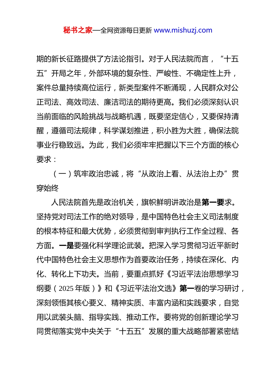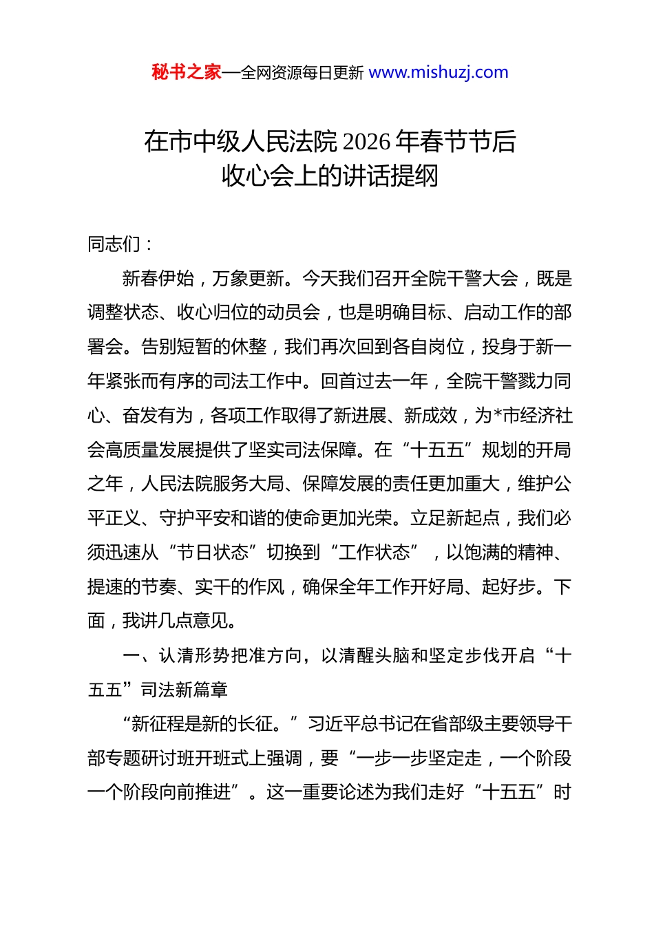 秘书之家—全网资源每日更新 www.mishuzj.com在市中级人民法院 2026 年春节节后收心会上的讲话提纲 同志们:新春伊始,万象更新。今天我们召开全院干警大会,既是调整状态、收心归位的动员会,也是明确目标、启动工作的部署会。告别短暂的休整,我们再次回到各自岗位,投身于新一年紧张而有序的司法工作中。回首过去一年,全院干警戮力同心、奋发有为,各项工作取得了新进展、新成效,为*市经济社会高质量发展提供了坚实司法保障。在“十五五”规划的开局之年,人民法院服务大局、保障发展的责任更加重大,维护公平正义、守护平安和谐的使命更加光荣。立足新起点,我们必须迅速从“节日状态”切换到“工作状态”,以饱满的精神、提速的节奏、实干的作风,确保全年工作开好局、起好步。下面,我讲几点意见。一、认清形势把准方向,以清醒头脑和坚定步伐开启“十五五”司法新篇章“新征程是新的长征。”习近平总书记在省部级主要领导干部专题研讨班开班式上强调,要“一步一步坚定走,一个阶段一个阶段向前推进”。这一重要论述为我们走好“十五五”时秘书之家—全网资源每日更新 www.mishuzj.com期的新长征路提供了方法论指引。对于人民法院而言,“十五五”开局之年,外部环境的复杂性、严峻性、不确定性上升,案件总量持续高位运行,新类型案件不断涌现,人民群众对公正司法、高效司法、廉洁司法的期待更高。我们必须深刻认识当前面临的风险挑战与战略机遇,既要坚定信心,又要保持清醒,遵循司法规律,科学谋划推进,积小胜为大胜,确保法院事业行稳致远。为此,我们必须牢牢把握以下三个方面的核心要求:(一)筑牢政治忠诚,将“从政治上看、从法治上办”贯穿始终人民法院首先是政治机关,旗帜鲜明讲政治是第一要求。坚持党对司法工作的绝对领导,是中国特色社会主义司法制度的根本特征和最大优势,必须贯彻到审判执行工作全过程、各方面。一是要强化科学理论武装。把深入学习贯彻习近平新时代中国特色社会主义思想作为首要政治任务,持续在深化、内化、转化上下功夫。当前,要重点抓好《习近平法治思想学习纲要(2025 年版)》和《习近平法治文选》第一卷的学习研讨,深刻领悟其核心要义、精神实质、丰富内涵和实践要求,自觉用以武装头脑、指导实践、推动工作。要将党的创新理论学习同贯彻落实党中央关于“十五五”发展的重大战略部署紧密结秘书之家—全网资源每日更新 www.mishuzj.com合起来,不断提高政治判断力、政治领悟力、政治执行力,确保法院工作始终沿着正确政治方向前进。二是要严守政治纪律规矩。要始终心怀“国之大者”,自觉将审判执行工作置于党和国家工作大局中谋划推进,做到党中央决策部署到哪里,司法服务保障就跟进到哪里。要严格执行重大事项请示报告制度,确保党中央和上级党委的各项决策部署在全市法院系统得到不折不扣的贯彻执行。要坚决抵制西方“宪政”、“三权鼎立”、“司法独立”等错误思潮影响,坚定不移走中国特色社会主义法治道路。三是要做实“从政治上看、从法治上办”。办理案件不能仅仅停留于法律条文的技术性判断,更要善于从政治高度审视案件背后的复杂社会关系、利益冲突和风险隐患。要注重办案的政治效果、法律效果和社会效果的有机统一,在依法独立公正行使审判权的同时,充分考虑案件处理对国家政治安全、社会稳定、经济发展、意识形态安全可能产生的影响。要严格落实意识形态工作责任制,加强裁判文书说理和法治宣传引导,弘扬社会主义核心价值观,牢牢掌握司法领域意识形态工作的主导权。(二)树立正确政绩观,以求真务实作风夯实长远发展根基“政绩观问题是一个根本性问题,关乎立党为公、执政为秘书之家—全网资源每日更新 www.mishuzj.com民。”“十五五”开局之年,尤其需要树立和践行符合司法规律、造福人民群众的正确政绩观。一是要坚持以人民为中心的发展思想。要把实现好、维护好、发展好最广大人民根本利益作为司法工作的出发点和落脚点。衡量工作成效、评价干部政绩,最终要看是否解决了人民群众的急难愁盼问题,是否让人民群众在每一个司法案件中感受到了公平正义。要坚决反对脱离实际、盲目攀比、急功近利...