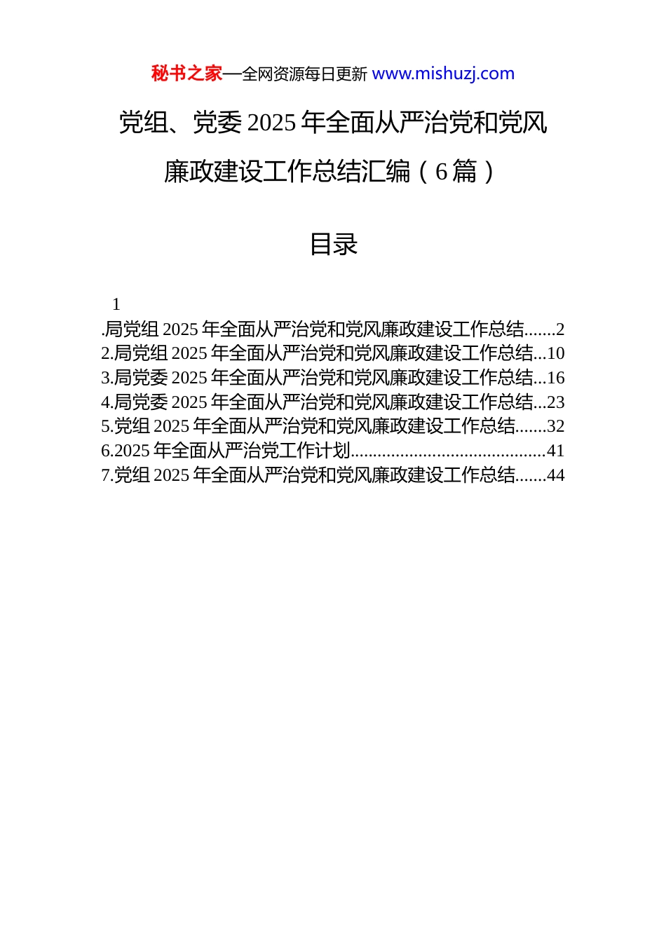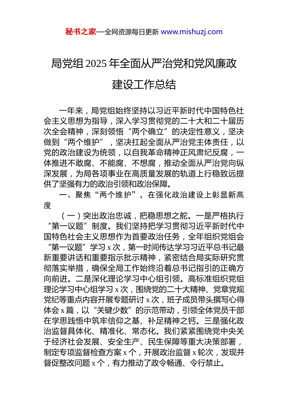 秘书之家—全网资源每日更新 www.mishuzj.com党组、党委 2025 年全面从严治党和党风廉政建设工作总结汇编(6 篇)目录1.局党组 2025 年全面从严治党和党风廉政建设工作总结.......22.局党组 2025 年全面从严治党和党风廉政建设工作总结...103.局党委 2025 年全面从严治党和党风廉政建设工作总结...164.局党委 2025 年全面从严治党和党风廉政建设工作总结...235.党组 2025 年全面从严治党和党风廉政建设工作总结.......326.2025 年全面从严治党工作计划...........................................417.党组 2025 年全面从严治党和党风廉政建设工作总结.......44秘书之家—全网资源每日更新 www.mishuzj.com局党组 2025 年全面从严治党和党风廉政建设工作总结一年来,局党组始终坚持以习近平新时代中国特色社会主义思想为指导,深入学习贯彻党的二十大和二十届历次全会精神,深刻领悟“两个确立”的决定性意义,坚决做到“两个维护”,坚决扛起全面从严治党主体责任,以党的政治建设为统领,以自我革命精神正风肃纪反腐,一体推进不敢腐、不能腐、不想腐,推动全面从严治党向纵深发展,为局各项事业在高质量发展的轨道上行稳致远提供了坚强有力的政治引领和政治保障。一、聚焦“两个维护”,在强化政治建设上彰显新高度(一)突出政治忠诚,把稳思想之舵。一是严格执行“第一议题”制度。我们坚持把学习贯彻习近平新时代中国特色社会主义思想作为首要政治任务,全年组织党组会“第一议题”学习 x 次,第一时间传达学习习近平总书记最新重要讲话和重要指示批示精神,紧密结合局实际研究贯彻落实举措,确保全局工作始终沿着总书记指引的正确方向前进。二是深化理论学习中心组引领。高标准组织党组理论学习中心组学习 x 次,围绕党的二十大精神、党章党规党纪等重点内容开展专题研讨 x 次,班子成员带头撰写心得体会 x 篇,以“关键少数”的示范带动,引领全体党员干部在学思践悟中筑牢信仰之基、补足精神之钙。三是强化政治监督具体化、精准化、常态化。我们紧紧围绕党中央关于经济社会发展、安全生产、民生保障等重大决策部署,制定专项监督检查方案 x 个,开展政治监督 x 轮次,发现并督促整改问题 x 个,有力推动了政令畅通、令行禁止。秘书之家—全网资源每日更新 www.mishuzj.com(二)严明政治纪律,筑牢规矩之堤。一是深入开展纪律教育。我们将政治纪律和政治规矩教育作为干部教育培训的必修课,组织党员干部深入学习《关于新形势下党内政治生活的若干准则》《中国共产党纪律处分条例》等党内法规,邀请市纪委监委专家作专题辅导报告 x 场,引导党员干部知敬畏、存戒惧、守底线。二是严肃党内政治生活。严格执行民主生活会和组织生活会制度,高质量召开年度民主生活会,班子成员深入查摆问题 x 个,开展批评与自我批评见人见事见思想。本人和班子成员均以普通党员身份参加所在支部组织生活会,带头落实双重组织生活制度,营造了严肃健康的党内政治生活氛围。三是坚决贯彻民主集中制。我们严格执行党组议事规定和“三重一大”决策程序,坚持末位表态制,凡是重大决策、重要人事任免、重大项目安排和大额度资金使用,均由党组集体研究决定,全年召开党组会 x 次,研究“三重一大”事项 x 项,确保决策的科学化、民主化、规范化。二、聚焦凝心铸魂,在深化思想建设上取得新成效(一)坚持理论武装“常态化”。一是突出领导带头学。局党组发挥领学促学作用,制定年度学习计划,带头参加读书班、专题研讨,本人带头讲授专题党课 x 次,带动形成崇尚学习、积极学习的良好风气。二是推动党员干部“全面学”。我们为每个党支部配发学习书籍 x 套,依托“三会一课”、主题党日等载-体,组织开展知识竞赛、演讲比赛、学习交流会等活动 x 场次,党员参学率达到 x%。三是创新学习载体“灵活学”。充分运用“学习强国”、单位门户网站、微信公众号等线上平台,打造“指尖上的课堂”,每日推送学习内容,定期通报学习积分,形成了线上线下相结合、全时全域覆盖的学习矩阵,有效解决了工学矛盾。(二)推动理想信念“入心化”。一是传承红...