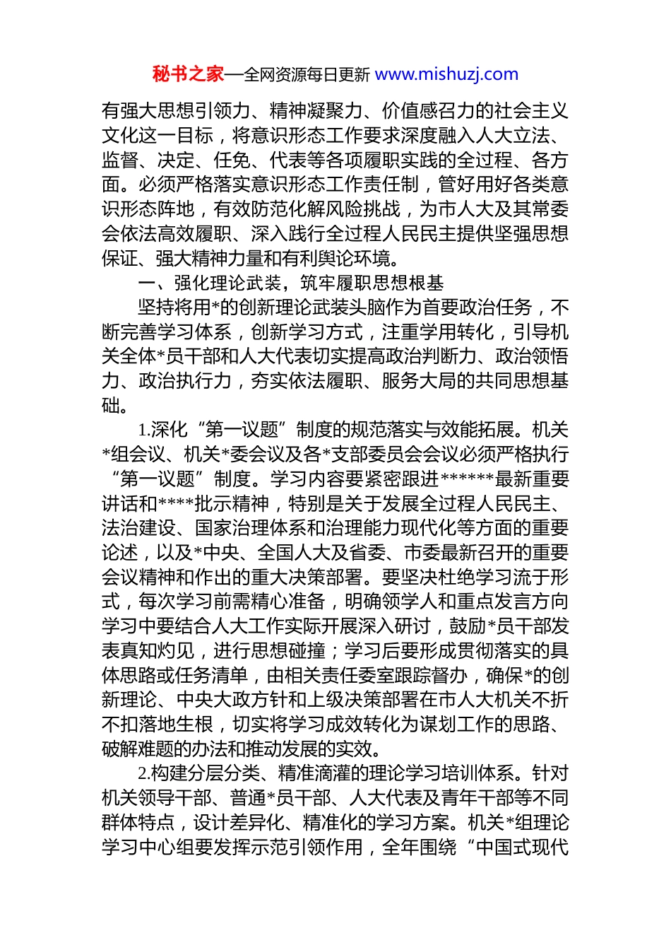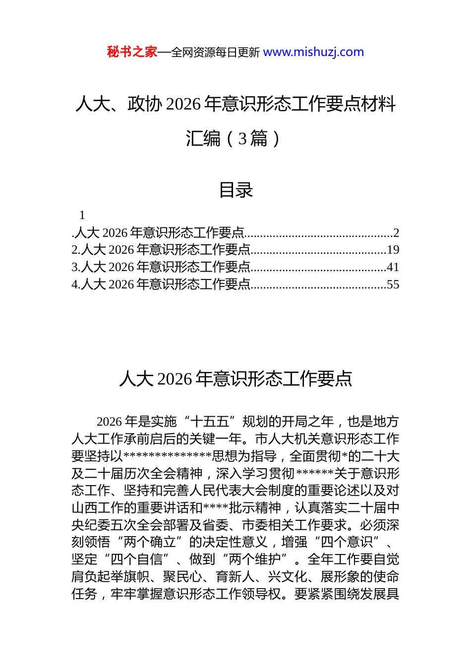 秘书之家—全网资源每日更新 www.mishuzj.com人大、政协 2026 年意识形态工作要点材料汇编(3 篇)目录1.人大 2026 年意识形态工作要点...............................................22.人大 2026 年意识形态工作要点...........................................193.人大 2026 年意识形态工作要点...........................................414.人大 2026 年意识形态工作要点...........................................55人大 2026 年意识形态工作要点2026 年是实施“十五五”规划的开局之年,也是地方人大工作承前启后的关键一年。市人大机关意识形态工作要坚持以**************思想为指导,全面贯彻*的二十大及二十届历次全会精神,深入学习贯彻******关于意识形态工作、坚持和完善人民代表大会制度的重要论述以及对山西工作的重要讲话和****批示精神,认真落实二十届中央纪委五次全会部署及省委、市委相关工作要求。必须深刻领悟“两个确立”的决定性意义,增强“四个意识”、坚定“四个自信”、做到“两个维护”。全年工作要自觉肩负起举旗帜、聚民心、育新人、兴文化、展形象的使命任务,牢牢掌握意识形态工作领导权。要紧紧围绕发展具秘书之家—全网资源每日更新 www.mishuzj.com有强大思想引领力、精神凝聚力、价值感召力的社会主义文化这一目标,将意识形态工作要求深度融入人大立法、监督、决定、任免、代表等各项履职实践的全过程、各方面。必须严格落实意识形态工作责任制,管好用好各类意识形态阵地,有效防范化解风险挑战,为市人大及其常委会依法高效履职、深入践行全过程人民民主提供坚强思想保证、强大精神力量和有利舆论环境。一、强化理论武装,筑牢履职思想根基坚持将用*的创新理论武装头脑作为首要政治任务,不断完善学习体系,创新学习方式,注重学用转化,引导机关全体*员干部和人大代表切实提高政治判断力、政治领悟力、政治执行力,夯实依法履职、服务大局的共同思想基础。1.深化“第一议题”制度的规范落实与效能拓展。机关*组会议、机关*委会议及各*支部委员会会议必须严格执行“第一议题”制度。学习内容要紧密跟进******最新重要讲话和****批示精神,特别是关于发展全过程人民民主、法治建设、国家治理体系和治理能力现代化等方面的重要论述,以及*中央、全国人大及省委、市委最新召开的重要会议精神和作出的重大决策部署。要坚决杜绝学习流于形式,每次学习前需精心准备,明确领学人和重点发言方向学习中要结合人大工作实际开展深入研讨,鼓励*员干部发表真知灼见,进行思想碰撞;学习后要形成贯彻落实的具体思路或任务清单,由相关责任委室跟踪督办,确保*的创新理论、中央大政方针和上级决策部署在市人大机关不折不扣落地生根,切实将学习成效转化为谋划工作的思路、破解难题的办法和推动发展的实效。2.构建分层分类、精准滴灌的理论学习培训体系。针对机关领导干部、普通*员干部、人大代表及青年干部等不同群体特点,设计差异化、精准化的学习方案。机关*组理论学习中心组要发挥示范引领作用,全年围绕“中国式现代秘书之家—全网资源每日更新 www.mishuzj.com化与人大作为”、“新质生产力发展的法治保障”、“总体国家安全观下的风险防范”、“中华优秀传统法律文化的传承与发展”等重大主题开展专题学习研讨不少于 6 次,中心组成员需结合分管工作撰写高质量调研报告或理论文章。依托市委*校、干部网络学院等平台,举办市人大代表履职能力提升班和机关干部专题培训班,将意识形态工作作为必修课程。各*支部要利用“三会一课”、主题*日,采取“理论+业务”、“理论+案例”、“理论+实践”等模式,开展对象化、分众化的学习活动。建立青年理论学习小组,开展“读原著、学原文、悟原理”读书沙龙和“人大青年说”主题论坛,激发青年干部理论学习的主动性和创造性,培养理论宣传骨干后备力量。3.创新理论宣传宣讲的载体形式与话语体系。组建由常委会领导、专委会负责同志、理论功底扎实的代表和机关干部组成的“人大理论宣讲团”。宣讲活动要改变单向灌输模式,积极探索“互动式、研讨式、场景式”宣讲。利用代表联络...