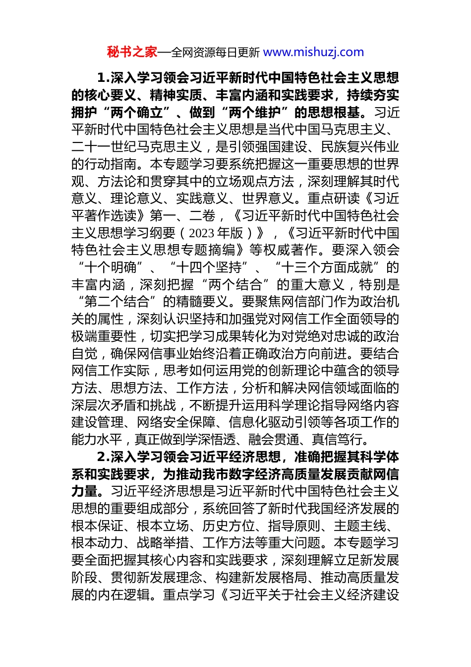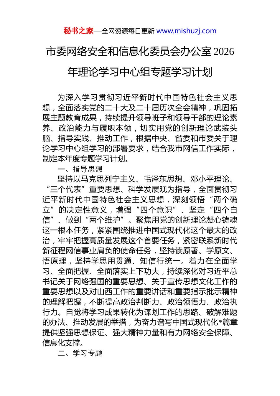 秘书之家—全网资源每日更新 www.mishuzj.com市委网络安全和信息化委员会办公室 2026年理论学习中心组专题学习计划为深入学习贯彻习近平新时代中国特色社会主义思想,全面落实党的二十大及二十届历次全会精神,巩固拓展主题教育成果,持续提升领导班子和领导干部的理论素养、政治能力与履职本领,切实用党的创新理论武装头脑、指导实践、推动工作,根据中央、省委和市委关于理论学习中心组学习的部署要求,结合我市网信工作实际,制定本年度专题学习计划。一、指导思想坚持以马克思列宁主义、毛泽东思想、邓小平理论、“三个代表”重要思想、科学发展观为指导,全面贯彻习近平新时代中国特色社会主义思想,深刻领悟“两个确立”的决定性意义,增强“四个意识”、坚定“四个自信”、做到“两个维护”。聚焦用党的创新理论凝心铸魂这一根本任务,紧紧围绕推进中国式现代化这个最大的政治,牢牢把握高质量发展这个首要任务,紧密联系新时代新征程网信事业肩负的使命任务,坚持读原著、学原文、悟原理,坚持学思用贯通、知信行统一。着力在全面学习、全面把握、全面落实上下功夫,持续深化对习近平总书记关于网络强国的重要思想、关于宣传思想文化工作的重要思想以及对山西工作的重要讲话和重要指示批示精神的理解把握,不断提高政治判断力、政治领悟力、政治执行力。自觉将学习成果转化为谋划工作的思路、破解难题的办法、推动发展的举措,为奋力谱写中国式现代化*篇章提供坚强思想保证、强大精神力量和有力网络安全保障、信息化支撑。二、学习专题秘书之家—全网资源每日更新 www.mishuzj.com1.深入学习领会习近平新时代中国特色社会主义思想的核心要义、精神实质、丰富内涵和实践要求,持续夯实拥护“两个确立”、做到“两个维护”的思想根基。习近平新时代中国特色社会主义思想是当代中国马克思主义、二十一世纪马克思主义,是引领强国建设、民族复兴伟业的行动指南。本专题学习要系统把握这一重要思想的世界观、方法论和贯穿其中的立场观点方法,深刻理解其时代意义、理论意义、实践意义、世界意义。重点研读《习近平著作选读》第一、二卷,《习近平新时代中国特色社会主义思想学习纲要(2023 年版)》,《习近平新时代中国特色社会主义思想专题摘编》等权威著作。要深入领会“十个明确”、“十四个坚持”、“十三个方面成就”的丰富内涵,深刻把握“两个结合”的重大意义,特别是“第二个结合”的精髓要义。要聚焦网信部门作为政治机关的属性,深刻认识坚持和加强党对网信工作全面领导的极端重要性,切实把学习成果转化为对党绝对忠诚的政治自觉,确保网信事业始终沿着正确政治方向前进。要结合网信工作实际,思考如何运用党的创新理论中蕴含的领导方法、思想方法、工作方法,分析和解决网信领域面临的深层次矛盾和挑战,不断提升运用科学理论指导网络内容建设管理、网络安全保障、信息化驱动引领等各项工作的能力水平,真正做到学深悟透、融会贯通、真信笃行。2.深入学习领会习近平经济思想,准确把握其科学体系和实践要求,为推动我市数字经济高质量发展贡献网信力量。习近平经济思想是习近平新时代中国特色社会主义思想的重要组成部分,系统回答了新时代我国经济发展的根本保证、根本立场、历史方位、指导原则、主题主线、根本动力、战略举措、工作方法等重大问题。本专题学习要全面把握其核心内容和实践要求,深刻理解立足新发展阶段、贯彻新发展理念、构建新发展格局、推动高质量发展的内在逻辑。重点学习《习近平关于社会主义经济建设秘书之家—全网资源每日更新 www.mishuzj.com论述摘编》、《习近平经济思想学习纲要》以及习近平总书记关于发展新质生产力、扎实推进高质量发展的重要论述。要深刻认识数字经济作为继农业经济、工业经济之后的主要经济形态,是推动高质量发展的新动能、新引擎。要立足网信部门职能,深入研究数字技术与实体经济深度融合的路径,思考如何统筹发展和安全,优化数字经济发展环境,推动数据要素价值释放,促进平台经济规范健康持续发展。要结合我市实际,探讨网信办在参与制定数字经济政策、推动数字产业化和产业数字化、培育数字生态、加...