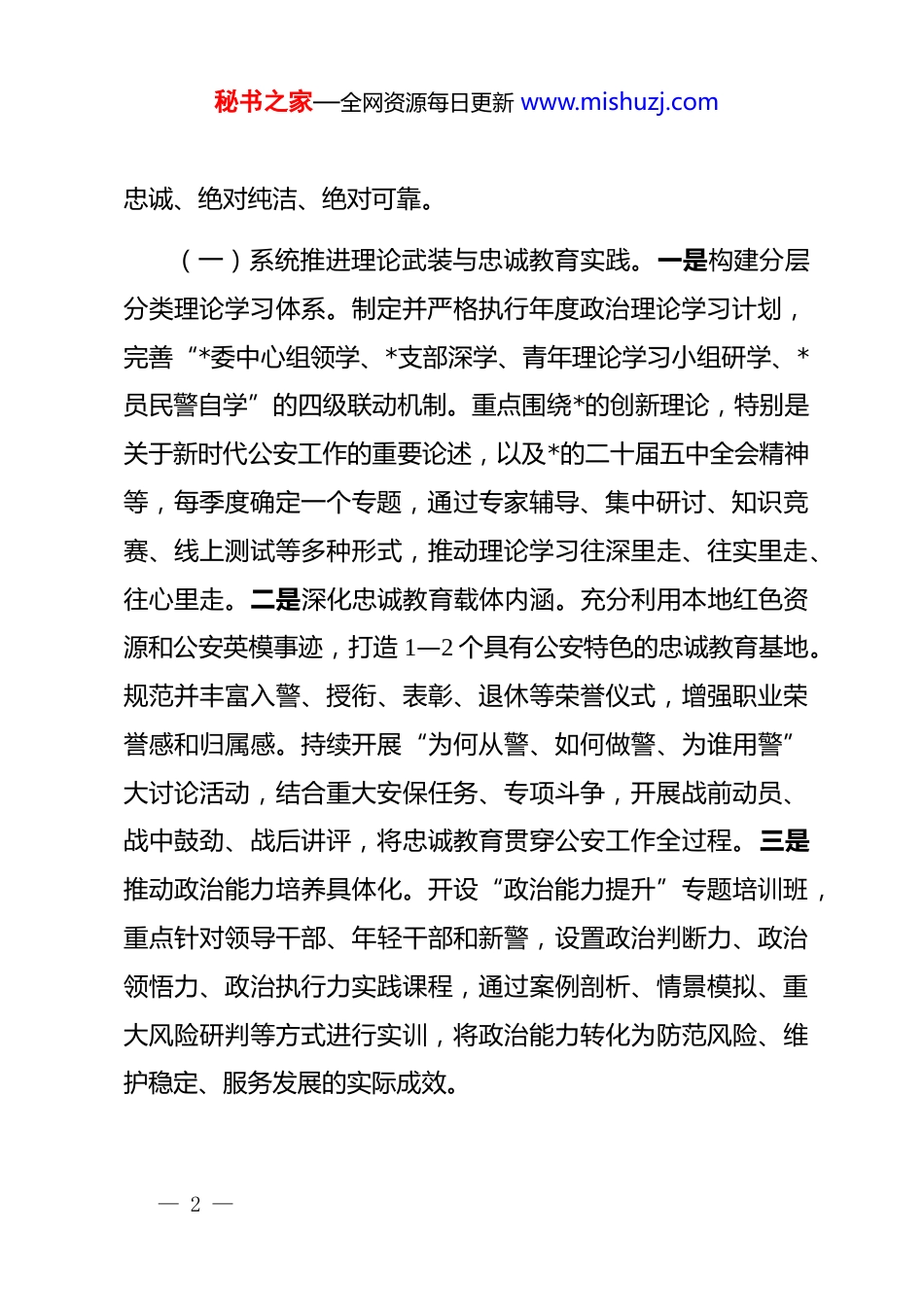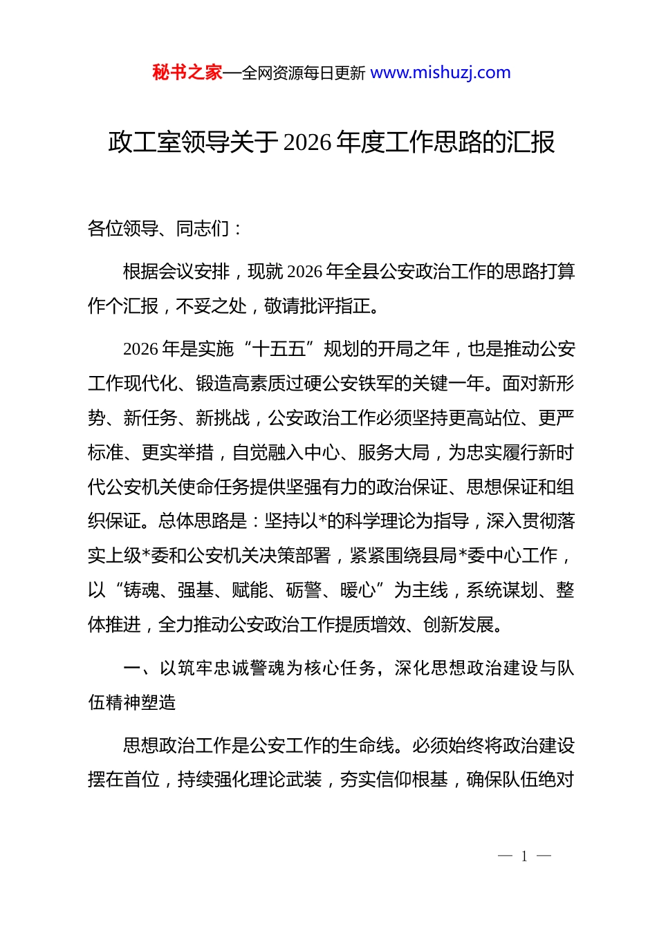 秘书之家—全网资源每日更新 www.mishuzj.com政工室领导关于 2026 年度工作思路的汇报各位领导、同志们:根据会议安排,现就 2026 年全县公安政治工作的思路打算作个汇报,不妥之处,敬请批评指正。2026 年是实施“十五五”规划的开局之年,也是推动公安工作现代化、锻造高素质过硬公安铁军的关键一年。面对新形势、新任务、新挑战,公安政治工作必须坚持更高站位、更严标准、更实举措,自觉融入中心、服务大局,为忠实履行新时代公安机关使命任务提供坚强有力的政治保证、思想保证和组织保证。总体思路是:坚持以*的科学理论为指导,深入贯彻落实上级*委和公安机关决策部署,紧紧围绕县局*委中心工作,以“铸魂、强基、赋能、砺警、暖心”为主线,系统谋划、整体推进,全力推动公安政治工作提质增效、创新发展。一、以筑牢忠诚警魂为核心任务,深化思想政治建设与队伍精神塑造思想政治工作是公安工作的生命线。必须始终将政治建设摆在首位,持续强化理论武装,夯实信仰根基,确保队伍绝对— 1 —秘书之家—全网资源每日更新 www.mishuzj.com忠诚、绝对纯洁、绝对可靠。(一)系统推进理论武装与忠诚教育实践。一是构建分层分类理论学习体系。制定并严格执行年度政治理论学习计划,完善“*委中心组领学、*支部深学、青年理论学习小组研学、*员民警自学”的四级联动机制。重点围绕*的创新理论,特别是关于新时代公安工作的重要论述,以及*的二十届五中全会精神等,每季度确定一个专题,通过专家辅导、集中研讨、知识竞赛、线上测试等多种形式,推动理论学习往深里走、往实里走、往心里走。二是深化忠诚教育载体内涵。充分利用本地红色资源和公安英模事迹,打造 1—2 个具有公安特色的忠诚教育基地。规范并丰富入警、授衔、表彰、退休等荣誉仪式,增强职业荣誉感和归属感。持续开展“为何从警、如何做警、为谁用警”大讨论活动,结合重大安保任务、专项斗争,开展战前动员、战中鼓劲、战后讲评,将忠诚教育贯穿公安工作全过程。三是推动政治能力培养具体化。开设“政治能力提升”专题培训班,重点针对领导干部、年轻干部和新警,设置政治判断力、政治领悟力、政治执行力实践课程,通过案例剖析、情景模拟、重大风险研判等方式进行实训,将政治能力转化为防范风险、维护稳定、服务发展的实际成效。— 2 —秘书之家—全网资源每日更新 www.mishuzj.com(二)全面加强基层*组织规范化、品牌化建设。一是实施*支部“强基提质”工程。在全面达标的基础上,开展“最强*支部”评选创建活动,制定动态评价标准,重点考察支部在服务中心工作、攻坚急难险重任务、凝聚警心警力等方面的作用发挥。年内力争新增 3—5 个市级以上示范*支部。优化*组织设置,确保在专案组、专项行动、一线执勤单元实现*的组织和工作全覆盖。严格落实“三会一课”、组织生活会、民主评议*员、谈心谈话等制度,提升组织生活质效。二是打造“一支部一品牌”特色 dj。鼓励各*支部结合警种职能、辖区特点,探索创建如“枫桥式派出所 dj 先锋”“智慧侦查红色引擎”“窗口服务微笑标兵”“社区警务连心桥”等特色 dj 品牌,推动 dj 工作与业务工作深度融合、相互促进。三是强化*员队伍教育管理。严把*员发展入口关,优化*员队伍结构,注重在基层一线、实战单位、青年骨干和“两新”群体(新业态、新就业群体关联领域)中发展*员。加强*员日常教育监督,引导*员在执法执勤、服务群众、应急处突中亮身份、当先锋、作表率。(三)创新开展公安特色精神文明创建活动。一是深化职业道德和职业精神培育。结合“中国人民警察节”等重要节点,大力宣传公安英模和身边典型的先进事迹,弘扬“忠诚、为民、— 3 —秘书之家—全网资源每日更新 www.mishuzj.com公正、廉洁”的人民警察核心价值观。组织开展“最美警察”“岗位能手”“警营工匠”等评选活动,营造崇尚荣誉、争先创优的浓厚氛围。二是拓展警营文化建设内涵。加强局史馆、荣誉室、警营文化长廊等阵地建设与管理,使其成为传承优良传统、激励警心斗志的重要平台。成立各类文体兴趣小组,定期举办文艺汇演、体育比赛、读书分享、书画摄影展等健康...
