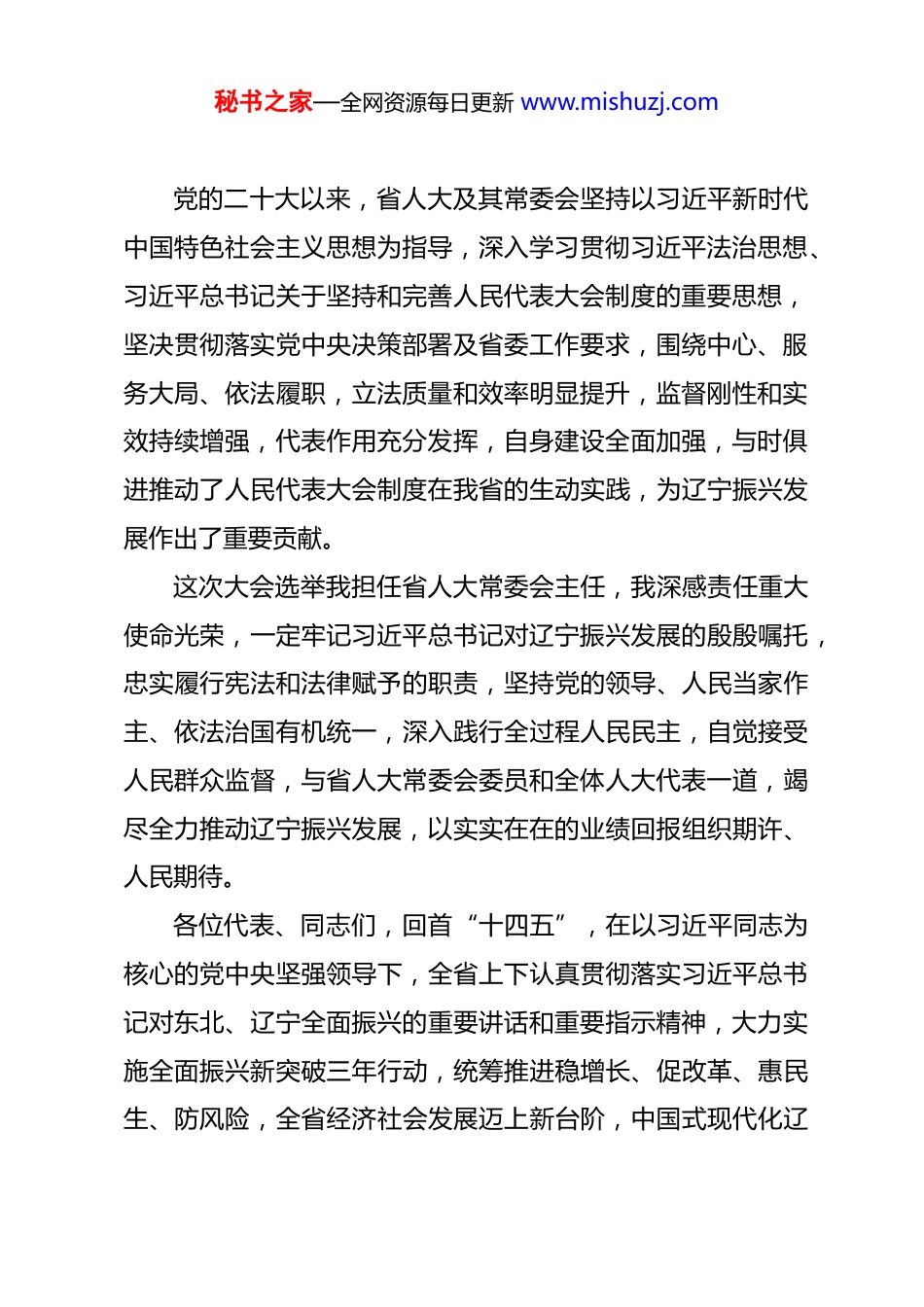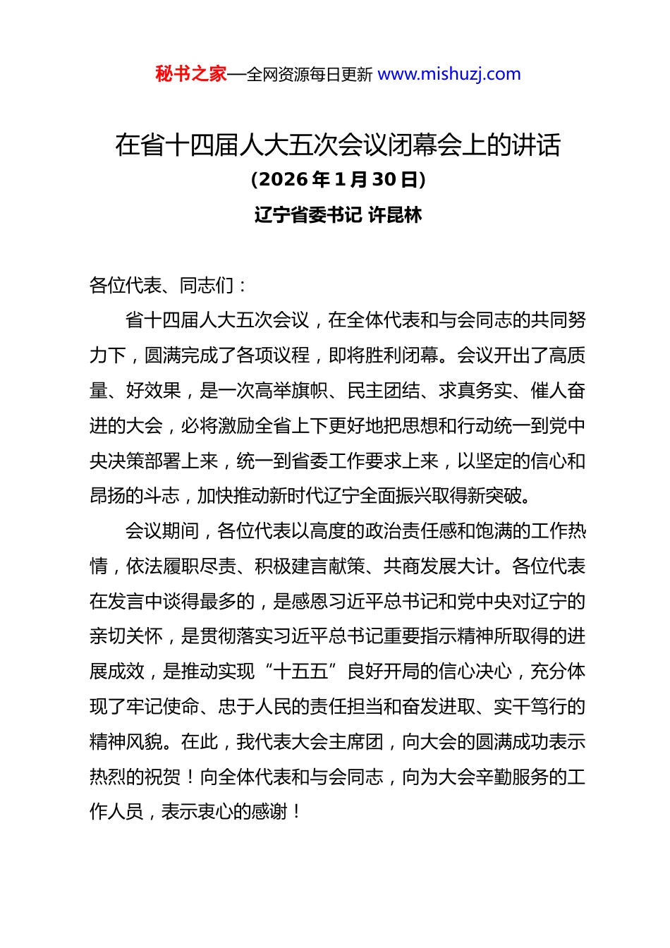 秘书之家—全网资源每日更新 www.mishuzj.com在省十四届人大五次会议闭幕会上的讲话(2026 年 1 月 30 日)辽宁省委书记 许昆林各位代表、同志们:省十四届人大五次会议,在全体代表和与会同志的共同努力下,圆满完成了各项议程,即将胜利闭幕。会议开出了高质量、好效果,是一次高举旗帜、民主团结、求真务实、催人奋进的大会,必将激励全省上下更好地把思想和行动统一到党中央决策部署上来,统一到省委工作要求上来,以坚定的信心和昂扬的斗志,加快推动新时代辽宁全面振兴取得新突破。会议期间,各位代表以高度的政治责任感和饱满的工作热情,依法履职尽责、积极建言献策、共商发展大计。各位代表在发言中谈得最多的,是感恩习近平总书记和党中央对辽宁的亲切关怀,是贯彻落实习近平总书记重要指示精神所取得的进展成效,是推动实现“十五五”良好开局的信心决心,充分体现了牢记使命、忠于人民的责任担当和奋发进取、实干笃行的精神风貌。在此,我代表大会主席团,向大会的圆满成功表示热烈的祝贺!向全体代表和与会同志,向为大会辛勤服务的工作人员,表示衷心的感谢!秘书之家—全网资源每日更新 www.mishuzj.com党的二十大以来,省人大及其常委会坚持以习近平新时代中国特色社会主义思想为指导,深入学习贯彻习近平法治思想、习近平总书记关于坚持和完善人民代表大会制度的重要思想,坚决贯彻落实党中央决策部署及省委工作要求,围绕中心、服务大局、依法履职,立法质量和效率明显提升,监督刚性和实效持续增强,代表作用充分发挥,自身建设全面加强,与时俱进推动了人民代表大会制度在我省的生动实践,为辽宁振兴发展作出了重要贡献。这次大会选举我担任省人大常委会主任,我深感责任重大使命光荣,一定牢记习近平总书记对辽宁振兴发展的殷殷嘱托,忠实履行宪法和法律赋予的职责,坚持党的领导、人民当家作主、依法治国有机统一,深入践行全过程人民民主,自觉接受人民群众监督,与省人大常委会委员和全体人大代表一道,竭尽全力推动辽宁振兴发展,以实实在在的业绩回报组织期许、人民期待。各位代表、同志们,回首“十四五”,在以习近平同志为核心的党中央坚强领导下,全省上下认真贯彻落实习近平总书记对东北、辽宁全面振兴的重要讲话和重要指示精神,大力实施全面振兴新突破三年行动,统筹推进稳增长、促改革、惠民生、防风险,全省经济社会发展迈上新台阶,中国式现代化辽秘书之家—全网资源每日更新 www.mishuzj.com宁实践不断向前、稳步推进。这些成绩的取得,根本在于以习近平同志为核心的党中央领航掌舵,在于习近平新时代中国特色社会主义思想科学指引,也是包括全体人大代表在内全省广大党员干部群众团结拼搏、奋力攻坚的结果。展望“十五五”,今后五年是辽宁加快实现新时代全面振兴夯实基础、全面发力的关键时期。夯实基础,就是要巩固拓展优势、破除瓶颈制约,重塑环境、强基固本,加快补齐营商环境、实体经济、科技创新、开放合作、本质安全等领域短板,补上打基础这一课,为高质量发展积蓄力量。全面发力,就是要抓住时间窗口,时不我待、奋起直追,推动经济社会发展各领域各方面协同发力,尽快跟上国家发展步伐,实现系统性突破、整体性提升,勇于争先、谱写新篇。今年是“十五五”开局之年,我们要坚定不移贯彻落实习近平总书记重要指示精神和党中央决策部署,锚定全年目标任务,全力以赴做好各项工作,务求取得实打实的成果,努力实现“十五五”良好开局,向习近平总书记和党中央、向全省人民交上合格答卷。实现“十五五”开好局、起好步,我们必须坚定不移沿着习近平总书记指引的方向奋勇前行。习近平总书记对辽宁振兴寄予厚望,每到关键节点、重要阶段,都亲自为辽宁振兴把脉定向、擘画蓝图、提出要求,饱含着对辽宁的深情厚爱和殷切秘书之家—全网资源每日更新 www.mishuzj.com期望。习近平总书记对辽宁的亲切关怀、大力支持,是我们办好辽宁事情的最大信心、最大底气。我们要更加深刻领悟“两个确立”的决定性意义,增强“四个意识”、坚定“四个自信”、做到“两个维护”,牢记嘱托、感恩奋进,把习近平总书记对辽宁振兴发展的重要讲话...