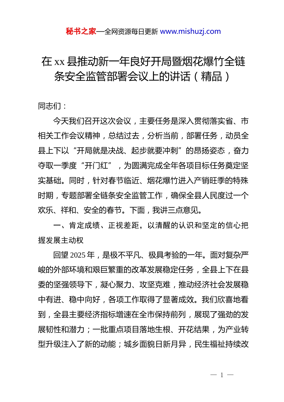 秘书之家—全网资源每日更新 www.mishuzj.com在 xx 县推动新一年良好开局暨烟花爆竹全链条安全监管部署会议上的讲话(精品)同志们:今天我们召开这次会议,主要任务是深入贯彻落实省、市相关工作会议精神,总结过去,分析当前,部署任务,动员全县上下以“开局就是决战、起步就要冲刺”的昂扬姿态,奋力夺取一季度“开门红”,为圆满完成全年各项目标任务奠定坚实基础。同时,针对春节临近、烟花爆竹进入产销旺季的特殊时期,专题部署全链条安全监管工作,确保全县人民度过一个欢乐、祥和、安全的春节。下面,我讲三点意见。一、肯定成绩、正视差距,以清醒的认识和坚定的信心把握发展主动权回望 2025 年,是极不平凡、极具考验的一年。面对复杂严峻的外部环境和艰巨繁重的改革发展稳定任务,全县上下在县委的坚强领导下,凝心聚力、攻坚克难,推动经济社会发展稳中有进、稳中向好,各项工作取得了显著成效。我们欣喜地看到,全县主要经济指标增速在全市保持前列,展现了强劲的发展韧性和潜力;一批重点项目落地生根、开花结果,为产业转型升级注入了新的动能;城乡面貌日新月异,民生福祉持续改— 1 —秘书之家—全网资源每日更新 www.mishuzj.com善,社会大局和谐稳定。这些成绩的取得,是全县广大干部群众团结拼搏、苦干实干的结果。在此,我代表县委、县政府,向奋战在各条战线上的同志们,表示衷心的感谢和崇高的敬意!在肯定成绩的同时,我们更要用辩证的、发展的眼光审视自身,清醒地看到前进道路上的困难和挑战。我们的经济增长基础仍需进一步加固,部分行业和企业仍然面临较大的下行压力;我们的产业结构优化升级任务依然艰巨,战略性新兴产业占比不高,传统产业的改造提升亟待加速;我们的项目建设在数量和质量上还有待提升,大项目、好项目储备不足,投资拉动的接续动能需要持续增强;我们的营商环境虽然持续优化,但在服务效率、要素保障等方面,与先进地区相比、与企业群众的期盼相比,还有不小的差距。认识问题是解决问题的前提。全县各级各部门必须保持“逆水行舟、不进则退”的危机感和“时我不待、只争朝夕”的紧迫感,决不能有丝毫的松懈和自满。我们要把困难估计得更充分一些,把问题分析得更透彻一些,把措施准备得更周全一些,切实增强开局奋进的责任感与精准性,以滚石上山的精神、抓铁有痕的劲头,推动新一年工作开好局、起好步。二、聚焦重点、精准发力,以务实的举措和过硬的作风推动一季度“开门红”— 2 —秘书之家—全网资源每日更新 www.mishuzj.com一年之计在于春,开局关系全局,起步决定后势。做好一季度经济工作,对于稳预期、强信心、促发展至关重要。各级各部门要迅速从“假期状态”切换到“工作状态”,紧紧围绕县委、县政府的决策部署,不折不扣抓好落实,全力以赴推动经济实现质的有效提升和量的合理增长。第一,要全力稳住工业“压舱石”,筑牢经济增长的坚实支撑。工业是县域经济的脊梁。没有强大的工业,就没有坚实的经济基础。一要强化运行监测。要建立健全重点行业、骨干企业和“小升规”培育对象的常态化监测调度机制,密切跟踪生产、用电、订单、效益等关键指标,做到心中有数、手中有策。对运行平稳、增长较快的企业,要送政策、送服务,鼓励其开足马力、扩大产能;对面临困难的企业,要深入一线,“一企一策”精准帮扶,切实解决企业在用工、融资、物流等方面的实际困难,助力企业纾困增效、稳产增产。二要驱动创新引擎。要大力引导和支持企业实施技术改造和设备更新,推动传统产业向高端化、智能化、绿色化方向转型。要鼓励企业加大研发投入,建立研发中心,与高校、科研院所开展产学研合作,突破一批关键核心技术,培育一批具有核心竞争力的新产品。三要优化要素保障。发改、科工、自然资源、金融等部门要主动靠前服务,在土地供应、能耗指标、资金支持等方面— 3 —秘书之家—全网资源每日更新 www.mishuzj.com给予重点倾斜,确保工业发展的要素供给充足、高效。第二,要奋力拉动投资“主引擎”,积蓄高质量发展的强大后劲。项目建设是经济工作的生命线,是拉动经济增长最直接、最有效的手段。一要狠抓项目谋划储...