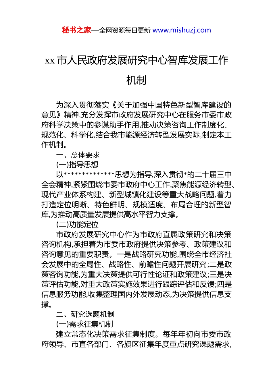 秘书之家—全网资源每日更新 www.mishuzj.comxx 市人民政府发展研究中心智库发展工作机制为深入贯彻落实《关于加强中国特色新型智库建设的意见》精神,充分发挥市政府发展研究中心在服务市委市政府科学决策中的参谋助手作用,推动决策咨询工作制度化、规范化、科学化,结合我市能源经济转型发展实际,制定本工作机制。一、总体要求(一)指导思想以**************思想为指导,深入贯彻*的二十届三中全会精神,紧紧围绕市委市政府中心工作,聚焦能源经济转型、现代产业体系构建、新型城镇化建设等重大战略问题,着力打造定位明晰、特色鲜明、规模适度、布局合理的新型智库,为推动高质量发展提供高水平智力支撑。(二)功能定位市政府发展研究中心作为市政府直属政策研究和决策咨询机构,承担着为市委市政府提供决策参考、政策建议和咨询意见的重要职责。一是战略研究功能,围绕全市经济社会发展中的全局性、战略性、前瞻性问题开展研究;二是政策咨询功能,为重大决策提供可行性论证和政策建议;三是决策评估功能,对重大政策实施效果进行跟踪评估和反馈;四是信息服务功能,收集整理国内外发展动态,为决策提供信息支撑。二、研究选题机制(一)需求征集机制建立常态化决策需求征集制度。每年年初向市委市政府领导、市直各部门、各旗区征集年度重点研究课题需求,秘书之家—全网资源每日更新 www.mishuzj.com形成年度课题指南。对于临时性、紧迫性的决策需求,建立快速响应机制,确保研究工作及时跟进。围绕能源产业转型升级、煤化工产业链延伸、新能源开发利用、生态环境保护、城乡融合发展等重点领域,主动谋划前瞻性研究选题。(二)选题论证机制建立选题论证评审制度。对征集到的课题需求进行筛选整合,组织专家进行可行性论证,从研究价值、紧迫程度、可操作性等方面进行综合评估。重大课题报分管领导审定后列入年度研究计划。建立动态调整机制,根据市委市政府阶段性工作重点和突发性政策需求,及时调整研究选题。(三)课题分类管理机制按照研究内容和时限要求,将课题分为三类进行管理。一是重大战略课题,主要围绕“十五五”规划编制、能源转型战略、产业布局优化等开展中长期研究,研究周期一般为 6至 12 个月。二是年度重点课题,围绕年度重点工作任务开展专题研究,研究周期一般为 3 至 6 个月。三是应急咨询课题,针对突发性、临时性决策需求开展快速研究,一般在 1 个月内完成。三、调查研究机制(一)调研统筹机制建立年度调研计划制度,年初制定调研工作方案,明确调研主题、调研对象、时间安排和预期成果。坚持问题导向,深入基层一线、企业车间、项目现场开展实地调研,确保研究接地气、有实效。建立调研联动机制,加强与市直部门、旗区的协调配合,整合调研资源,避免重复调研、多头调研。(二)蹲点调研机制建立定点联系和蹲点调研制度,在全市范围内选择若干具有代表性的旗区、园区、企业作为固定调研联系点,定期开展蹲点调研,跟踪了解基层发展动态和政策落实情况。围绕能源化工产业集群、新能源产业基地等重点领域,建立专题调研基地,为深度研究提供一手素材。秘书之家—全网资源每日更新 www.mishuzj.com(三)协同调研机制建立内外协同调研机制,加强与高校、科研院所、行业智库的合作,联合开展重大课题调研。对于涉及多部门、跨领域的复杂问题,组建联合调研组,整合各方力量协同攻关。积极开展对标调研,学习借鉴先进地区在能源转型、产业升级等方面的成功经验和有效做法。四、成果报送机制(一)成果质量审核机制建立研究成果内部审核制度,实行课题组自审、科室负责人复审、分管领导终审的三级审核机制。重点审核研究成果的政治方向、事实依据、逻辑论证、对策建议等内容,确保成果质量。对于重大战略课题研究成果,组织专家进行评审论证,提高成果的科学性和可行性。(二)成果分类报送机制建立多层次、多渠道的成果报送体系。一是《决策参考》,主要刊载重大战略问题研究成果和重要政策建议,报送市委市政府主要领导参阅。二是《调研报告》,主要刊载专题调研成果和工作建议,报送分管领导和相关部门参阅。三是《信息专报》,主要刊载国内外发展动态、政策信息和热点分析,供领导及时掌握相关情况。四是应急咨询报告...
