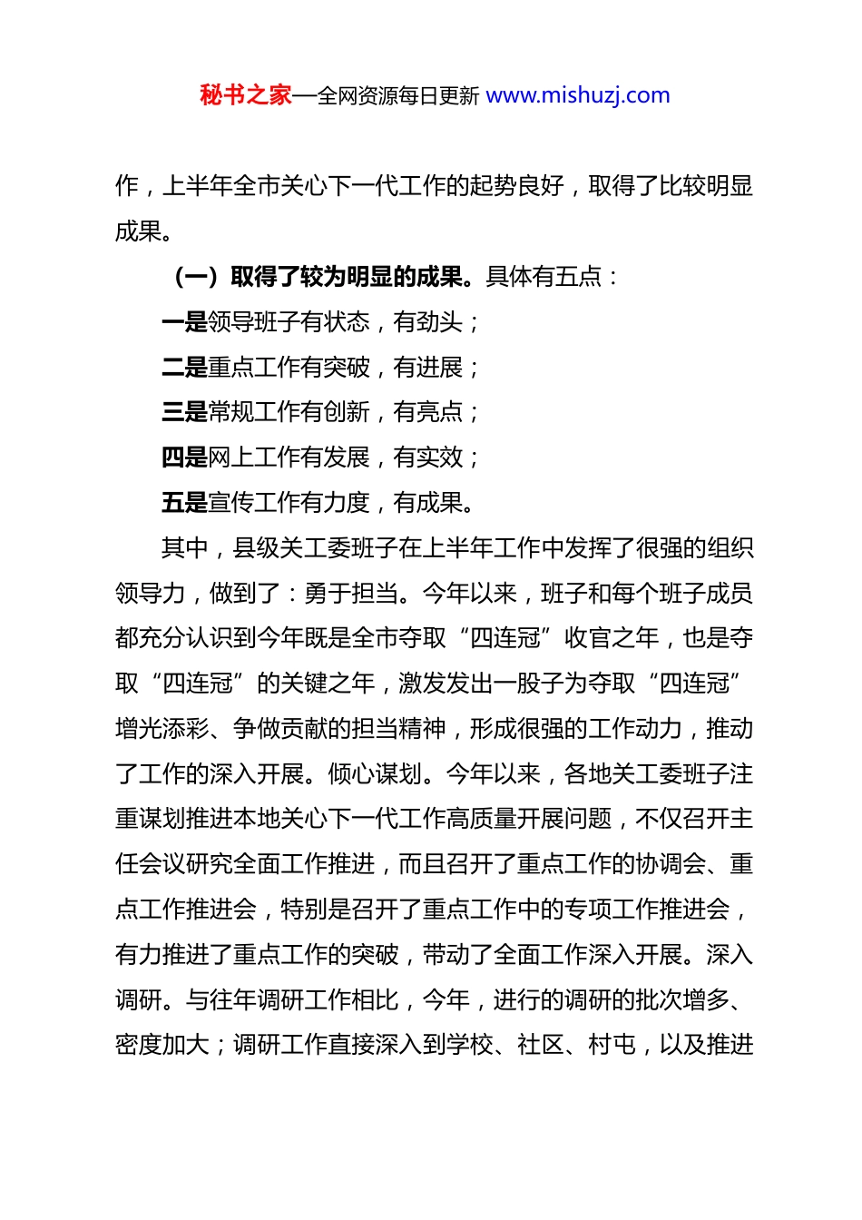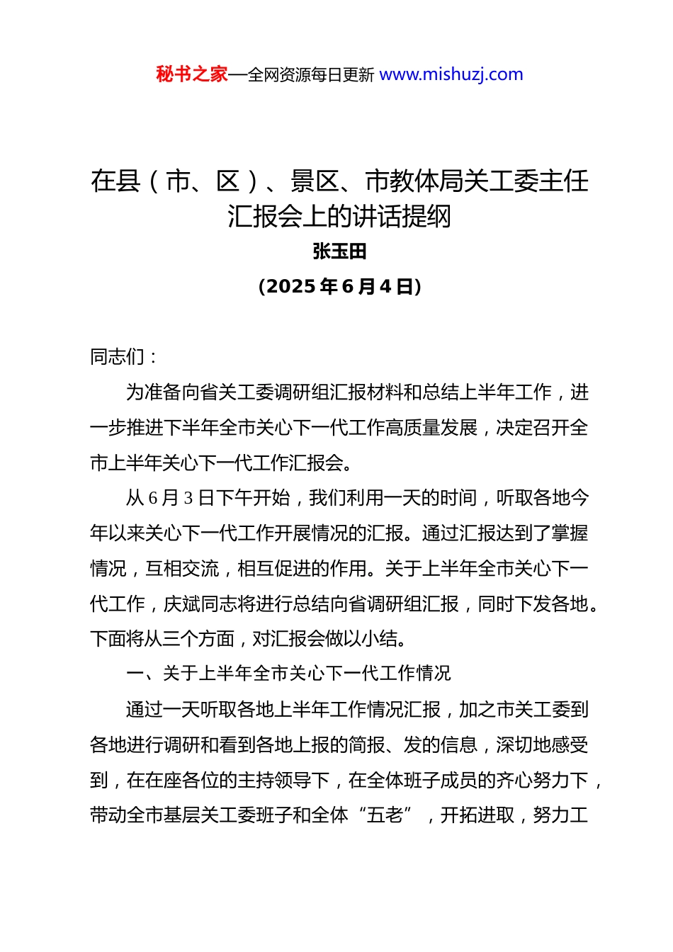 秘书之家—全网资源每日更新 www.mishuzj.com在县(市、区)、景区、市教体局关工委主任汇报会上的讲话提纲张玉田(2025 年 6 月 4 日)同志们:为准备向省关工委调研组汇报材料和总结上半年工作,进一步推进下半年全市关心下一代工作高质量发展,决定召开全市上半年关心下一代工作汇报会。从 6 月 3 日下午开始,我们利用一天的时间,听取各地今年以来关心下一代工作开展情况的汇报。通过汇报达到了掌握情况,互相交流,相互促进的作用。关于上半年全市关心下一代工作,庆斌同志将进行总结向省调研组汇报,同时下发各地。下面将从三个方面,对汇报会做以小结。一、关于上半年全市关心下一代工作情况通过一天听取各地上半年工作情况汇报,加之市关工委到各地进行调研和看到各地上报的简报、发的信息,深切地感受到,在在座各位的主持领导下,在全体班子成员的齐心努力下,带动全市基层关工委班子和全体“五老”,开拓进取,努力工秘书之家—全网资源每日更新 www.mishuzj.com作,上半年全市关心下一代工作的起势良好,取得了比较明显成果。(一)取得了较为明显的成果。具体有五点:一是领导班子有状态,有劲头;二是重点工作有突破,有进展;三是常规工作有创新,有亮点;四是网上工作有发展,有实效;五是宣传工作有力度,有成果。其中,县级关工委班子在上半年工作中发挥了很强的组织领导力,做到了:勇于担当。今年以来,班子和每个班子成员都充分认识到今年既是全市夺取“四连冠”收官之年,也是夺取“四连冠”的关键之年,激发发出一股子为夺取“四连冠”增光添彩、争做贡献的担当精神,形成很强的工作动力,推动了工作的深入开展。倾心谋划。今年以来,各地关工委班子注重谋划推进本地关心下一代工作高质量开展问题,不仅召开主任会议研究全面工作推进,而且召开了重点工作的协调会、重点工作推进会,特别是召开了重点工作中的专项工作推进会,有力推进了重点工作的突破,带动了全面工作深入开展。深入调研。与往年调研工作相比,今年,进行的调研的批次增多、密度加大;调研工作直接深入到学校、社区、村屯,以及推进秘书之家—全网资源每日更新 www.mishuzj.com重点工作的基层单位;从工作层面看,不仅调研全面工作,而且突出地加强重点工作、特别是重点工作的专项工作的调研,有力地推动了重点工作突破。精细指导。各地紧紧瞄准高质量发展、突破重点工作和推进关心下一代深入发展的目标,加强了指导工作,特别是加强了学校、社区、村屯和担负重点的基层工作的指导。做到了深入精细到位,有力地推进工作的全面深入开展。总体看,各地关工委班子对上半年工作抓的比较紧、抓的比较到位,抓的比较实,抓的成效比较突出。(二)创出多项亮点工作经市关工委主任会讨论认为,今年上半年的关工委工作,在大家的努力工作下,总体上看有突破、有特点、有创新、有亮点、有经验、有典型、不少工作上了新台阶。具体讲,在重点工作突破中,心理健康、家校社一体化育人工作和“两站两室”取得的成效较为显著。在突破重点工作中做到:一是领导十分重视;二是活动的声势大;三是参与活动的面广;四是活动的形式多样;五是取得的效果较好。心理健康工作,省关工委分管学校工作的副主任贾杰在全省培训的讲课材料中肯定了黑河的这项工作。同时省关工委学校组来人到黑河专题调研心理健康工作开展情况。全市的中华魂读书活动,省关工委学校秘书之家—全网资源每日更新 www.mishuzj.com组给予充分肯定,同意上报省关工委待批为中关工委先进单位。从各地看:北安,“两站两室”工作比较突出,特别突出的是,一是解决了“两站两室”五老补贴列入市财政预算;二是“两站两室”建立后的工作开展的比较好。经市关工委上报省关工委同意,北安市关工委在省关工委 8 月份召开的“两站两室”建设工作经验交流会上发言。五大连池市,抗日精神进校园工作开展的比较突出,到今年已开展了三个年头了,上半年为纪念抗日战争胜利 80 周年又开展了不少活动。五市关工委已总结了这方面工作的做法经验,上报市关工委。风景区,经过市关工委和景区关工委共同运作,风景区提出的进京的愿望实现了。...