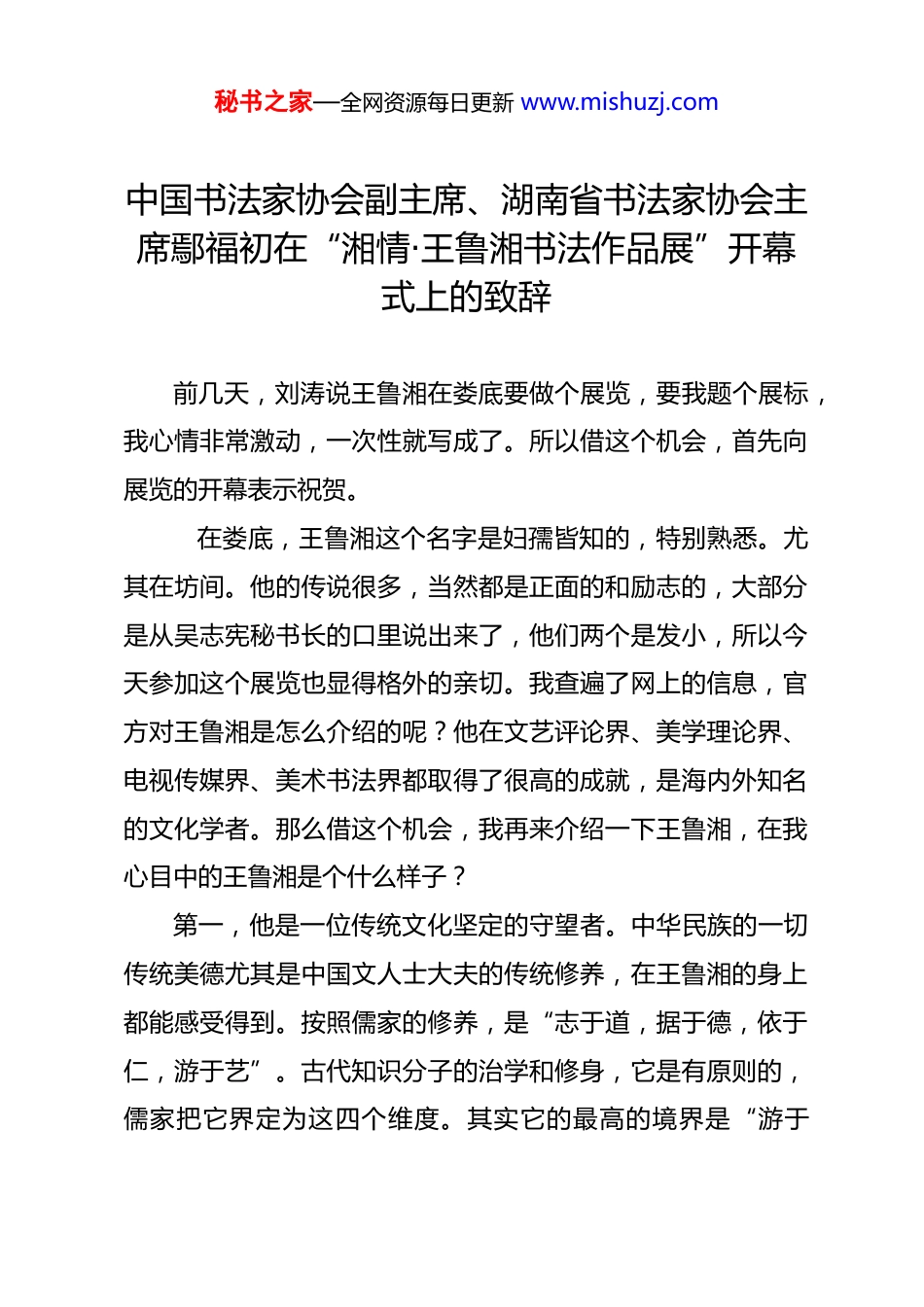 秘书之家—全网资源每日更新 www.mishuzj.com中国书法家协会副主席、湖南省书法家协会主席鄢福初在“湘情·王鲁湘书法作品展”开幕式上的致辞前几天,刘涛说王鲁湘在娄底要做个展览,要我题个展标,我心情非常激动,一次性就写成了。所以借这个机会,首先向展览的开幕表示祝贺。 在娄底,王鲁湘这个名字是妇孺皆知的,特别熟悉。尤其在坊间。他的传说很多,当然都是正面的和励志的,大部分是从吴志宪秘书长的口里说出来了,他们两个是发小,所以今天参加这个展览也显得格外的亲切。我查遍了网上的信息,官方对王鲁湘是怎么介绍的呢?他在文艺评论界、美学理论界、电视传媒界、美术书法界都取得了很高的成就,是海内外知名的文化学者。那么借这个机会,我再来介绍一下王鲁湘,在我心目中的王鲁湘是个什么样子?第一,他是一位传统文化坚定的守望者。中华民族的一切传统美德尤其是中国文人士大夫的传统修养,在王鲁湘的身上都能感受得到。按照儒家的修养,是“志于道,据于德,依于仁,游于艺”。古代知识分子的治学和修身,它是有原则的,儒家把它界定为这四个维度。其实它的最高的境界是“游于秘书之家—全网资源每日更新 www.mishuzj.com艺”。关于对传统文化的守护,他是一个守护者,更是一个布道者。文化的传承需要一代一代的人接续努力传播。所以鲁湘在这方面做出了很大的贡献。第二个印象,他是现当代文化高端的推动者。大家都知道他是从一个书斋走出的文人。从一个文人向社会学者的转换,他做了很多的探索。尤其是依靠现代传媒手段,对当代社会生活的变迁、对美学的追求,他有很多深层次的体验,往往在一些平凡的生活细节里能够感受到他对人性本体的认知、对社会复杂的解读、对审美的重构是非常有思想高度的。第三个概念,他还是一个湖湘文化的虔诚的耕耘者。无论湘军文化、还是古梅山文化,还是现在所提出的涟水文化,都属于湖湘文化的大范畴。这个文化的基因是值得研究的。那么在王鲁湘身中可以看到两点。第一,独立不迁,特立独行。梅山人很执着,一旦看准的事,很执着。我记得他的亲身经历,他是美学大师宗白华先生的学生。先生在弥留之际,遇到了一个很不愉快的事,他觉得社会太不公平,誓死要为文化留点尊严。这就体现了梅山个性。同时作为一个学者,在文风塑造上,人格塑造上,就深谙儒家文化的基本精神。曾国藩怎样践行无过不及、不激不厉这么一种军人的传统,所以他作为一个媒体人,不是以这种犀利的语言、独创的观点去吸引人。他更多的秘书之家—全网资源每日更新 www.mishuzj.com是从美学的层面,在主体和客体之间找到一种中和的人生理念,让所有的人都在美学的意境当中得到灵魂的洗礼。我对这一点感同身受。这也是梅山文化的骄傲、湖湘文化的光辉。当然很多优点今天也没法总结,人长得很帅气,成熟的女孩子看到他以后是扛不住的,很容易出现精神漂移。在这样的场合呢,我们也不调侃他了。我们回到正道,说说他的书法。我清早起来,9:28 就赶到了娄底,主要是在讲话之前我要先拜读他的新作,看了以后我没有跟他做过多的交流,一直在思考。我也总结了三点。第一,敬畏传统。在他笔法的点画之间、结字之间,能够看到魏晋风度、能感受到大师的风采,也还有清代何绍基的影子。当然,大家还在议论,说他的篆书、铭文写的不错,当然就更加高古。按照孙过庭的说法是“翰不虚动,下笔有由”,中国书法讲究的是来自于经典。所以,鲁湘的展览在这个方面下了很深的功夫,这是作为一个文人应该的修炼。其实书法是中国士大夫修养当中的一个必须,是一个日常,是一种生活方式。今天我们来做展览,古代没有这个展览一说,也没有专业书法家,他就是文人这个自己的功课。怎么做?当然是来自于传统。第二,抒写性灵。书法的最高境界是书为心生、境由心造。秘书之家—全网资源每日更新 www.mishuzj.com当代书法发展到今天,可能在技术层面、技法层面已经超越了很多时代,但是从气息层面、精神层面还有很大差距。我们要呼唤文化学者关注书法,文人也希望借助笔墨之间的表达来抒写性灵,表达审美。我想鲁湘、尤其是我看到他那些比较随性的作品,一般的专业书法家要做这么大尺度...
