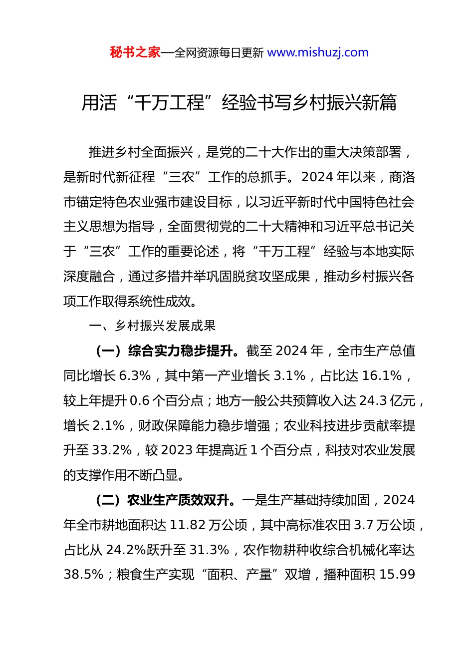 秘书之家—全网资源每日更新 www.mishuzj.com用活“千万工程”经验书写乡村振兴新篇推进乡村全面振兴,是党的二十大作出的重大决策部署,是新时代新征程“三农”工作的总抓手。2024 年以来,商洛市锚定特色农业强市建设目标,以习近平新时代中国特色社会主义思想为指导,全面贯彻党的二十大精神和习近平总书记关于“三农”工作的重要论述,将“千万工程”经验与本地实际深度融合,通过多措并举巩固脱贫攻坚成果,推动乡村振兴各项工作取得系统性成效。一、乡村振兴发展成果(一)综合实力稳步提升。截至 2024 年,全市生产总值同比增长 6.3%,其中第一产业增长 3.1%,占比达 16.1%,较上年提升 0.6 个百分点;地方一般公共预算收入达 24.3 亿元,增长 2.1%,财政保障能力稳步增强;农业科技进步贡献率提升至 33.2%,较 2023 年提高近 1 个百分点,科技对农业发展的支撑作用不断凸显。(二)农业生产质效双升。一是生产基础持续加固,2024年全市耕地面积达 11.82 万公顷,其中高标准农田 3.7 万公顷,占比从 24.2%跃升至 31.3%,农作物耕种收综合机械化率达38.5%;粮食生产实现“面积、产量”双增,播种面积 15.99秘书之家—全网资源每日更新 www.mishuzj.com万公顷、总产量 50.96 万吨,分别增长 0.2%和 0.8%。二是稳产保供成效显著,通过落实《商洛市生猪稳产保供十条措施》,肉类产量达 8.15 万吨,2.22 万亩供港蔬菜基地稳步发展,“菜篮子”考核获全省优秀。三是品牌建设亮点纷呈,“丹凤葡萄酒”获评“中华老字号”,“商洛香菇”“柞水木耳”分别拿下国内品牌商标和欧盟商标,品牌价值分别达 30亿元、53.23 亿元,全市绿色有机地理标志特优新农产品总量增至 196 个。(三)乡村环境宜业宜居。一是深入推进“千万工程”,启动建设市级重点村 100 个、秦岭山水乡村 300 个、和美镇区 86个,成功承办全省相关工作推进会。二是人居环境显著改善,2024 年农村自来水普及率 94.8%、畜禽粪污利用率 94.2%、生活污水治理管控率 66.6%,较上年提升 4.3 个百分点;农村卫生厕所普及率达 70.7%,提升 2.3 个百分点。三是基础设施日趋完善,通三级及以上公路乡镇占比 84.7%,较大人口规模自然村通硬化公路比例为 93.4%,行政村 5G 通达率 89.7%,分别较上年提升 1 个、8.3 个百分点,乡村生产生活便利性大幅提升。(四)乡风文明持续向好。一是农村公共文化服务体系不断健全,88.1%的村拥有体育健身场所,村综合文化服务中心秘书之家—全网资源每日更新 www.mishuzj.com覆盖率达 92.8%,71.3%的村成立农民业余文化组织,文化惠民实效显著。二是精神文明建设深入推进,通过移风易俗、倡导文明新风,省级及以上文明村镇占比从 2023 年的 20.4%提升至 2024 年的 23.5%,农民精神风貌焕然一新。(五)乡村治理和谐有序。强化农村基层党组织领导核心作用,构建自治、法治、德治“三治融合”治理体系,形成共建共治共享格局。治理能力稳步提升,村党支部书记大专及以上学历占比从 59.6%提高至 64.4%;法治建设持续深化,县级及以上民主法治示范村占比达 23.5%,有公共法律服务中心的村占比提升至 75.4%,乡村治理法治化、规范化水平不断提高。(六)民生福祉普惠殷实。一是农民收入稳步增长,2024年农村居民人均可支配收入达 14852 元,较上年增加 979 元、增长 7.1%;消费结构持续升级,农村居民汽车普及率达30.7%,提升 2.9 个百分点。二是公共服务保障增强,农村义务教育教师本科及以上学历占比达 95.2%,乡村医生中执业医师占比连续两年保持 20%以上,乡村教育医疗水平稳步提升。二、乡村振兴面临的挑战(一)产业基础薄弱,新型主体支撑不足。商洛市“八山一水一分田”的地理特征,导致耕地资源稀缺(人均仅 0.86秘书之家—全网资源每日更新 www.mishuzj.com亩)、机械化程度偏低,产业发展受自然条件制约明显。一是农业基础设施短板突出,高标准农田占比、耕种收综合机械化率与全省平均水平差距较大;粮食生产“靠天吃饭”,单产和效益偏低,自给率不足,稳产增产压力大。二是畜牧产业化水平不高,受...