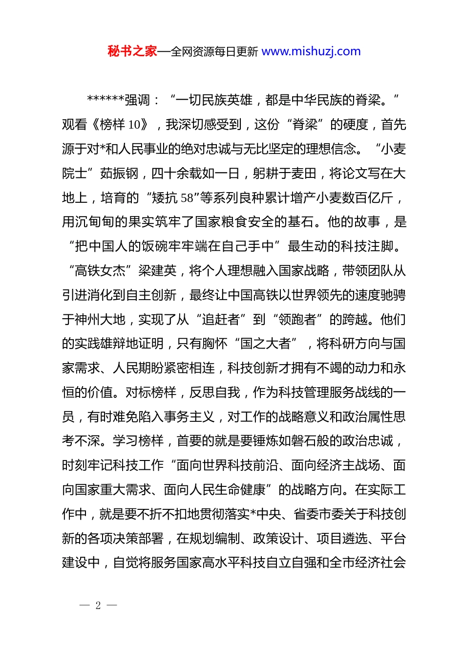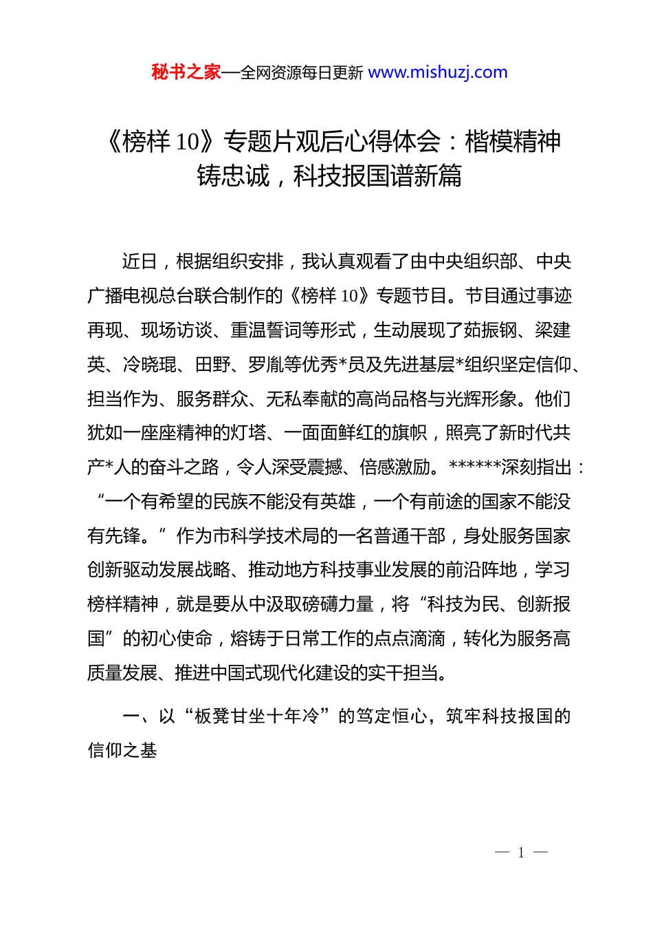 秘书之家—全网资源每日更新 www.mishuzj.com《榜样 10》专题片观后心得体会:楷模精神铸忠诚,科技报国谱新篇近日,根据组织安排,我认真观看了由中央组织部、中央广播电视总台联合制作的《榜样 10》专题节目。节目通过事迹再现、现场访谈、重温誓词等形式,生动展现了茹振钢、梁建英、冷晓琨、田野、罗胤等优秀*员及先进基层*组织坚定信仰、担当作为、服务群众、无私奉献的高尚品格与光辉形象。他们犹如一座座精神的灯塔、一面面鲜红的旗帜,照亮了新时代共产*人的奋斗之路,令人深受震撼、倍感激励。******深刻指出:“一个有希望的民族不能没有英雄,一个有前途的国家不能没有先锋。”作为市科学技术局的一名普通干部,身处服务国家创新驱动发展战略、推动地方科技事业发展的前沿阵地,学习榜样精神,就是要从中汲取磅礴力量,将“科技为民、创新报国”的初心使命,熔铸于日常工作的点点滴滴,转化为服务高质量发展、推进中国式现代化建设的实干担当。一、以“板凳甘坐十年冷”的笃定恒心,筑牢科技报国的信仰之基— 1 —秘书之家—全网资源每日更新 www.mishuzj.com******强调:“一切民族英雄,都是中华民族的脊梁。”观看《榜样 10》,我深切感受到,这份“脊梁”的硬度,首先源于对*和人民事业的绝对忠诚与无比坚定的理想信念。“小麦院士”茹振钢,四十余载如一日,躬耕于麦田,将论文写在大地上,培育的“矮抗 58”等系列良种累计增产小麦数百亿斤,用沉甸甸的果实筑牢了国家粮食安全的基石。他的故事,是“把中国人的饭碗牢牢端在自己手中”最生动的科技注脚。“高铁女杰”梁建英,将个人理想融入国家战略,带领团队从引进消化到自主创新,最终让中国高铁以世界领先的速度驰骋于神州大地,实现了从“追赶者”到“领跑者”的跨越。他们的实践雄辩地证明,只有胸怀“国之大者”,将科研方向与国家需求、人民期盼紧密相连,科技创新才拥有不竭的动力和永恒的价值。对标榜样,反思自我,作为科技管理服务战线的一员,有时难免陷入事务主义,对工作的战略意义和政治属性思考不深。学习榜样,首要的就是要锤炼如磐石般的政治忠诚,时刻牢记科技工作“面向世界科技前沿、面向经济主战场、面向国家重大需求、面向人民生命健康”的战略方向。在实际工作中,就是要不折不扣地贯彻落实*中央、省委市委关于科技创新的各项决策部署,在规划编制、政策设计、项目遴选、平台建设中,自觉将服务国家高水平科技自立自强和全市经济社会— 2 —秘书之家—全网资源每日更新 www.mishuzj.com高质量发展作为根本出发点和落脚点,确保科技管理工作始终沿着正确的政治方向前进。二、以“敢教日月换新天”的攻坚锐气,砥砺自主创新的奋进之志伟大事业孕育伟大精神,伟大精神引领伟大事业。《榜样10》中的先进典型,无一不是攻坚克难、敢为人先的典范。数学家田野,在被誉为“数论领域珠穆朗玛峰”的 bsd 猜想等国际前沿难题上取得重大突破,其成果被国际同行称为“田的突破”,彰显了中国基础研究的原始创新活力。青年创业者冷晓琨,在人形机器人这一全球竞争激烈的赛道上,立志打造“中国籍”机器人,带领团队从核心零部件依赖进口的困境中奋力突围,最终实现国产化率超过 90%,推动了我国在该领域的产业化进程。他们的奋斗历程,深刻诠释了“创新是引领发展的第一动力”,展现了新时代科技工作者“逢山开路、遇水架桥”的闯劲和“十年磨一剑”的韧劲。当前,我市正处在转型升级、跨越发展的关键时期,突破产业技术瓶颈、培育新质生产力的任务紧迫而艰巨。学习榜样的攻坚精神,就要求我们必须摆脱“路径依赖”和“惯性思维”,以“事不避难、义不逃责”的担当,投身于科技创新的主战场。具体而言,在服务企— 3 —秘书之家—全网资源每日更新 www.mishuzj.com业创新主体时,要更加积极主动地调研挖掘其“卡脖子”技术需求,精准对接高校院所创新资源;在组织科技攻关项目时,要勇于探索“揭榜挂帅”、“赛马”等新型组织模式,激发全社会创新潜能;在推动成果转化时,要着力破除体制性障碍,打通从“实验室”到“生产线”的“最后一公里”,让更多像田野、冷晓琨这样的创新成果...