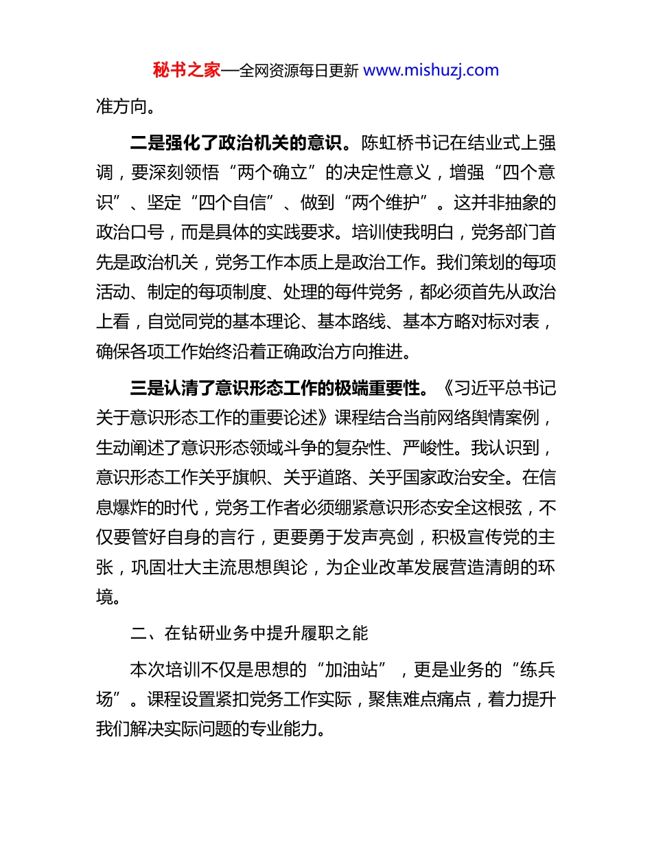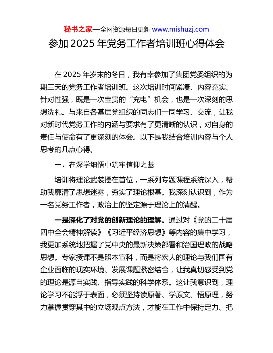 秘书之家—全网资源每日更新 www.mishuzj.com参加 2025 年党务工作者培训班心得体会在 2025 年岁末的冬日,我有幸参加了集团党委组织的为期三天的党务工作者培训班。这次培训时间紧凑、内容充实、针对性强,既是一次宝贵的“充电”机会,也是一次深刻的思想洗礼。与来自各基层党组织的同志们一同学习、交流,让我对新时代党务工作的内涵与要求有了更清晰的认识,对自身的责任与使命有了更深刻的体会。以下是我结合培训内容与个人思考的几点心得。一、在深学细悟中筑牢信仰之基培训将理论武装摆在首位,一系列专题课程系统深入,帮助我廓清了思想迷雾,夯实了理论根基。我深刻认识到,作为一名党务工作者,政治上的坚定源于理论上的清醒。一是深化了对党的创新理论的理解。通过对《党的二十届四中全会精神解读》《习近平经济思想》等内容的集中学习,我更加系统地把握了党中央的最新决策部署和治国理政的战略思想。专家授课不是照本宣科,而是将宏大的理论与我们国有企业面临的现实环境、发展课题紧密结合,让我真切感受到党的理论是源自实践、指导实践的科学体系。这让我意识到,理论学习不能浮于表面,必须坚持读原著、学原文、悟原理,努力掌握贯穿其中的立场观点方法,才能在工作中保持定力、把秘书之家—全网资源每日更新 www.mishuzj.com准方向。二是强化了政治机关的意识。陈虹桥书记在结业式上强调,要深刻领悟“两个确立”的决定性意义,增强“四个意识”、坚定“四个自信”、做到“两个维护”。这并非抽象的政治口号,而是具体的实践要求。培训使我明白,党务部门首先是政治机关,党务工作本质上是政治工作。我们策划的每项活动、制定的每项制度、处理的每件党务,都必须首先从政治上看,自觉同党的基本理论、基本路线、基本方略对标对表,确保各项工作始终沿着正确政治方向推进。三是认清了意识形态工作的极端重要性。《习近平总书记关于意识形态工作的重要论述》课程结合当前网络舆情案例,生动阐述了意识形态领域斗争的复杂性、严峻性。我认识到,意识形态工作关乎旗帜、关乎道路、关乎国家政治安全。在信息爆炸的时代,党务工作者必须绷紧意识形态安全这根弦,不仅要管好自身的言行,更要勇于发声亮剑,积极宣传党的主张,巩固壮大主流思想舆论,为企业改革发展营造清朗的环境。二、在钻研业务中提升履职之能本次培训不仅是思想的“加油站”,更是业务的“练兵场”。课程设置紧扣党务工作实际,聚焦难点痛点,着力提升我们解决实际问题的专业能力。秘书之家—全网资源每日更新 www.mishuzj.com一是系统掌握了党内法规制度。对《中国共产党国有企业基层组织工作条例(试行)》等党内法规的再学习,让我对基层党组织的职责定位、组织设置、运行机制等有了更精准的把握。过去一些模糊的认识得以澄清,一些凭经验的做法找到了明确的制度依据。这让我深切体会到,做好党务工作,必须成为熟悉规章的“政策通”、精通业务的“活字典”。只有把各项法规制度学懂弄通,工作才能规范有序,避免随意性。二是探索了党建业务融合的路径。培训始终贯穿“围绕中心抓党建、抓好党建促发展”的理念。课程引导我们思考,如何将党建工作融入公司治理、战略规划、生产经营、安全管理等各个环节。我认识到,党建与业务不是“两张皮”,不能各搞一套。高质量的党建,必然体现在推动企业攻克技术难关、完成重大任务、实现效益增长的实际成效上。未来,我需要更主动地研究业务,找准党建工作服务生产经营、凝聚职工群众的切入点和着力点,推动“党建强、业务强”的“双强”目标落地。三是增强了防范风险的本领。网络安全教育课程给我敲响了警钟。在数字化办公日益普及的今天,党务工作涉及大量内部信息,网络安全意识丝毫不能松懈。课程通过真实案例,讲解了常见网络攻击手段和防护措施,提升了我的风险辨识能力秘书之家—全网资源每日更新 www.mishuzj.com和应急处置意识。这启示我,党务工作者的能力素养是全面的,既要懂政治、懂业务,也要具备一定的现代管理知识和风险防控能力,才能应对复杂局面,守护好组织的安全防线。三、在反思自省中明晰前行之路培训是一次难得的静心思考、...
