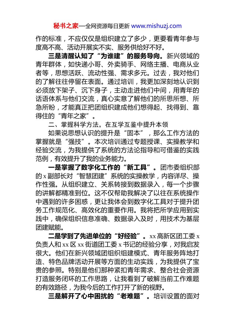 秘书之家—全网资源每日更新 www.mishuzj.com参加全市新兴领域团建工作培训班心得体会2025 年 12 月 22 日,我有幸参加了由团 xx 市委举办的全市新兴领域团建工作培训班。这次培训虽然时间不长,但内容丰富、节奏紧凑,让我深受启发、获益匪浅。面对新时代青年工作的新形势、新挑战,此次培训如同一场及时雨,为我廓清了思想迷雾,指明了前进方向,注入了强大动力。现将个人所学所思所悟总结如下。一、深化思想认识,在学思践悟中明确方向培训的首要收获,是思想认识上的再深化与再提高。通过系统学习,我对新兴领域团建工作的重大意义、目标任务和实践路径有了更为全面和深刻的理解,进一步增强了做好这项工作的责任感与使命感。一是深刻领会了“为何建”的战略意义。团省委组织部的 x 部长对全省典型案例的剖析,让我清醒地看到当前工作存在的短板与不足,也让我深刻认识到,推进新兴领域团的建设,不仅是团组织自身发展的内在要求,更是巩固和扩大*执政的青年群众基础的战略举措。市委社工部的 x主任关于 dj 带团建的系统讲解,让我明白了这项工作是*的工作的重要组成部分,必须提高政治站位,依托 dj 工作优势,推动*团组织同频共振,才能行稳致远。二是准确把握了“建成什么样”的核心标准。培训反复强调,要从“有形覆盖”向“有效覆盖”转变。这九个字对我触动很大,让我彻底走出了过去单纯追求建组织、挂牌子的思维定势。我认识到,一个有活力的团组织,绝不是“一套班子、一块牌子”的空架子,而是要真正成为能够吸引青年、凝聚青年、服务青年的坚强阵地。衡量工秘书之家—全网资源每日更新 www.mishuzj.com作的标准,不应仅仅是组织建立了多少,更要看青年参与度高不高、活动开展实不实、服务供给好不好。三是清醒认知了“为谁建”的服务导向。新兴领域的青年群体,如快递小哥、外卖骑手、网络主播、电商从业者等,思想活跃、流动性强、需求多元。过去,我对他们的了解往往停留在表面。通过培训,我更加深刻地认识到必须放下架子、沉下身子,主动走进他们中间,用青年的话语体系与他们交流,真心实意了解他们的所思所想、所急所盼,才能真正把团组织建成他们想得起、找得到、靠得住的“青年之家”。二、掌握科学方法,在互学互鉴中提升本领如果说思想认识的提升是“固本”,那么工作方法的掌握就是“强技”。本次培训通过专题授课、实操教学和经验交流,为我提供了系统的方法论指导和可借鉴的实践范例,有效提升了我的业务能力。一是掌握了数字化工作的“新工具”。团市委组织部的 x 副部长对“智慧团建”系统的实操教学,内容详尽、操作性强。从组织建立、关系转接到数据录入,每一个步骤的讲解都精准到位。这不仅帮助我解决了以往在系统操作中遇到的许多困惑,更让我体会到数字化工具对于提升团务工作规范化、高效化的重要作用。我将把所学应用到实践中,确保组织信息准确、数据录入及时,用技术为基层团建赋能。二是学到了先进单位的“好经验”。xx 高新区团工委 x负责人和 xx 区 xx 街道团工委 x 书记的经验分享,对我启发很大。他们在新兴领域团组织组建模式、青年服务阵地打造、特色品牌活动开展等方面的生动实践,为我提供了宝贵的参照。特别是他们那种紧扣青年需求、整合社会资源打造服务闭环的工作思路,让我看到了破解当前工作难题的有效路径,为我今后的工作打开了新的视野。三是解开了心中困扰的“老难题”。培训设置的面对秘书之家—全网资源每日更新 www.mishuzj.com面答疑互动环节,氛围热烈而真诚。我将在工作中遇到的关于建团模式创新、青年需求精准对接、长效机制构建等方面的困惑,都得到了授课专家的精准支招。专家们的解答既有理论高度,又有实践深度,让我茅塞顿开。这种“靶向治疗”式的解惑,让我对未来如何开展工作更有信心、更有底气。三、激发内生动力,在知行合一中挺膺担当学习的最终目的在于运用。培训结束后,我深感肩上责任重大,必须将所学所获转化为推动工作的实际成效,以知行合一的实际行动,在新兴领域这片广阔天地中展现新作为。一是工作思路上要实现从“被动”到“主动”的转变。我将立即对我所在区...