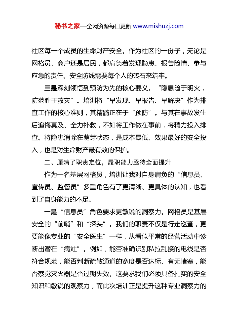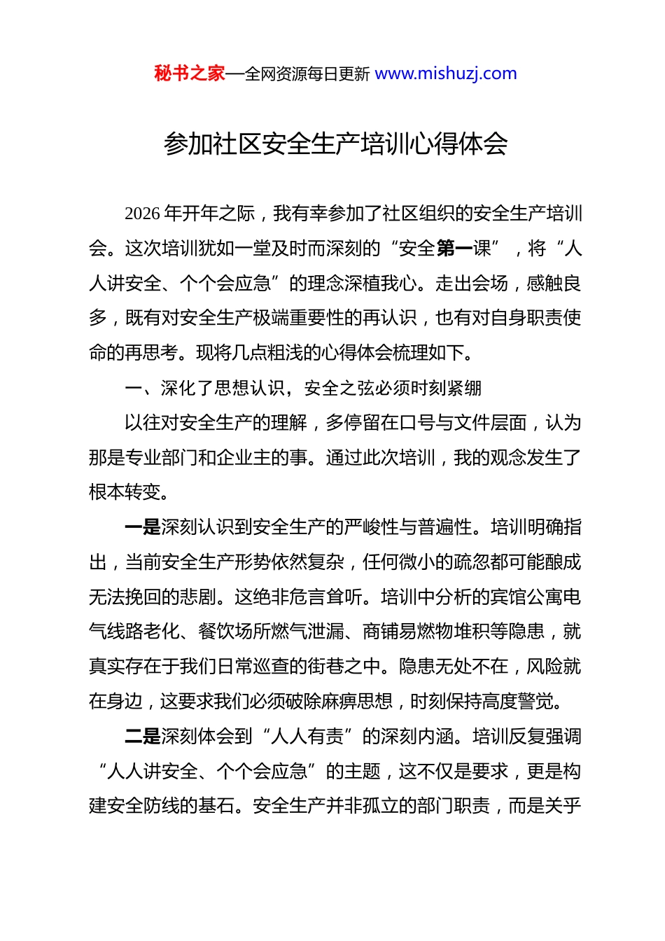 秘书之家—全网资源每日更新 www.mishuzj.com参加社区安全生产培训心得体会 2026 年开年之际,我有幸参加了社区组织的安全生产培训会。这次培训犹如一堂及时而深刻的“安全第一课”,将“人人讲安全、个个会应急”的理念深植我心。走出会场,感触良多,既有对安全生产极端重要性的再认识,也有对自身职责使命的再思考。现将几点粗浅的心得体会梳理如下。一、深化了思想认识,安全之弦必须时刻紧绷以往对安全生产的理解,多停留在口号与文件层面,认为那是专业部门和企业主的事。通过此次培训,我的观念发生了根本转变。一是深刻认识到安全生产的严峻性与普遍性。培训明确指出,当前安全生产形势依然复杂,任何微小的疏忽都可能酿成无法挽回的悲剧。这绝非危言耸听。培训中分析的宾馆公寓电气线路老化、餐饮场所燃气泄漏、商铺易燃物堆积等隐患,就真实存在于我们日常巡查的街巷之中。隐患无处不在,风险就在身边,这要求我们必须破除麻痹思想,时刻保持高度警觉。二是深刻体会到“人人有责”的深刻内涵。培训反复强调“人人讲安全、个个会应急”的主题,这不仅是要求,更是构建安全防线的基石。安全生产并非孤立的部门职责,而是关乎秘书之家—全网资源每日更新 www.mishuzj.com社区每一个成员的生命财产安全。作为社区的一份子,无论是网格员、商户还是居民,都肩负着发现隐患、报告险情、参与应急的责任。安全防线需要每个人的砖石来筑牢。三是深刻领悟到预防为先的核心要义。“隐患险于明火,防范胜于救灾”。培训将“早发现、早报告、早解决”作为排查工作的核心准则,其精髓正在于“预防”。与其在事故发生后追悔莫及、全力补救,不如将工作做在事前,将精力投入排查。将隐患消除在萌芽状态,是成本最低、效果最好的安全投入,也是对生命财产最有效的保护。二、厘清了职责定位,履职能力亟待全面提升作为一名基层网格员,培训让我对自身肩负的“信息员、宣传员、监督员”多重角色有了更清晰、更具体的认知,也看到了自身能力的不足。一是“信息员”角色要求更敏锐的洞察力。网格员是基层安全的“前哨”和“探头”。我们的职责不仅是行走巡查,更要能像专业的“安全医生”一样,从看似平常的经营活动中诊断出潜在“病灶”。例如,能否准确识别私拉乱接的电线是否符合规范,能否判断疏散通道的宽度是否达标、有无堵塞,能否察觉灭火器是否过期失效。这要求我们必须具备扎实的安全知识和敏锐的观察力,而此次培训正是提升这种专业洞察力的秘书之家—全网资源每日更新 www.mishuzj.com关键一步。二是“宣传员”角色要求更有效的沟通力。培训指出,要明确告知场所负责人其安全生产第一责任人的职责。这不仅是告知,更是一种宣传、动员和督促。如何将生硬的法律法规和标准要求,如《中华人民共和国消防法》、《机关、团体、企业、事业单位消防安全管理规定》中的要点,转化为商户听得懂、愿意听、记得住的语言?如何让他们从“要我安全”转变为“我要安全”?这考验着我们的沟通技巧和宣传艺术。培训中传授的“人走电断、定期检查、规范用火”等具体措施,就是很好的宣传切入点。三是“监督员”角色要求更坚定的原则性。安全检查难免会遇到不理解、不配合的情况。面对隐患,是碍于情面“睁一只眼闭一只眼”,还是坚持原则督促整改?培训强调了“坚决把隐患消除在萌芽状态”的决心。这要求我们在履职中必须秉持对生命负责、对社区负责的态度,敢于较真碰硬,严格督促整改,确保各项安全措施落到实处,协同商户共同筑牢安全防线。三、明晰了行动方向,知行合一贵在持之以恒培训的结束不是学习的终点,而是实践的开始。如何将所学所悟转化为日常工作的具体行动,是我接下来需要持续用力、久久为功的方向。秘书之家—全网资源每日更新 www.mishuzj.com一是将系统学习作为常态。一次培训无法穷尽所有安全知识。面对不断更新的安全技术和复杂的现实情况,我必须树立终身学习的理念。既要主动学习《建筑设计防火规范》等专业标准,也要关注最新的安全事故案例和防范指南,不断更新知识库,确保自身能力能够匹配安全监管的要求。只有自身“肚里有货”,巡查时才能“眼里有活”。二是将...