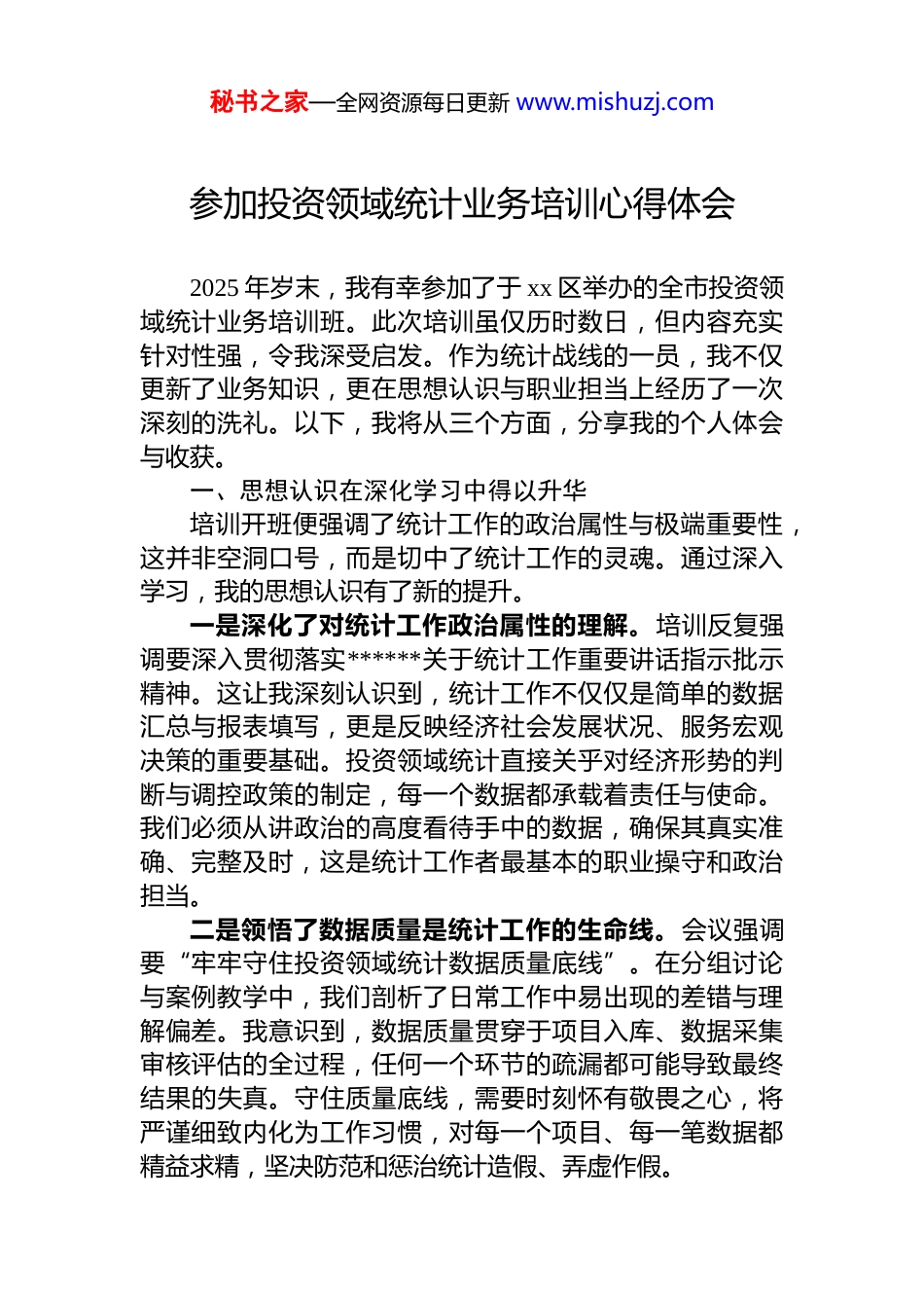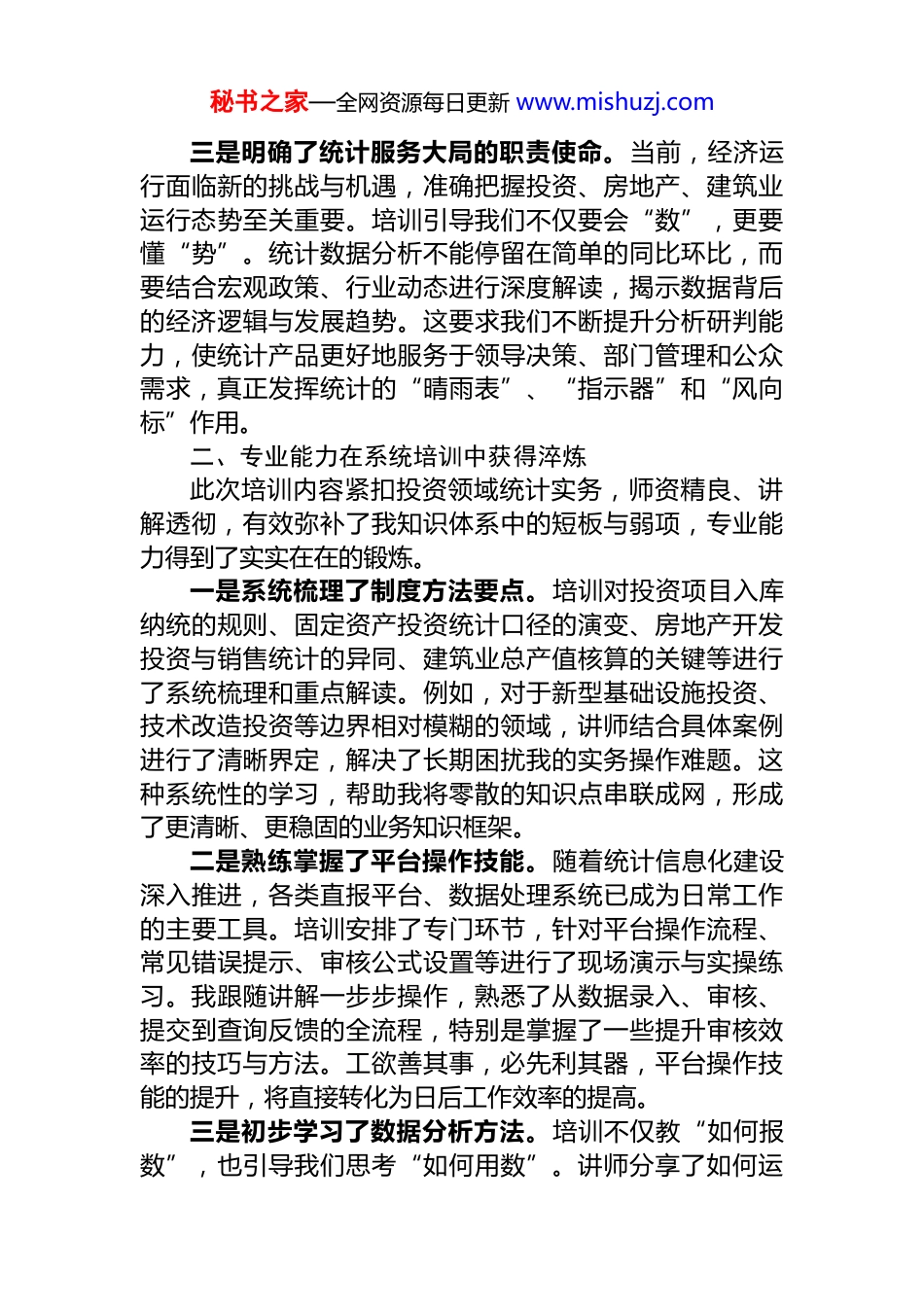 秘书之家—全网资源每日更新 www.mishuzj.com参加投资领域统计业务培训心得体会2025 年岁末,我有幸参加了于 xx 区举办的全市投资领域统计业务培训班。此次培训虽仅历时数日,但内容充实针对性强,令我深受启发。作为统计战线的一员,我不仅更新了业务知识,更在思想认识与职业担当上经历了一次深刻的洗礼。以下,我将从三个方面,分享我的个人体会与收获。一、思想认识在深化学习中得以升华培训开班便强调了统计工作的政治属性与极端重要性,这并非空洞口号,而是切中了统计工作的灵魂。通过深入学习,我的思想认识有了新的提升。一是深化了对统计工作政治属性的理解。培训反复强调要深入贯彻落实******关于统计工作重要讲话指示批示精神。这让我深刻认识到,统计工作不仅仅是简单的数据汇总与报表填写,更是反映经济社会发展状况、服务宏观决策的重要基础。投资领域统计直接关乎对经济形势的判断与调控政策的制定,每一个数据都承载着责任与使命。我们必须从讲政治的高度看待手中的数据,确保其真实准确、完整及时,这是统计工作者最基本的职业操守和政治担当。二是领悟了数据质量是统计工作的生命线。会议强调要“牢牢守住投资领域统计数据质量底线”。在分组讨论与案例教学中,我们剖析了日常工作中易出现的差错与理解偏差。我意识到,数据质量贯穿于项目入库、数据采集审核评估的全过程,任何一个环节的疏漏都可能导致最终结果的失真。守住质量底线,需要时刻怀有敬畏之心,将严谨细致内化为工作习惯,对每一个项目、每一笔数据都精益求精,坚决防范和惩治统计造假、弄虚作假。秘书之家—全网资源每日更新 www.mishuzj.com三是明确了统计服务大局的职责使命。当前,经济运行面临新的挑战与机遇,准确把握投资、房地产、建筑业运行态势至关重要。培训引导我们不仅要会“数”,更要懂“势”。统计数据分析不能停留在简单的同比环比,而要结合宏观政策、行业动态进行深度解读,揭示数据背后的经济逻辑与发展趋势。这要求我们不断提升分析研判能力,使统计产品更好地服务于领导决策、部门管理和公众需求,真正发挥统计的“晴雨表”、“指示器”和“风向标”作用。二、专业能力在系统培训中获得淬炼此次培训内容紧扣投资领域统计实务,师资精良、讲解透彻,有效弥补了我知识体系中的短板与弱项,专业能力得到了实实在在的锻炼。一是系统梳理了制度方法要点。培训对投资项目入库纳统的规则、固定资产投资统计口径的演变、房地产开发投资与销售统计的异同、建筑业总产值核算的关键等进行了系统梳理和重点解读。例如,对于新型基础设施投资、技术改造投资等边界相对模糊的领域,讲师结合具体案例进行了清晰界定,解决了长期困扰我的实务操作难题。这种系统性的学习,帮助我将零散的知识点串联成网,形成了更清晰、更稳固的业务知识框架。二是熟练掌握了平台操作技能。随着统计信息化建设深入推进,各类直报平台、数据处理系统已成为日常工作的主要工具。培训安排了专门环节,针对平台操作流程、常见错误提示、审核公式设置等进行了现场演示与实操练习。我跟随讲解一步步操作,熟悉了从数据录入、审核、提交到查询反馈的全流程,特别是掌握了一些提升审核效率的技巧与方法。工欲善其事,必先利其器,平台操作技能的提升,将直接转化为日后工作效率的提高。三是初步学习了数据分析方法。培训不仅教“如何报数”,也引导我们思考“如何用数”。讲师分享了如何运秘书之家—全网资源每日更新 www.mishuzj.com用结构分析、趋势分析、对比分析等方法,从海量数据中提炼有价值的信息,如何撰写简明扼要、观点鲜明的统计分析报告。虽然数据分析能力的提升非一日之功,但这次培训为我打开了一扇窗,指明了学习与努力的方向。我认识到,满足于当“报表员”远远不够,必须努力向“数据分析师”转型。三、未来工作在深刻反思中明确方向学然后知不足,思然后知奋进。培训如同一面镜子,照见了自身的差距,也照亮了前行的道路。对于未来的工作,我有了更清晰的思考。一是坚持学习常态化,克服本领恐慌。统计制度方法在不断修订完善,新经济、新业态层出不穷。仅靠一次培训远远不够,必须树立终...