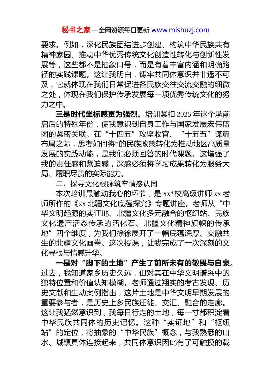 秘书之家—全网资源每日更新 www.mishuzj.com参加铸牢中华民族共同体意识专题培训班心得体会在 2025 年岁末,我有幸参加了单位组织的铸牢中华民族共同体意识专题培训班。此次培训正值“十四五”规划收官与“十五五”规划谋划的关键节点,意义非凡。为期一天的集中学习,时间紧凑但内容充实,让我对这条新时代民族工作的“主线”有了更立体、更深刻、更富情感温度的理解。它不仅仅是一次政策的宣讲、理论的灌输,更是一次文化的寻根、思想的淬炼与初心的回望。下面,我结合培训内容,谈谈个人的三点心得体会。一、深化理论认知明晰主线方位培训伊始,我便感受到此次学习非同寻常的定位与分量。它并非泛泛而谈,而是紧密围绕“有形、有感、有效”推进共同体意识建设这一核心要求展开。通过系统学习,我对铸牢中华民族共同体意识的理论逻辑、历史逻辑与实践逻辑有了更清晰的把握。一是主线地位的认识得到根本性强化。过去,我对“主线”一词的理解多少停留在概念层面。通过此次学习我深刻认识到,铸牢中华民族共同体意识是维护国家统一民族团结的思想基石,是关乎长治久安的根本大计。它不能仅仅视为民族工作部门的一项业务,而必须像培训所强调的那样,贯穿于地区经济建设、政治建设、文化建设、社会建设、生态文明建设和*的建设的全过程、各方面。这要求我们在思考任何工作时,都要具备这种“主线思维”主动寻求与共同体意识建设的结合点。二是目标方向与实践要求更加具体化。培训避免了空洞说教,而是将宏大的目标分解为可感知、可操作的具体秘书之家—全网资源每日更新 www.mishuzj.com要求。例如,深化民族团结进步创建、构筑中华民族共有精神家园、推动中华优秀传统文化创造性转化与创新性发展等,这些都不是抽象口号,而是有着丰富内涵和明确路径的实践课题。这让我明白,铸牢共同体意识并非遥不可及,它就体现在我们日常促进各民族交往交流交融的细微之处,体现在我们保护传承发展每一项优秀传统文化的努力之中。三是时代坐标感更为强烈。培训紧扣 2025 年这个承前启后的特殊年份,使我意识到自身工作与国家发展宏伟蓝图的紧密关联。在“十四五”攻坚收官、“十五五”谋篇布局之际,思考如何将*的民族政策转化为推动地区高质量发展的实践动能,是我们必须回答的时代课题。这增强了我的责任感和紧迫感,深感必须将学习成果转化为服务大局、履职尽责的实际能力。二、探寻文化根脉筑牢情感认同本次培训最触动我心的环节,是 xx*校高级讲师 xx 老师所作的《xx 北疆文化底蕴探究》专题讲座。老师从“中华文明起源的实证地、北疆文化多元融合的枢纽站、民族文化遗产活态传承的活化石、北疆文化精神旗帜的传承地”四个维度,为我们徐徐展开了一幅底蕴深厚、交融共生的北疆文化画卷。这次授课,让我完成了一次深刻的文化寻根与情感升华。一是对“脚下的土地”产生了前所未有的敬畏与自豪。过去,我知道家乡历史久远,但对其在中华文明谱系中的独特位置和价值认知模糊。老师通过翔实的考古发现、历史文献和生动案例指出,这片土地是中华文明早期发展的重要参与者,是历史上多民族迁徙、交汇、融合的走廊。这让我猛然意识到,我每日行走的土地,每一寸都积淀着中华民族共同体的历史记忆。这种“实证地”和“枢纽站”的定位,将抽象的“中华民族”概念,与我熟悉的山水、城镇具体连接起来,共同体意识因此有了可触摸的载秘书之家—全网资源每日更新 www.mishuzj.com体。二是深刻理解了“多元”与“一体”的辩证统一。北疆文化不是单一民族的独角戏,而是多民族共同谱写的交响乐。老师讲述的不同民族文化在这里交流互鉴、共生共荣的故事,例如某些共同的民俗节庆、艺术形式中融合的多民族元素,生动诠释了“多元聚为一体、一体容纳多元”的中华民族发展格局。这让我认识到,铸牢中华民族共同体意识,绝不是要消除文化多样性,而是在尊重差异包容多样中,不断增强对中华文化主干和共同性的认同。北疆文化本身就是一部各民族共创、共享中华文化的鲜活史诗。三是激发了文化传承创新的自觉。老师将我们的文化遗产喻为“活化石”和“精神旗帜的传承地”,强调其活态传承的重要性。这...