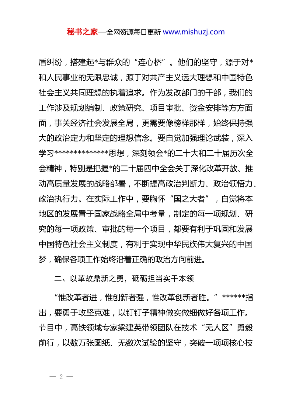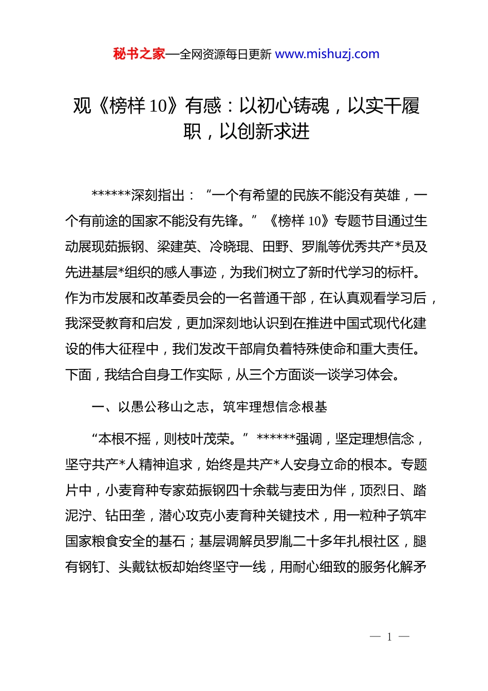 秘书之家—全网资源每日更新 www.mishuzj.com观《榜样 10》有感:以初心铸魂,以实干履职,以创新求进******深刻指出:“一个有希望的民族不能没有英雄,一个有前途的国家不能没有先锋。”《榜样 10》专题节目通过生动展现茹振钢、梁建英、冷晓琨、田野、罗胤等优秀共产*员及先进基层*组织的感人事迹,为我们树立了新时代学习的标杆。作为市发展和改革委员会的一名普通干部,在认真观看学习后,我深受教育和启发,更加深刻地认识到在推进中国式现代化建设的伟大征程中,我们发改干部肩负着特殊使命和重大责任。下面,我结合自身工作实际,从三个方面谈一谈学习体会。一、以愚公移山之志,筑牢理想信念根基“本根不摇,则枝叶茂荣。”******强调,坚定理想信念,坚守共产*人精神追求,始终是共产*人安身立命的根本。专题片中,小麦育种专家茹振钢四十余载与麦田为伴,顶烈日、踏泥泞、钻田垄,潜心攻克小麦育种关键技术,用一粒种子筑牢国家粮食安全的基石;基层调解员罗胤二十多年扎根社区,腿有钢钉、头戴钛板却始终坚守一线,用耐心细致的服务化解矛— 1 —秘书之家—全网资源每日更新 www.mishuzj.com盾纠纷,搭建起*与群众的“连心桥”。他们的坚守,源于对*和人民事业的无限忠诚,源于对共产主义远大理想和中国特色社会主义共同理想的执着追求。作为发改部门的干部,我们的工作涉及规划编制、政策研究、项目审批、资金安排等方方面面,事关经济社会发展全局,更需要像榜样那样,始终保持强大的政治定力和坚定的理想信念。要自觉加强理论武装,深入学习**************思想,深刻领会*的二十大和二十届历次全会精神,特别是把握*的二十届四中全会关于深化改革开放、推动高质量发展的战略部署,不断提高政治判断力、政治领悟力、政治执行力。在实际工作中,要胸怀“国之大者”,自觉将本地区的发展置于国家战略全局中考量,制定的每一项规划、研究的每一项政策、审批的每一个项目,都要有利于巩固和发展中国特色社会主义制度,有利于实现中华民族伟大复兴的中国梦,确保各项工作始终沿着正确的政治方向前进。二、以革故鼎新之勇,砥砺担当实干本领“惟改革者进,惟创新者强,惟改革创新者胜。”******指出,要勇于攻坚克难,以钉钉子精神做实做细做好各项工作。节目中,高铁领域专家梁建英带领团队在技术“无人区”勇毅前行,以数万张图纸、无数次试验的坚守,突破一项项核心技— 2 —秘书之家—全网资源每日更新 www.mishuzj.com术壁垒,让中国高铁跑出令世界瞩目的“中国速度”;青年科技工作者冷晓琨怀揣科技报国初心,直面人形机器人关键零部件“卡脖子”困境,带领团队日夜攻关,破解诸多技术难题。他们的事迹生动诠释了攻坚克难、开拓创新的担当精神。发展改革工作本身就具有很强的前瞻性、探索性和挑战性,面对“十五五”时期的新形势新任务,特别是当前经济运行中的深层次结构性矛盾、推动产业转型升级、实现科技自立自强、促进区域协调发展、落实“双碳”目标等重大课题,更需要我们发扬榜样那种“逢山开路、遇水架桥”的闯劲和“滴水穿石、久久为功”的韧劲。要立足本职岗位,锤炼专业素养,加强对经济规律的学习研究,提高把握政策、分析形势、谋划项目、推动落实的能力。要坚持问题导向,深入基层一线开展调查研究,摸清发展进程中亟待破解的堵点难点,精准掌握人民群众反映强烈的诉求期盼,提出切实可行的政策建议。要发扬钉钉子精神,对于认准的改革方向、定下的发展目标,要一抓到底,务求实效,把规划蓝图一步步变为现实,努力创造出经得起实践、人民和历史检验的实绩。三、以枝叶关情之心,践行勤政为民宗旨“治国有常,而利民为本。”******强调,要始终把人民放— 3 —秘书之家—全网资源每日更新 www.mishuzj.com在心中最高位置,把好事实事做到群众心坎上。榜样们的奋斗历程,无不围绕着“人民”二字展开。茹振钢不仅培育出优质小麦品种,更无偿向农民传授种植技术,让农民的钱袋子实实在在鼓起来,被亲切地称为“粮财神”;罗胤将百姓的“鸡毛蒜皮”当作“头等大事”,在琐碎的调解工作中守护着社区的和谐安宁;田野院士甘坐基础研究“冷板凳...