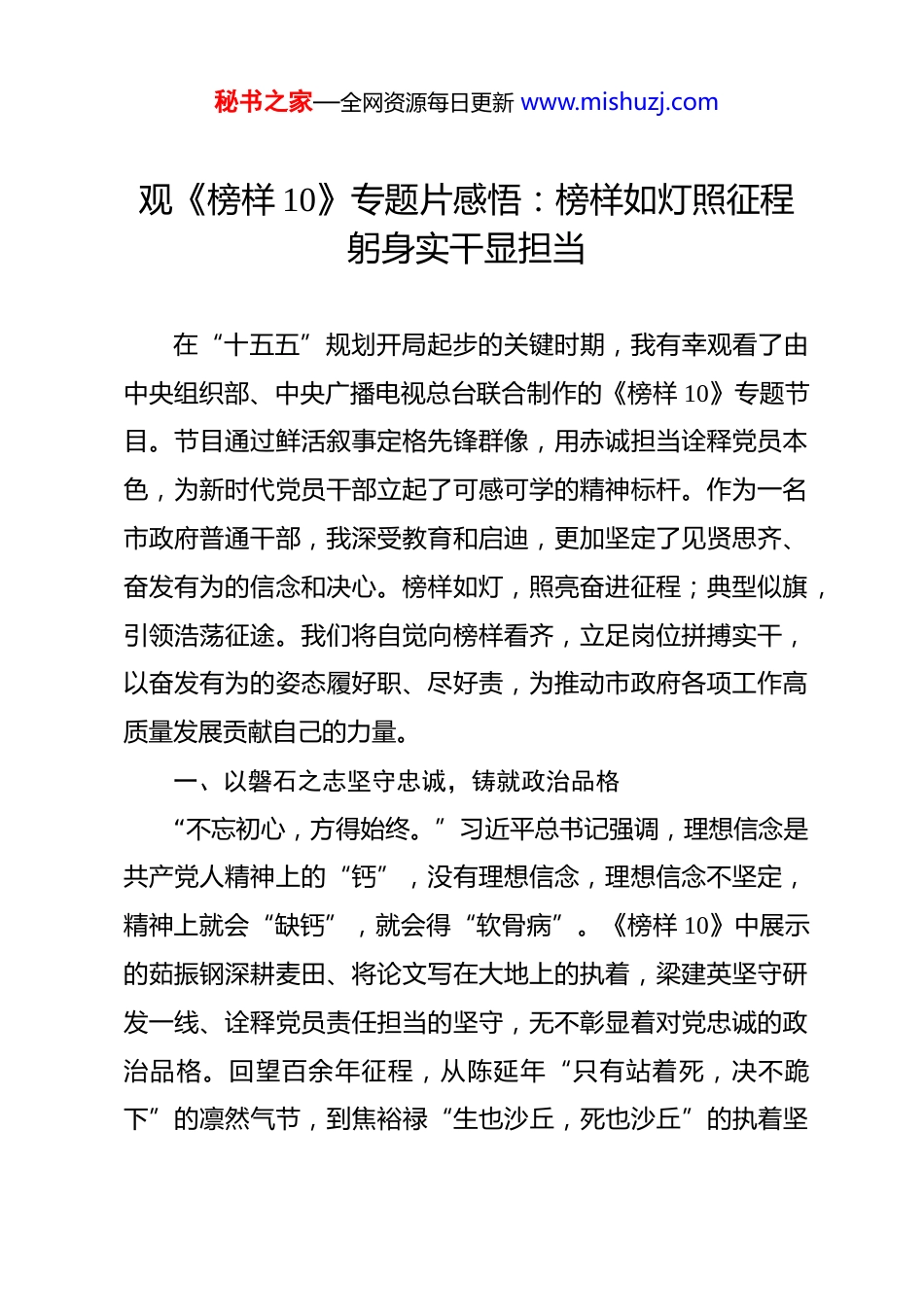 秘书之家—全网资源每日更新 www.mishuzj.com观《榜样 10》专题片感悟:榜样如灯照征程躬身实干显担当 在“十五五”规划开局起步的关键时期,我有幸观看了由中央组织部、中央广播电视总台联合制作的《榜样 10》专题节目。节目通过鲜活叙事定格先锋群像,用赤诚担当诠释党员本色,为新时代党员干部立起了可感可学的精神标杆。作为一名市政府普通干部,我深受教育和启迪,更加坚定了见贤思齐、奋发有为的信念和决心。榜样如灯,照亮奋进征程;典型似旗,引领浩荡征途。我们将自觉向榜样看齐,立足岗位拼搏实干,以奋发有为的姿态履好职、尽好责,为推动市政府各项工作高质量发展贡献自己的力量。一、以磐石之志坚守忠诚,铸就政治品格“不忘初心,方得始终。”习近平总书记强调,理想信念是共产党人精神上的“钙”,没有理想信念,理想信念不坚定,精神上就会“缺钙”,就会得“软骨病”。《榜样 10》中展示的茹振钢深耕麦田、将论文写在大地上的执着,梁建英坚守研发一线、诠释党员责任担当的坚守,无不彰显着对党忠诚的政治品格。回望百余年征程,从陈延年“只有站着死,决不跪下”的凛然气节,到焦裕禄“生也沙丘,死也沙丘”的执着坚秘书之家—全网资源每日更新 www.mishuzj.com守,共产党人身上闪耀的忠诚品质一脉相承、薪火相传。作为市政府干部,我们要自觉在思想上看齐,永远保持对党的忠诚和热爱,常重温入党志愿书、常叩问初心使命,始终做到听党话、跟党走,把旗帜鲜明讲政治贯穿履职尽责全过程。在实际工作中,要不断提高政治判断力、政治领悟力、政治执行力,以实际行动衷心拥护“两个确立”、忠诚践行“两个维护”,让忠诚之心在岁月磨砺中愈发坚定,确保市政府各项决策部署不折不扣落到实处。二、以春蚕之丝勤勉奉献,践行根本宗旨“江山就是人民,人民就是江山。”习近平总书记深刻指出,“民之所忧,我必念之;民之所盼,我必行之”。《榜样 10》中呈现的优秀共产党员,无论是在乡村全面振兴的田野上,还是在基层治理的实践中,都展现出冲锋在前、实干为民的崇高境界。从支月英老师给孩子们“妈妈一样的爱”,到张富清深藏功名、扎根贫困山区的一生奉献,他们用实际行动诠释了共产党人的根本宗旨。作为服务城市发展和市民生活的市政府工作人员,我们要自觉在行动上看齐,始终把群众冷暖放在心上,坚决摒弃形式主义、官僚主义,主动深入基层、贴近群众。要结合市政府“一线走访、现场办公”等工作机制,用脚步丈量民情,用实干回应民愿,把群众的“小事”当作“大事”来办,秘书之家—全网资源每日更新 www.mishuzj.com着力解决群众急难愁盼问题。要秉持“功成不必在我”的境界和“功成必定有我”的担当,让奉献精神在为民服务中落地生根、开花结果,不断提升市民群众的获得感、幸福感、安全感。三、以拓荒之勇攻坚克难,书写时代答卷“惟改革者进,惟创新者强,惟改革创新者胜。”习近平总书记强调,志不求易者成,事不避难者进。《榜样 10》中的先进典型,无论是让“中国标准”落地非洲的熊国明,还是打造“响亮招牌”的周占武,他们都具备敢于担当、善于作为的优良品质,在各自领域取得了不凡业绩。当前,我市正处在转型升级、爬坡过坎的关键阶段,迫切需要广大党员干部开拓进取、迎难而上,展现新担当、新作为。我们要自觉在作风上看齐,既要砥砺担当之志,敢于直面困难挑战,不避矛盾、不躲难题,主动投身改革发展主战场、重大任务最前沿实践锻炼。也要淬炼担当之能,勇于创新、善于创新,在推进城市治理现代化、优化营商环境、推动产业创新等工作中,提高应对复杂局面、解决疑难问题的能力。要以“舍小利谋远”的胸怀,舍小家为大家,将个人奋斗融入城市发展大局,以实干实绩书写新时代的奋斗答卷。“征程万里风正劲,重任千钧再出发。”通过观看《榜样10》专题节目,我更加深刻地认识到,榜样是一种力量,是一秘书之家—全网资源每日更新 www.mishuzj.com面旗帜,是一座灯塔。作为市政府机关干部,我们要以此次学习为契机,带着信仰“入木三分”学,在“问”中知榜样的点滴事,在“悟”中解榜样的情怀线,在“寻”中踏榜样的身心路。要坚守一份“舍...