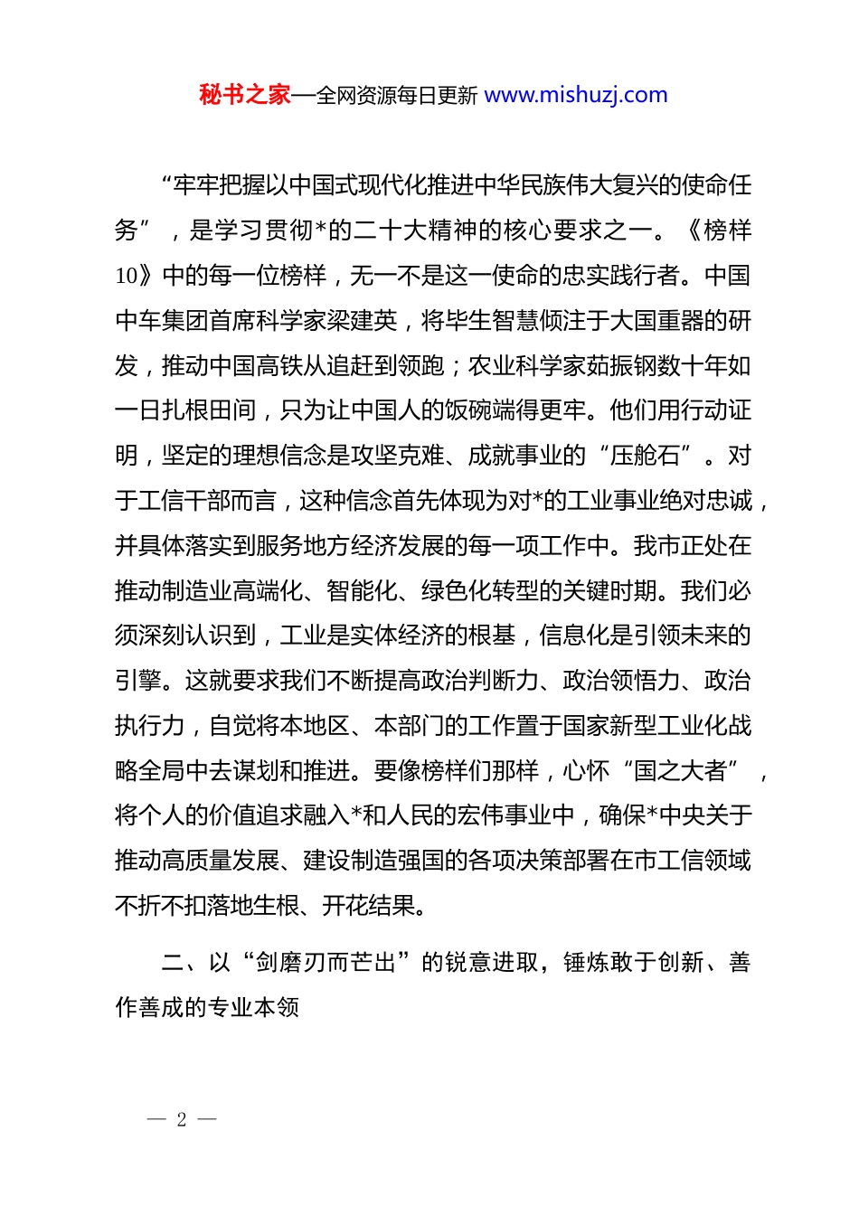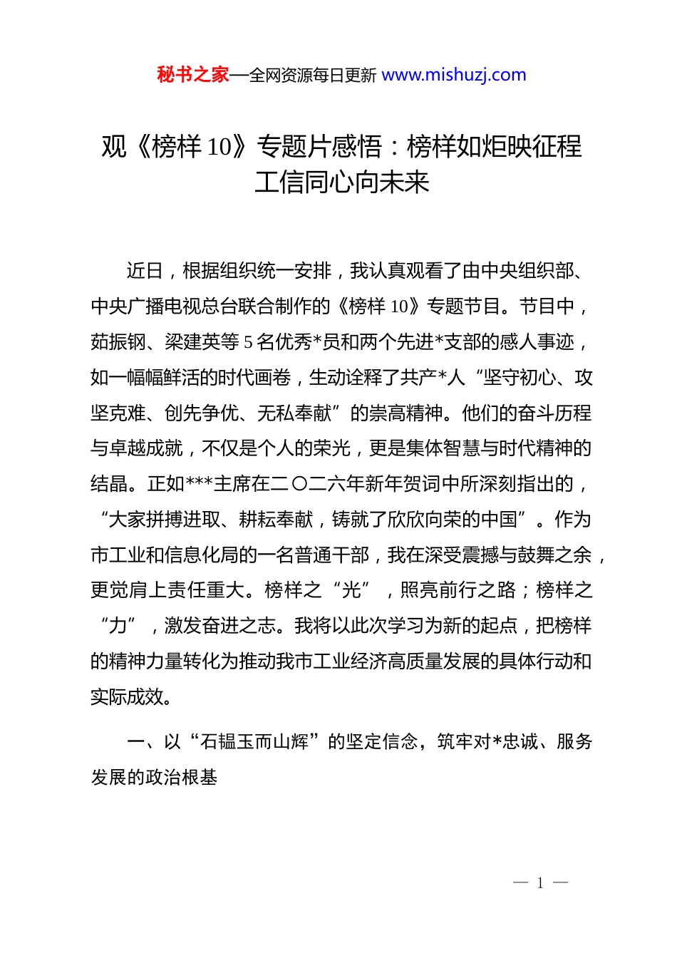 秘书之家—全网资源每日更新 www.mishuzj.com观《榜样 10》专题片感悟:榜样如炬映征程工信同心向未来近日,根据组织统一安排,我认真观看了由中央组织部、中央广播电视总台联合制作的《榜样 10》专题节目。节目中,茹振钢、梁建英等 5 名优秀*员和两个先进*支部的感人事迹,如一幅幅鲜活的时代画卷,生动诠释了共产*人“坚守初心、攻坚克难、创先争优、无私奉献”的崇高精神。他们的奋斗历程与卓越成就,不仅是个人的荣光,更是集体智慧与时代精神的结晶。正如***主席在二〇二六年新年贺词中所深刻指出的,“大家拼搏进取、耕耘奉献,铸就了欣欣向荣的中国”。作为市工业和信息化局的一名普通干部,我在深受震撼与鼓舞之余,更觉肩上责任重大。榜样之“光”,照亮前行之路;榜样之“力”,激发奋进之志。我将以此次学习为新的起点,把榜样的精神力量转化为推动我市工业经济高质量发展的具体行动和实际成效。一、以“石韫玉而山辉”的坚定信念,筑牢对*忠诚、服务发展的政治根基— 1 —秘书之家—全网资源每日更新 www.mishuzj.com“牢牢把握以中国式现代化推进中华民族伟大复兴的使命任务”,是学习贯彻*的二十大精神的核心要求之一。《榜样10》中的每一位榜样,无一不是这一使命的忠实践行者。中国中车集团首席科学家梁建英,将毕生智慧倾注于大国重器的研发,推动中国高铁从追赶到领跑;农业科学家茹振钢数十年如一日扎根田间,只为让中国人的饭碗端得更牢。他们用行动证明,坚定的理想信念是攻坚克难、成就事业的“压舱石”。对于工信干部而言,这种信念首先体现为对*的工业事业绝对忠诚,并具体落实到服务地方经济发展的每一项工作中。我市正处在推动制造业高端化、智能化、绿色化转型的关键时期。我们必须深刻认识到,工业是实体经济的根基,信息化是引领未来的引擎。这就要求我们不断提高政治判断力、政治领悟力、政治执行力,自觉将本地区、本部门的工作置于国家新型工业化战略全局中去谋划和推进。要像榜样们那样,心怀“国之大者”,将个人的价值追求融入*和人民的宏伟事业中,确保*中央关于推动高质量发展、建设制造强国的各项决策部署在市工信领域不折不扣落地生根、开花结果。二、以“剑磨刃而芒出”的锐意进取,锤炼敢于创新、善作善成的专业本领— 2 —秘书之家—全网资源每日更新 www.mishuzj.com******在二十届中央纪委五次全会上强调,广大*员、干部要增强“历史使命感”。这份使命感,在榜样身上化为直面挑战、锐意创新的非凡勇气。《榜样 10》展现的,正是这种在关键核心技术领域“啃硬骨头”、在产业前沿“开新路”的担当精神。当前,全球产业竞争日趋激烈,科技创新已成为国际战略博弈的主要战场。我市工业经济要突破瓶颈、实现跨越,必须依靠创新驱动,这对我局干部的履职能力提出了更高要求。我们必须摒弃“等靠要”思想,主动对标榜样“创先争优”的品质。一方面,要深入实施创新驱动发展战略,积极引导和支持企业建立技术中心、制造业创新中心,推动产学研用深度融合,加快突破一批制约产业发展的“卡脖子”技术。另一方面,要聚焦我市主导产业和战略性新兴产业,在推动企业技术改造、促进工业互联网与制造业深度融合、培育人工智能和大数据等新一代信息技术产业上下苦功、求实效。要像榜样冷晓琨、田野等人那样,将岗位作为磨砺本领的“试金石”,在监测分析工业经济运行、协调生产要素保障、指导行业安全生产管理等日常工作中,不断学习新知识、掌握新技能、探索新方法,努力成为精通政策、熟悉产业、善于服务的行家里手,以专业能力的“锋刃”破解发展难题。— 3 —秘书之家—全网资源每日更新 www.mishuzj.com三、以“鱼得水而骨肉”的深厚情怀,践行扎根企业、纾困解难的服务宗旨******多次号召广大*员干部要“像他那样做人、为政,‘为官一任,造福一方’”。这深刻揭示了共产*人政绩观的人民性本质。《榜样 10》中,无论是扎根基层的*支部,还是服务一线的*员,他们最动人的品质,正是那种与群众和企业“同呼吸、共命运”的赤子情怀。工信部门作为企业与政府的桥梁纽带,其工作的出发点和落脚点,就是服务企业、促进发展。我们必...