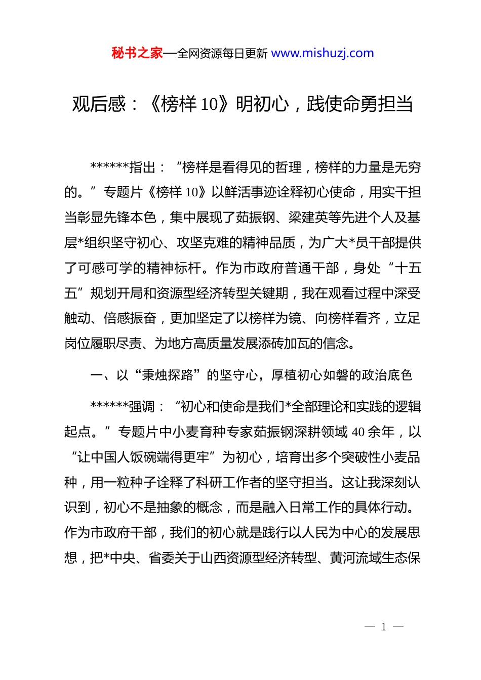 秘书之家—全网资源每日更新 www.mishuzj.com观后感:《榜样 10》明初心,践使命勇担当******指出:“榜样是看得见的哲理,榜样的力量是无穷的。”专题片《榜样 10》以鲜活事迹诠释初心使命,用实干担当彰显先锋本色,集中展现了茹振钢、梁建英等先进个人及基层*组织坚守初心、攻坚克难的精神品质,为广大*员干部提供了可感可学的精神标杆。作为市政府普通干部,身处“十五五”规划开局和资源型经济转型关键期,我在观看过程中深受触动、倍感振奋,更加坚定了以榜样为镜、向榜样看齐,立足岗位履职尽责、为地方高质量发展添砖加瓦的信念。一、以“秉烛探路”的坚守心,厚植初心如磐的政治底色******强调:“初心和使命是我们*全部理论和实践的逻辑起点。”专题片中小麦育种专家茹振钢深耕领域 40 余年,以“让中国人饭碗端得更牢”为初心,培育出多个突破性小麦品种,用一粒种子诠释了科研工作者的坚守担当。这让我深刻认识到,初心不是抽象的概念,而是融入日常工作的具体行动。作为市政府干部,我们的初心就是践行以人民为中心的发展思想,把*中央、省委关于山西资源型经济转型、黄河流域生态保— 1 —秘书之家—全网资源每日更新 www.mishuzj.com护等决策部署落到实处。在日常公文办理、政策落实、群众接待等工作中,要以茹振钢“把论文写在大地上”的务实作风为标杆,摒弃“过得去就行”的敷衍心态,对每一项任务严谨细致、对每一个环节精益求精。要深入学习贯彻*的二十届四中全会精神,将初心坚守体现到优化政务服务、推动政策落地的细节中,主动对接基层需求,把群众的“急难愁盼”作为工作的出发点和落脚点,以“时时放心不下”的责任感厚植政治底色。二、以“披荆斩棘”的攻坚力,锤炼实干担当的履职本领******指出:“干部成长无捷径可走,经风雨、见世面才能壮筋骨、长才干。”专题片中的先进典型们始终在攻坚克难中勇毅前行,梁建英深耕轨道交通装备研发,冷晓琨扎根乡村振兴一线,用实干破解发展难题。这启示我们,作为市政府干部,面对转型发展中的堵点难点、改革推进中的风险挑战,必须锤炼攻坚克难的硬本领。当前,我市正全力推进新型能源体系建设、营商环境优化等重点工作,我将以榜样为动力,主动对标市委市政府工作部署,在政策解读、项目协调、基层督导等工作中提升专业能力。要深入学习 2026 年省委经济工作会议关于“集聚财力保障战略、推动适度多元发展”的部署要求,立足岗位钻研业务,主动破解工作中的流程壁垒和执行梗阻。— 2 —秘书之家—全网资源每日更新 www.mishuzj.com要践行“一线工作法”,多到项目现场、基层一线摸清实情,以“钉钉子”精神推动各项工作落地见效,在攻坚克难中练就担当作为的真功夫,为资源型经济转型注入实干动能。三、以“俯身耕耘”的奉献情,涵养清正廉洁的作风品行******强调:“清正廉洁是共产*人安身立命之本,是不能丢弃的政治底色。”专题片中的先进*组织和*员干部,始终坚守廉洁底线,以无私奉献诠释共产*员的政治本色,为我们树立了作风标杆。作为市政府干部,身处权力运行的关键环节,必须时刻绷紧廉洁自律这根弦,以榜样为镜筑牢思想防线。要严格遵守中央八项规定及其实施细则精神,落实二十届中央纪委五次全会关于作风建设的部署要求,在公务接待、项目审批、资金使用等工作中坚守纪律红线。要践行亲清政商关系要求,既主动服务企业、助力发展,又守住交往边界、不越纪律底线。要涵养“计利当计天下利”的奉献精神,正确处理公与私、得与失的关系,在平凡岗位上默默耕耘、无私奉献。要主动接受监督,习惯在约束中工作生活,以清正廉洁的作风品行树立市政府干部的良好形象,为涵养风清气正的机关生态贡献力量。榜样如灯,照亮前行之路;榜样如旗,引领奋进方向。《榜样 10》中的先进典型用实际行动诠释了共产*人的初心使— 3 —秘书之家—全网资源每日更新 www.mishuzj.com命,为我们注入了干事创业的强大动力。作为市政府普通干部,我将以此次观看学习为契机,把榜样精神转化为履职尽责的实际行动,在坚守初心中筑牢根基,在攻坚克难中提升本领,在廉洁奉献中践行使命。紧扣全市中心工作,立足...