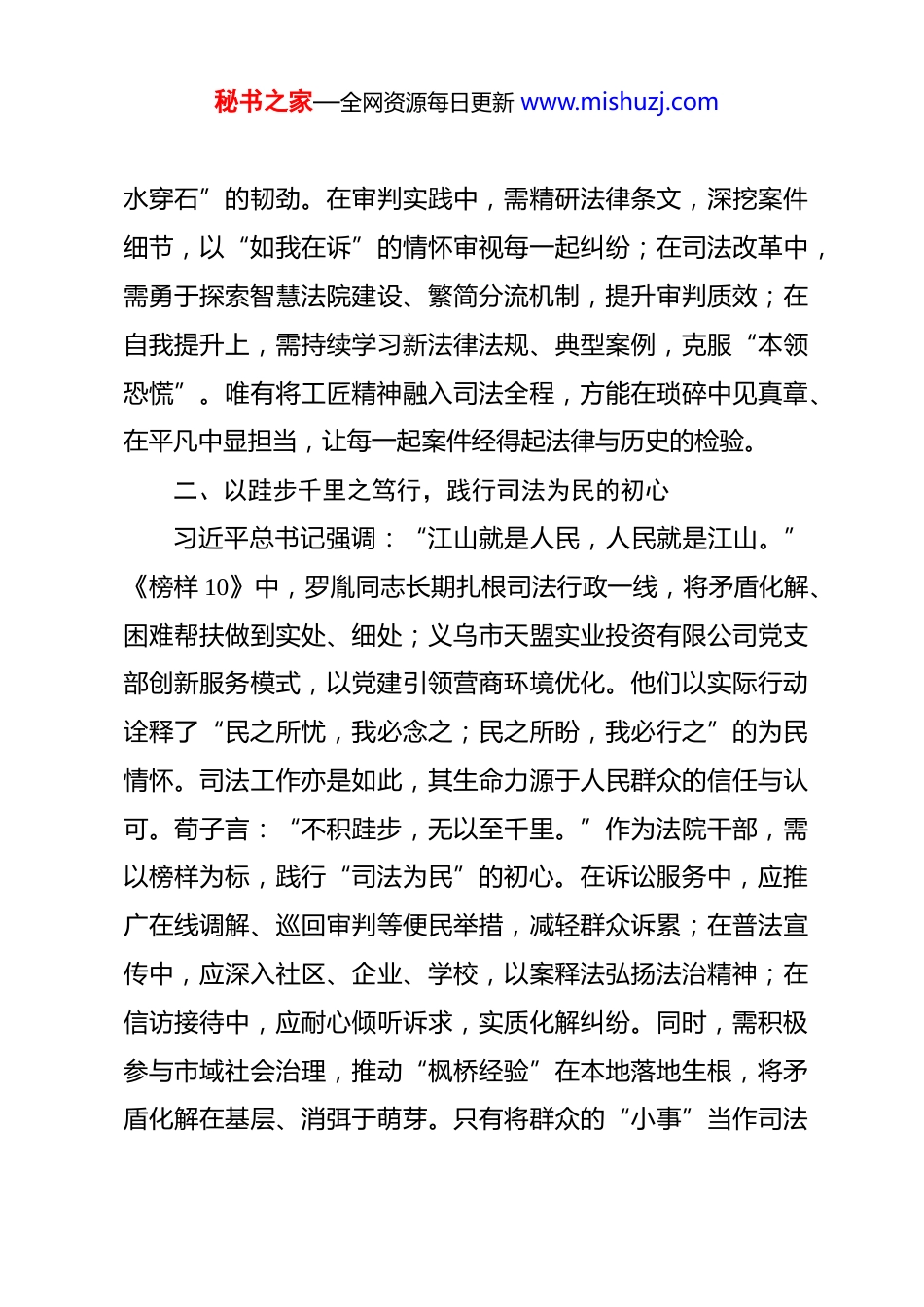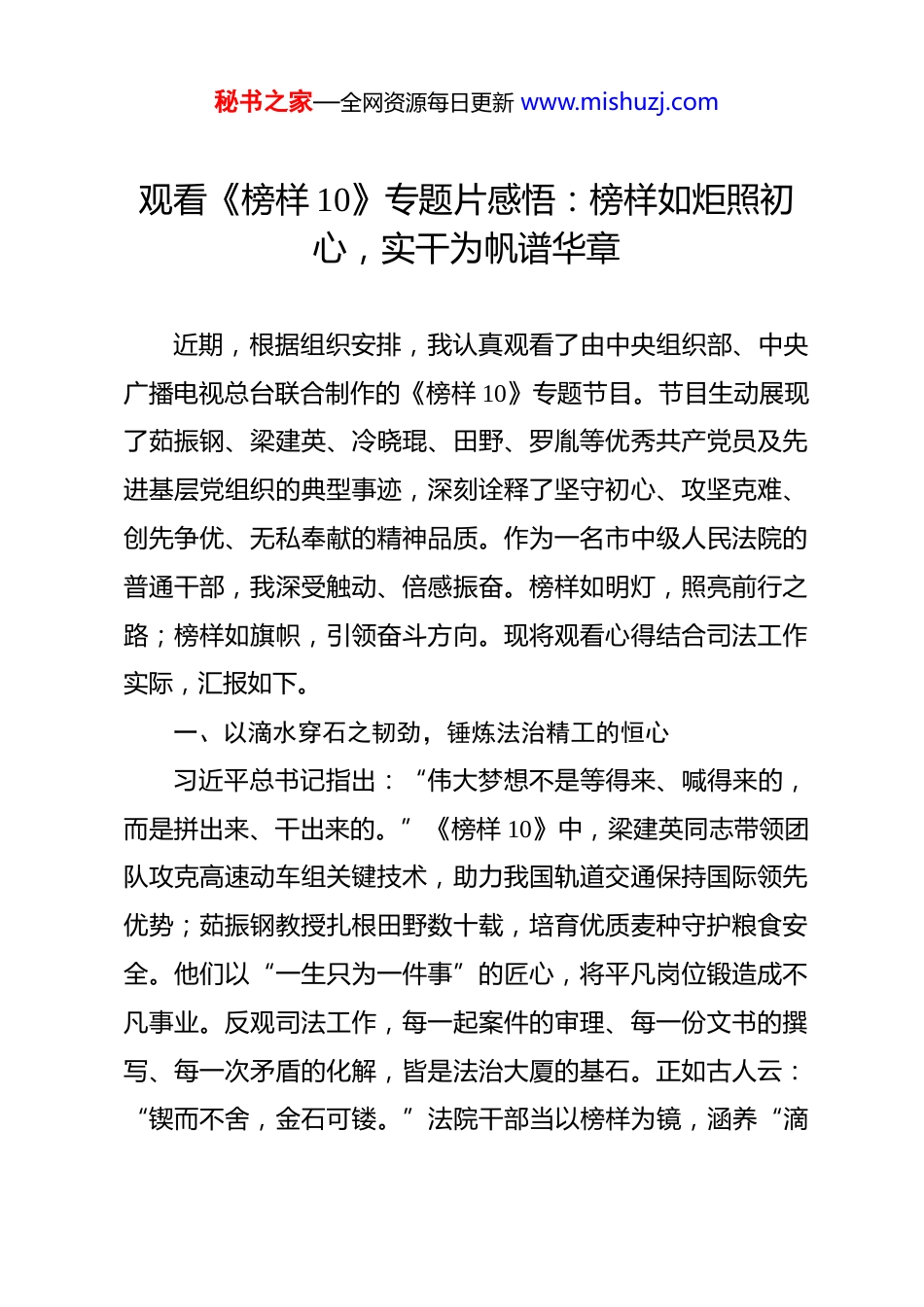 秘书之家—全网资源每日更新 www.mishuzj.com观看《榜样 10》专题片感悟:榜样如炬照初心,实干为帆谱华章 近期,根据组织安排,我认真观看了由中央组织部、中央广播电视总台联合制作的《榜样 10》专题节目。节目生动展现了茹振钢、梁建英、冷晓琨、田野、罗胤等优秀共产党员及先进基层党组织的典型事迹,深刻诠释了坚守初心、攻坚克难、创先争优、无私奉献的精神品质。作为一名市中级人民法院的普通干部,我深受触动、倍感振奋。榜样如明灯,照亮前行之路;榜样如旗帜,引领奋斗方向。现将观看心得结合司法工作实际,汇报如下。一、以滴水穿石之韧劲,锤炼法治精工的恒心习近平总书记指出:“伟大梦想不是等得来、喊得来的,而是拼出来、干出来的。”《榜样 10》中,梁建英同志带领团队攻克高速动车组关键技术,助力我国轨道交通保持国际领先优势;茹振钢教授扎根田野数十载,培育优质麦种守护粮食安全。他们以“一生只为一件事”的匠心,将平凡岗位锻造成不凡事业。反观司法工作,每一起案件的审理、每一份文书的撰写、每一次矛盾的化解,皆是法治大厦的基石。正如古人云:“锲而不舍,金石可镂。”法院干部当以榜样为镜,涵养“滴秘书之家—全网资源每日更新 www.mishuzj.com水穿石”的韧劲。在审判实践中,需精研法律条文,深挖案件细节,以“如我在诉”的情怀审视每一起纠纷;在司法改革中,需勇于探索智慧法院建设、繁简分流机制,提升审判质效;在自我提升上,需持续学习新法律法规、典型案例,克服“本领恐慌”。唯有将工匠精神融入司法全程,方能在琐碎中见真章、在平凡中显担当,让每一起案件经得起法律与历史的检验。二、以跬步千里之笃行,践行司法为民的初心习近平总书记强调:“江山就是人民,人民就是江山。”《榜样 10》中,罗胤同志长期扎根司法行政一线,将矛盾化解、困难帮扶做到实处、细处;义乌市天盟实业投资有限公司党支部创新服务模式,以党建引领营商环境优化。他们以实际行动诠释了“民之所忧,我必念之;民之所盼,我必行之”的为民情怀。司法工作亦是如此,其生命力源于人民群众的信任与认可。荀子言:“不积跬步,无以至千里。”作为法院干部,需以榜样为标,践行“司法为民”的初心。在诉讼服务中,应推广在线调解、巡回审判等便民举措,减轻群众诉累;在普法宣传中,应深入社区、企业、学校,以案释法弘扬法治精神;在信访接待中,应耐心倾听诉求,实质化解纠纷。同时,需积极参与市域社会治理,推动“枫桥经验”在本地落地生根,将矛盾化解在基层、消弭于萌芽。只有将群众的“小事”当作司法秘书之家—全网资源每日更新 www.mishuzj.com“大事”,方能厚植党的执政根基,让公平正义可感可触。三、以枝叶关情之襟怀,筑牢公平正义的根基习近平总书记嘱托:“努力让人民群众在每一个司法案件中感受到公平正义。”《榜样 10》中,冷晓琨同志投身高动态人形机器人研发,彰显科技报国之志;空军某分队党支部驻守“生命禁区”,以忠诚筑起空防长城。他们以无私奉献诠释了“苟利国家生死以,岂因祸福避趋之”的担当。司法作为维护社会公平正义的最后一道防线,其权威源于干警的清廉与奉献。郑板桥诗云:“一枝一叶总关情。”法院干部当以榜样为尺,筑牢“公平正义”的根基。在作风建设上,需常怀敬畏之心,严守“三个规定”,杜绝关系案、人情案、金钱案;在廉政建设中,需时刻自重自省,净化社交圈、生活圈、朋友圈;在党性修养上,需积极参与“学习身边榜样”活动,对标先进查找差距。此外,应聚焦审判执行主责主业,在扫黑除恶、优化营商环境、保护民生权益等重点领域主动作为,以司法之力服务高质量发展大局。唯有将个人理想融入法治中国建设的伟业,方能不负时代、不负人民。《榜样 10》专题片不仅是一场精神洗礼,更是一次党性淬炼。作为市中级人民法院的普通干部,我定将榜样力量内化于心、外化于行,以“越是艰险越向前”的勇毅、“俯首甘为孺秘书之家—全网资源每日更新 www.mishuzj.com子牛”的奉献、“精雕细琢出精品”的执着,投身审判事业。未来工作中,我将持续学习习近平新时代中国特色社会主义思想,贯彻落实党的二十大及二十...