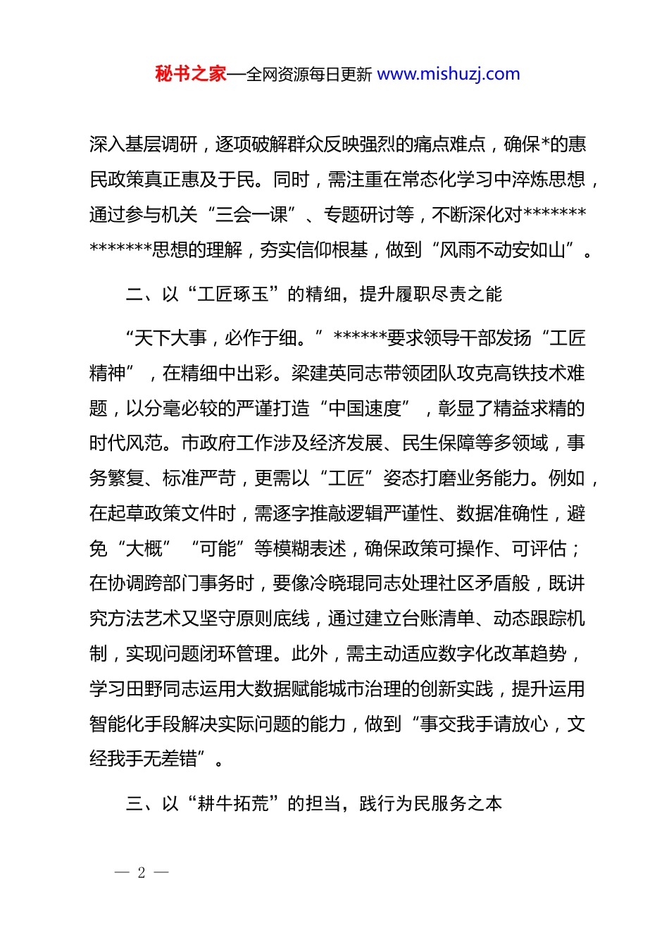 秘书之家—全网资源每日更新 www.mishuzj.com观看《榜样 10》专题片体会:感悟榜样力量,践行初心使命,奋力担当作为******指出:“伟大时代呼唤伟大精神,崇高事业需要榜样引领。”《榜样 10》专题片通过集中展示茹振钢、梁建英等先进典型的感人事迹,深刻诠释了新时代共产*人坚守初心、攻坚克难、无私奉献的精神风貌。作为一名市政府普通干部,我深受教育和启迪,更加坚定了以榜样为镜、向标杆看齐的决心,下面结合工作实际谈三点体会。一、以“樵夫劈山”的韧劲,筑牢理想信念之基“本根不摇,则枝叶茂荣。”******强调,理想信念是共产*人的精神之“钙”。专题片中,茹振钢同志数十年如一日扎根农业科研一线,以“一粒种子改变世界”的执着破解技术瓶颈,生动展现了“咬定青山不放松”的坚韧品格。作为市政府干部,我们肩负政策落实“最后一公里”的重任,更需以榜样为标杆,将理想信念转化为行动自觉。在日常工作中,面对复杂事务和阶段性攻坚任务,需保持战略定力,主动对标全市发展规划,例如在推动乡村振兴政策落地时,要像“樵夫”般精准发力,— 1 —秘书之家—全网资源每日更新 www.mishuzj.com深入基层调研,逐项破解群众反映强烈的痛点难点,确保*的惠民政策真正惠及于民。同时,需注重在常态化学习中淬炼思想,通过参与机关“三会一课”、专题研讨等,不断深化对**************思想的理解,夯实信仰根基,做到“风雨不动安如山”。二、以“工匠琢玉”的精细,提升履职尽责之能“天下大事,必作于细。”******要求领导干部发扬“工匠精神”,在精细中出彩。梁建英同志带领团队攻克高铁技术难题,以分毫必较的严谨打造“中国速度”,彰显了精益求精的时代风范。市政府工作涉及经济发展、民生保障等多领域,事务繁复、标准严苛,更需以“工匠”姿态打磨业务能力。例如,在起草政策文件时,需逐字推敲逻辑严谨性、数据准确性,避免“大概”“可能”等模糊表述,确保政策可操作、可评估;在协调跨部门事务时,要像冷晓琨同志处理社区矛盾般,既讲究方法艺术又坚守原则底线,通过建立台账清单、动态跟踪机制,实现问题闭环管理。此外,需主动适应数字化改革趋势,学习田野同志运用大数据赋能城市治理的创新实践,提升运用智能化手段解决实际问题的能力,做到“事交我手请放心,文经我手无差错”。三、以“耕牛拓荒”的担当,践行为民服务之本— 2 —秘书之家—全网资源每日更新 www.mishuzj.com“民之所忧,我必念之;民之所盼,我必行之。”******的殷殷嘱托,深刻揭示了共产*人的价值追求。专题片中,罗胤同志带领企业*支部投身公益扶贫,以“辛苦我一人,幸福千万家”的奉献诠释了为民初心。市政府干部直接服务人民群众,更需厚植“枝叶关情”的公仆情怀。在接访群众时,要效仿榜样“坐下来倾听、蹲下去解决”的作风,用好“一线工作法”,及时回应民生关切;在推动重点项目时,需借鉴空军 95944 部队 60 分队*支部“冲锋在前”的担当精神,面对征地拆迁、生态治理等硬任务,敢于牵头协调、啃硬骨头。尤其要聚焦群众“急难愁盼”,如优化营商环境、保障“一老一小”等领域,通过建立“民情日记”、开展“下沉式”调研,推动服务端口前移,以“功成不必在我,功成必定有我”的境界,将榜样力量转化为办实事、解难题的实际成效。《榜样 10》专题片是一堂触及灵魂的*性教育课,更是一次凝心聚力的动员令。作为市政府干部,我将以榜样为灯塔,持续锤炼政治品格、提升专业素养、强化宗旨意识,把学习成果转化为推动城市高质量发展、服务人民群众的具体行动,努力在平凡岗位上创造不平凡的业绩,为谱写中国式现代化新篇章贡献绵薄之力!— 3 —
