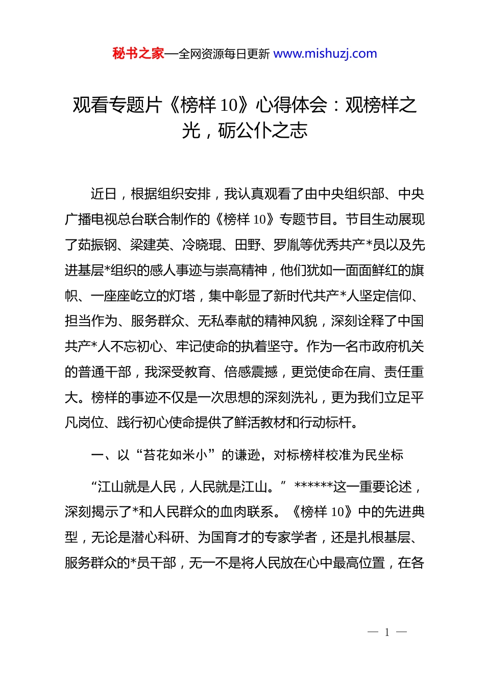 秘书之家—全网资源每日更新 www.mishuzj.com观看专题片《榜样 10》心得体会:观榜样之光,砺公仆之志近日,根据组织安排,我认真观看了由中央组织部、中央广播电视总台联合制作的《榜样 10》专题节目。节目生动展现了茹振钢、梁建英、冷晓琨、田野、罗胤等优秀共产*员以及先进基层*组织的感人事迹与崇高精神,他们犹如一面面鲜红的旗帜、一座座屹立的灯塔,集中彰显了新时代共产*人坚定信仰、担当作为、服务群众、无私奉献的精神风貌,深刻诠释了中国共产*人不忘初心、牢记使命的执着坚守。作为一名市政府机关的普通干部,我深受教育、倍感震撼,更觉使命在肩、责任重大。榜样的事迹不仅是一次思想的深刻洗礼,更为我们立足平凡岗位、践行初心使命提供了鲜活教材和行动标杆。一、以“苔花如米小”的谦逊,对标榜样校准为民坐标“江山就是人民,人民就是江山。”******这一重要论述,深刻揭示了*和人民群众的血肉联系。《榜样 10》中的先进典型,无论是潜心科研、为国育才的专家学者,还是扎根基层、服务群众的*员干部,无一不是将人民放在心中最高位置,在各— 1 —秘书之家—全网资源每日更新 www.mishuzj.com自领域践行着全心全意为人民服务的根本宗旨。茹振钢同志倾心小麦育种,守护国家粮食安全;梁建英同志领军高铁研发,擦亮中国制造名片;冷晓琨、田野等社区工作者,在琐碎繁杂中传递*的温暖。他们的身影,正是“民之所忧,我必念之;民之所盼,我必行之”的生动写照。反观自身,作为市政府的一名普通干部,日常工作多涉及政策起草、协调落实、服务保障等环节,虽不似榜样那般功勋卓著,却同样连接着政策落地的“最后一公里”,关系着群众切身利益与政府形象。学习榜样,首要在于学习他们深厚真挚的人民情怀。我们要自觉将对标榜样作为一种常态,时刻审视自身工作是否真正站稳了人民立场。在文稿起草时,多思考政策举措是否契合群众需求;在协调事务时,多考量各方利益是否得到公平保障;在接待来访时,多倾听群众诉求是否得到有效回应。要甘当“小学生”,拜人民为师,在深入调研中察实情,在换位思考中悟初心,像榜样那样,将“小我”融入服务人民、服务发展的“大我”之中,以“功成不必在我,功成必定有我”的境界,在平凡的岗位上精准校准为民服务的坐标,努力让经手的每一项工作都饱含温度、体现担当。二、以“千磨万击还坚劲”的韧劲,汲取榜样攻坚克难力— 2 —秘书之家—全网资源每日更新 www.mishuzj.com量“惟其艰难,方显勇毅;惟其磨砺,始得玉成。”面对新时代新征程上的风险挑战与繁重任务,攻坚克难是*员干部必备的素质。《榜样 10》中的榜样人物,正是不畏艰难、敢于斗争的典范。他们有的勇闯科技“无人区”,反复试验,终获突破;有的直面基层治理难题,创新方法,化解矛盾;有的在急难险重任务面前,挺身而出,负重前行。这种“越是艰险越向前”的斗争精神和“钉钉子”般的执着韧劲,是推动事业发展的关键所在。当前,我市正处在深入贯彻落实*的二十大精神、奋力推进中国式现代化城市实践的关键时期,市政府的各项工作任务艰巨繁重,深化改革、促进发展、优化环境、保障民生等领域都存在不少需要啃的“硬骨头”。作为市政府机关的普通一兵,我们直接参与政策制定与执行过程,时常会遇到政策理解偏差、部门协调不畅、历史遗留问题复杂、新情况新问题频发等挑战。学习榜样,就是要从中汲取强大的精神动力,锻造“千磨万击还坚劲”的意志品质。要敢于直面问题,不回避矛盾,不推诿塞责,对职责范围内的工作,以“咬定青山不放松”的定力一抓到底。要发扬钻研精神,像茹振钢、梁建英那样精益求精,对负责的业务领域深钻细研,努力成为行家里手,— 3 —秘书之家—全网资源每日更新 www.mishuzj.com提升解决复杂问题的能力。更要学习他们“敢教日月换新天”的昂扬斗志,在落实市委市政府决策部署、推动重点项目建设、优化营商环境、破解民生难题等具体工作中,主动作为,迎难而上,把榜样的力量转化为攻坚克难的实招硬招,确保各项任务落到实处、取得实效。三、以“春蚕到死丝方尽”的奉献,践行榜样无私奉献品格“社会主义是干出来的,新时代...