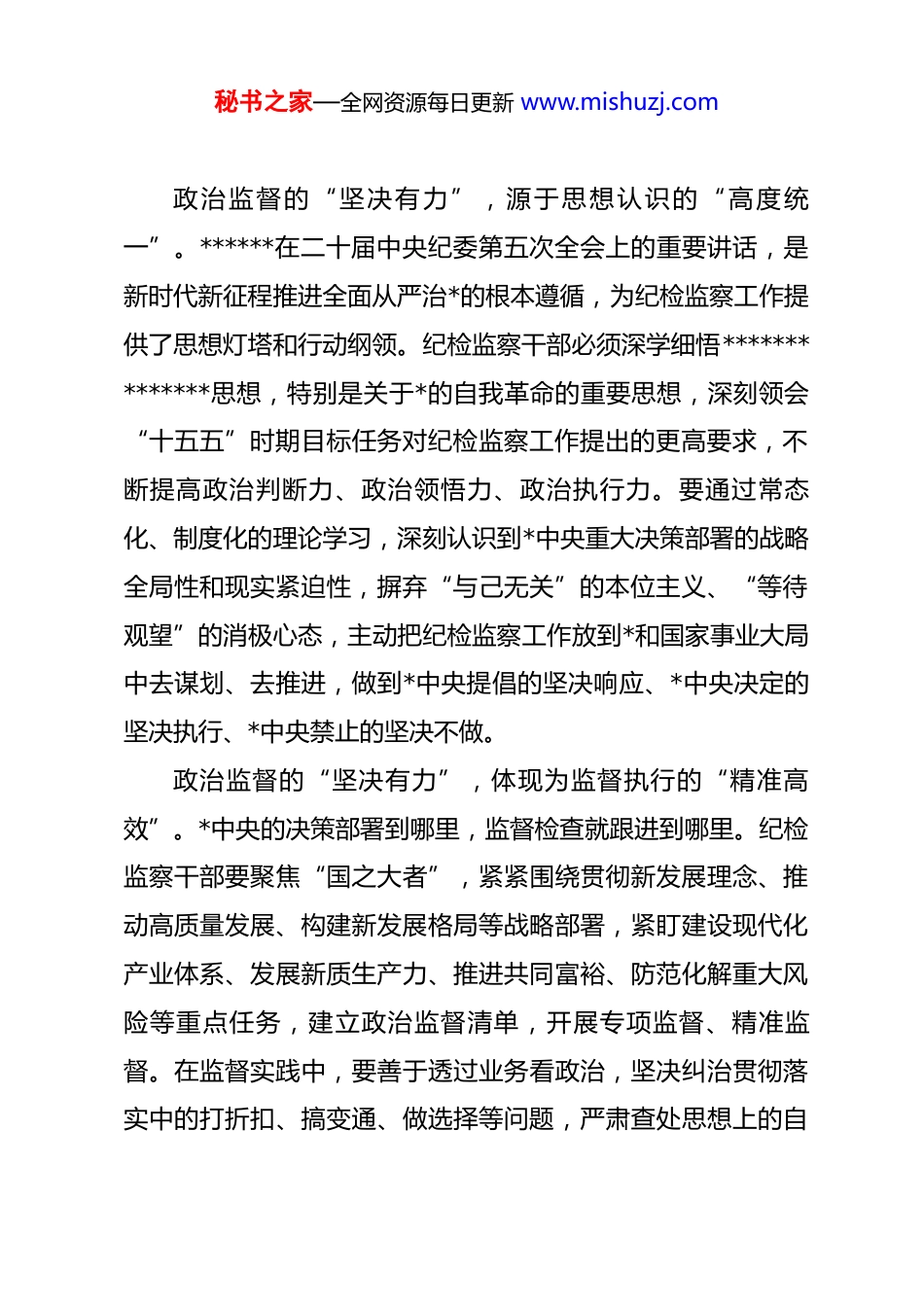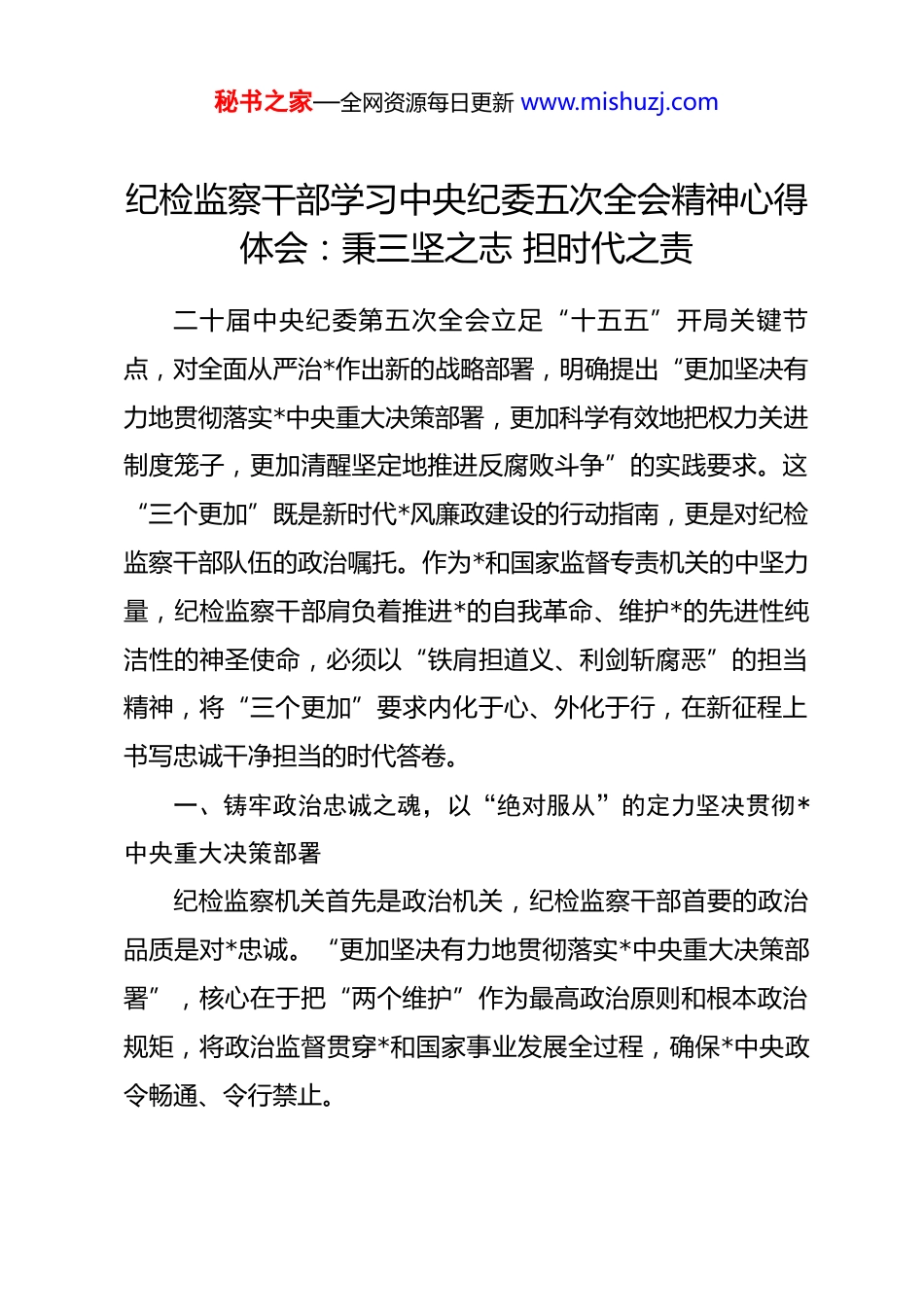 秘书之家—全网资源每日更新 www.mishuzj.com纪检监察干部学习中央纪委五次全会精神心得体会:秉三坚之志 担时代之责二十届中央纪委第五次全会立足“十五五”开局关键节点,对全面从严治*作出新的战略部署,明确提出“更加坚决有力地贯彻落实*中央重大决策部署,更加科学有效地把权力关进制度笼子,更加清醒坚定地推进反腐败斗争”的实践要求。这“三个更加”既是新时代*风廉政建设的行动指南,更是对纪检监察干部队伍的政治嘱托。作为*和国家监督专责机关的中坚力量,纪检监察干部肩负着推进*的自我革命、维护*的先进性纯洁性的神圣使命,必须以“铁肩担道义、利剑斩腐恶”的担当精神,将“三个更加”要求内化于心、外化于行,在新征程上书写忠诚干净担当的时代答卷。一、铸牢政治忠诚之魂,以“绝对服从”的定力坚决贯彻*中央重大决策部署纪检监察机关首先是政治机关,纪检监察干部首要的政治品质是对*忠诚。“更加坚决有力地贯彻落实*中央重大决策部署”,核心在于把“两个维护”作为最高政治原则和根本政治规矩,将政治监督贯穿*和国家事业发展全过程,确保*中央政令畅通、令行禁止。秘书之家—全网资源每日更新 www.mishuzj.com政治监督的“坚决有力”,源于思想认识的“高度统一”。******在二十届中央纪委第五次全会上的重要讲话,是新时代新征程推进全面从严治*的根本遵循,为纪检监察工作提供了思想灯塔和行动纲领。纪检监察干部必须深学细悟**************思想,特别是关于*的自我革命的重要思想,深刻领会“十五五”时期目标任务对纪检监察工作提出的更高要求,不断提高政治判断力、政治领悟力、政治执行力。要通过常态化、制度化的理论学习,深刻认识到*中央重大决策部署的战略全局性和现实紧迫性,摒弃“与己无关”的本位主义、“等待观望”的消极心态,主动把纪检监察工作放到*和国家事业大局中去谋划、去推进,做到*中央提倡的坚决响应、*中央决定的坚决执行、*中央禁止的坚决不做。政治监督的“坚决有力”,体现为监督执行的“精准高效”。*中央的决策部署到哪里,监督检查就跟进到哪里。纪检监察干部要聚焦“国之大者”,紧紧围绕贯彻新发展理念、推动高质量发展、构建新发展格局等战略部署,紧盯建设现代化产业体系、发展新质生产力、推进共同富裕、防范化解重大风险等重点任务,建立政治监督清单,开展专项监督、精准监督。在监督实践中,要善于透过业务看政治,坚决纠治贯彻落实中的打折扣、搞变通、做选择等问题,严肃查处思想上的自秘书之家—全网资源每日更新 www.mishuzj.com由主义、政治上的投机主义、工作上的本位主义等行为。例如,针对“十五五”开局阶段可能出现的急功近利搞“政绩工程”、换届后“翻烧饼”等突出问题,要及时跟进监督、精准纠偏,推动*员干部树立和践行正确政绩观。同时,要深化政治巡视巡察,完善上下联动、左右协同的监督机制,高质量实现监督全覆盖,让*中央的决策部署在基层落地生根、开花结果。政治监督的“坚决有力”,彰显于担当作为的“行动自觉”。纪检监察干部作为*中央决策部署的“监督员”和“护航员”,必须强化使命意识和奋斗意志,以“时时放心不下”的责任感履职尽责。面对贯彻落实中的堵点难点问题,要敢于较真碰硬,不回避矛盾、不畏惧阻力;面对重大任务、紧急情况,要闻令而动、挺身而出,以实际行动保障*中央决策部署落地见效。在监督执纪中,要坚持实事求是,精准把握政策策略,既要严肃查处违纪违法问题,又要激励干部担当作为,做到纪法约束有硬度、组织关怀有温度,实现政治效果、纪法效果、社会效果有机统一。二、锤炼制度治*之能,以“系统施治”的智慧科学有效把权力关进制度笼子权力是一把“双刃剑”,依法依规行使可以造福人民,滥用则必然滋生腐败。******强调,“把权力关进制度笼子是新秘书之家—全网资源每日更新 www.mishuzj.com时代全面从严治*的一项重要任务”。“更加科学有效地把权力关进制度笼子”,要求纪检监察干部既要当好制度的“守护者”,又要当好制度建设的“推动者”,以制度化、规范化、法治化手段规范权力运行,从源头上防范腐败风险。科学有效“治权”,前提是织密制度“...
