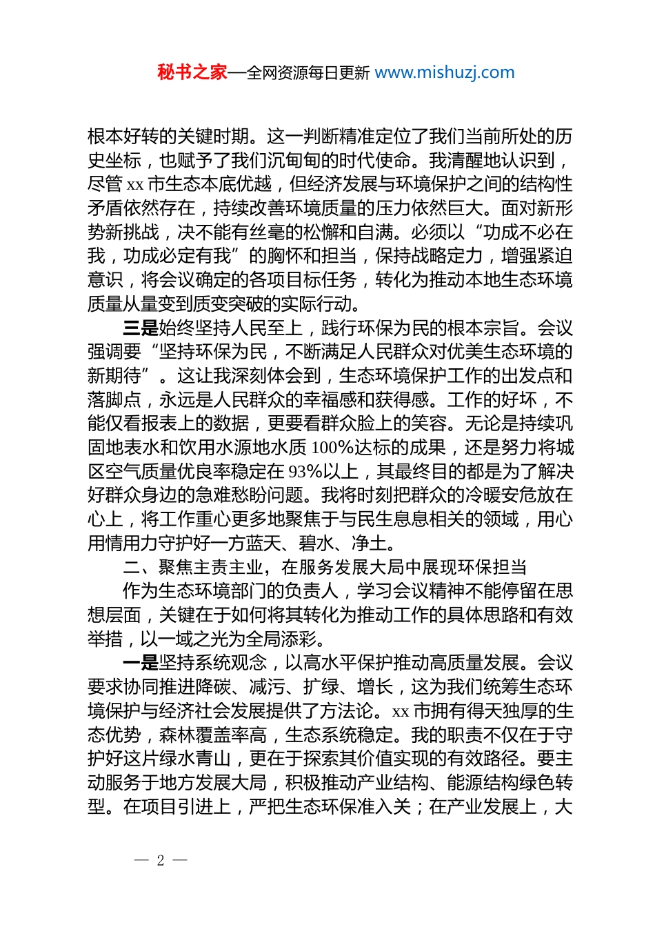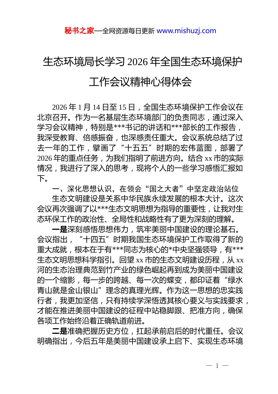秘书之家—全网资源每日更新 www.mishuzj.com生态环境局长学习 2026 年全国生态环境保护工作会议精神心得体会2026 年 1 月 14 日至 15 日,全国生态环境保护工作会议在北京召开。作为一名基层生态环境部门的负责同志,通过深入学习会议精神,特别是***书记的讲话和***部长的工作报告,我深受教育、倍感振奋,也深感责任重大。会议系统总结了过去一年的工作,擘画了“十五五”时期的宏伟蓝图,部署了2026 年的重点任务,为我们指明了前进方向。结合 xx 市的实际情况,我进行了深入的思考,现将个人的一些学习感悟汇报如下。一、深化思想认识,在领会“国之大者”中坚定政治站位生态文明建设是关系中华民族永续发展的根本大计。这次会议再次强调了以***生态文明思想为指导的重要性,让我对生态环保工作的政治性、全局性和战略性有了更为深刻的理解。一是深刻感悟思想伟力,筑牢美丽中国建设的理论基石。会议指出,“十四五”时期我国生态环境保护工作取得了新的重大成就,根本在于有***同志为核心的*中央坚强领导,有***生态文明思想科学指引。回望 xx 市的生态文明建设历程,从 xx河的生态治理典范到竹产业的绿色崛起再到成为美丽中国建设的一个缩影,每一步的跨越、每一次的蝶变,都印证着“绿水青山就是金山银山”理念的真理光辉。作为这一思想的忠实践行者,我更加坚信,只有持续学深悟透其核心要义与实践要求,才能在推进美丽中国建设的征程中站稳脚跟、把准方向,确保各项工作始终沿着正确轨道前进。二是准确把握历史方位,扛起承前启后的时代重任。会议明确指出,今后五年是美丽中国建设承上启下、实现生态环境— 1 —秘书之家—全网资源每日更新 www.mishuzj.com根本好转的关键时期。这一判断精准定位了我们当前所处的历史坐标,也赋予了我们沉甸甸的时代使命。我清醒地认识到,尽管 xx 市生态本底优越,但经济发展与环境保护之间的结构性矛盾依然存在,持续改善环境质量的压力依然巨大。面对新形势新挑战,决不能有丝毫的松懈和自满。必须以“功成不必在我,功成必定有我”的胸怀和担当,保持战略定力,增强紧迫意识,将会议确定的各项目标任务,转化为推动本地生态环境质量从量变到质变突破的实际行动。三是始终坚持人民至上,践行环保为民的根本宗旨。会议强调要“坚持环保为民,不断满足人民群众对优美生态环境的新期待”。这让我深刻体会到,生态环境保护工作的出发点和落脚点,永远是人民群众的幸福感和获得感。工作的好坏,不能仅看报表上的数据,更要看群众脸上的笑容。无论是持续巩固地表水和饮用水源地水质 100%达标的成果,还是努力将城区空气质量优良率稳定在 93%以上,其最终目的都是为了解决好群众身边的急难愁盼问题。我将时刻把群众的冷暖安危放在心上,将工作重心更多地聚焦于与民生息息相关的领域,用心用情用力守护好一方蓝天、碧水、净土。二、聚焦主责主业,在服务发展大局中展现环保担当作为生态环境部门的负责人,学习会议精神不能停留在思想层面,关键在于如何将其转化为推动工作的具体思路和有效举措,以一域之光为全局添彩。一是坚持系统观念,以高水平保护推动高质量发展。会议要求协同推进降碳、减污、扩绿、增长,这为我们统筹生态环境保护与经济社会发展提供了方法论。xx 市拥有得天独厚的生态优势,森林覆盖率高,生态系统稳定。我的职责不仅在于守护好这片绿水青山,更在于探索其价值实现的有效路径。要主动服务于地方发展大局,积极推动产业结构、能源结构绿色转型。在项目引进上,严把生态环保准入关;在产业发展上,大— 2 —秘书之家—全网资源每日更新 www.mishuzj.com力支持生态旅游、竹精深加工等绿色产业,着力增强绿色发展动能,让高水平的生态环境保护成为高质量发展的鲜明底色和强劲引擎,避免重蹈“先污染后治理”的覆辙。二是坚持问题导向,以精准治污攻克顽瘴痼疾。会议再次强调了精准治污、科学治污、依法治污的重要性。生态环境问题的解决,不可能一蹴而就,必须下“绣花”功夫。我将带领团队,紧盯中央生态环保督察反馈问题整改不放松,建立清单式管理台账,确保件件有着落、事事有回音。同时...