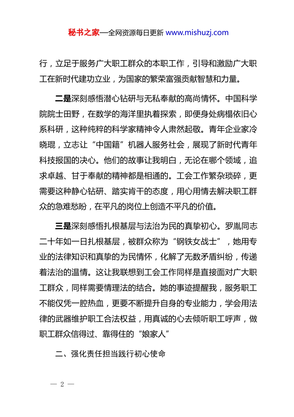 秘书之家—全网资源每日更新 www.mishuzj.com市总工会*员干部观看《榜样 10》专题节目感悟2026 年 1 月 22 日,我怀着崇敬的心情,认真观看了《榜样10》专题节目。节目中每一位榜样、每一个先进集体的事迹,如同一盏盏明灯,照亮了前行的道路,也深深涤荡了我的心灵。作为**市总工会的一名普通*员,这次学习不仅是一次精神上的洗礼,更是一次思想上的深刻自省。我从榜样的身上,看到了信念的力量、担当的可贵和奉献的无华。一、筑牢信仰根基汲取榜样力量信仰是共产*人精神上的“钙”,是抵御一切诱惑、战胜一切困难的根本。榜样们的事迹,正是对坚定信仰最生动的诠释。一是深刻感悟科技报国与实干兴邦的磅礴伟力。从茹振钢教授躬耕麦田,用一粒粒良种筑牢国家粮食安全的根基,到梁建英院士带领团队让中国高铁领跑世界,我深刻体会到,将个人理想融入国家发展大局是何等壮阔。作为一名工会*员,我的岗位虽然平凡,但同样是服务国家发展战略的一环。他们的事迹激励我,要将对*忠诚、为国分忧的信念,内化于心、外化于— 1 —秘书之家—全网资源每日更新 www.mishuzj.com行,立足于服务广大职工群众的本职工作,引导和激励广大职工在新时代建功立业,为国家的繁荣富强贡献智慧和力量。二是深刻感悟潜心钻研与无私奉献的高尚情怀。中国科学院院士田野,在数学的海洋里执着探索,即便身处病榻依旧心系科研,这种纯粹的科学家精神令人肃然起敬。青年企业家冷晓琨,立志让“中国籍”机器人服务社会,展现了新时代青年科技报国的决心。他们的故事让我明白,无论在哪个领域,追求卓越、甘于奉献的精神都是相通的。工会工作繁杂琐碎,更需要这种静心钻研、踏实肯干的态度,用心用情去解决职工群众的急难愁盼,在平凡的岗位上创造不平凡的价值。三是深刻感悟扎根基层与法治为民的真挚初心。罗胤同志二十年如一日扎根基层,被群众称为“钢铁女战士”,她用专业的法律知识和真挚的为民情怀,化解了无数矛盾纠纷,传递着法治的温情。这让我联想到工会工作同样是直接面对广大职工群众,同样需要情理法的结合。她的事迹提醒我,服务职工不能仅凭一腔热血,更要不断提升自身的专业能力,学会用法律的武器维护职工合法权益,用真诚的心去倾听职工呼声,做职工群众信得过、靠得住的“娘家人”二、强化责任担当践行初心使命— 2 —秘书之家—全网资源每日更新 www.mishuzj.com榜样们的先进事迹,无一不体现着强烈的责任感与使命感他们用实际行动诠释了什么是共产*人的担当。一是坚持敢为人先的开拓精神。无论是“义新欧”班列*支部在中欧班列开行之初攻坚克难,还是空军 95944 部队 60 分队*支部在实战练兵中淬炼本领,都展现了敢于面对挑战、勇于开拓创新的精神。工会工作在新时代也面临着许多新情况、新问题。我从中感悟到,不能墨守成规,必须具备开拓创新的勇气。面对职工群众日益多元化的需求,要敢于探索服务职工的新模式、新方法,让工会工作更加贴近基层、贴近职工,更具时代感和生命力。二是发扬甘为人梯的奉献情怀。茹振钢教授无偿将科技成果转化收益奉献给团队,梁建英院士倾心培养年轻工程师,他们身上“甘为人梯”的情怀深深打动了我。作为一名*员,不仅要做好自己的本职工作,更有责任和义务去帮助和带动身边的同事共同进步。在工会这个大家庭里,我愿意将自己的工作经验和学习心得与年轻同事分享,相互学习,共同成长,形成一种团结协作、奋发向上的良好氛围,共同把服务职工的事业做好。三是践行实干兴邦的务实作风。榜样们的事迹没有豪言壮— 3 —秘书之家—全网资源每日更新 www.mishuzj.com语,只有脚踏实地的行动和数十年如一日的坚守。田野院士的潜心研究,罗胤同志的十年坚持,都彰显了“空谈误国、实干兴邦”的朴素真理。工会工作直接关系到职工的切身利益,来不得半点虚假和懈怠。这要求我在工作中必须保持求真务实的作风,对待每一项工作任务,都要做到认真细致,抓铁有痕,确保*和政府的关怀以及工会组织的温暖,能够不折不扣地传递到每一位职工心中。三、永葆清廉本色坚守纪律底线清正廉洁是共产*人的政治本色,也是每一位*员干部的立身之本。榜样们不...