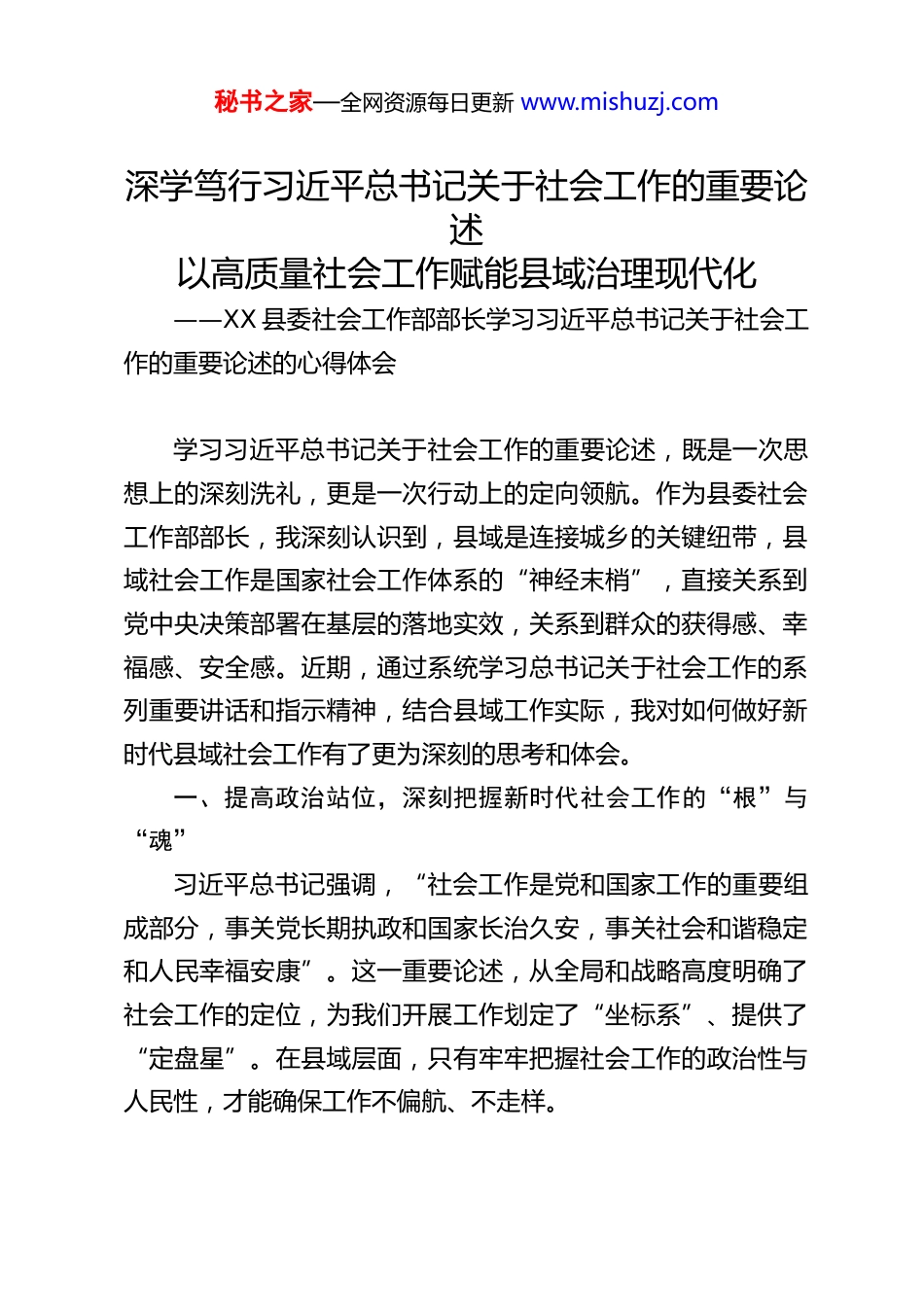 秘书之家—全网资源每日更新 www.mishuzj.com深学笃行习近平总书记关于社会工作的重要论述以高质量社会工作赋能县域治理现代化——XX 县委社会工作部部长学习习近平总书记关于社会工作的重要论述的心得体会学习习近平总书记关于社会工作的重要论述,既是一次思想上的深刻洗礼,更是一次行动上的定向领航。作为县委社会工作部部长,我深刻认识到,县域是连接城乡的关键纽带,县域社会工作是国家社会工作体系的“神经末梢”,直接关系到党中央决策部署在基层的落地实效,关系到群众的获得感、幸福感、安全感。近期,通过系统学习总书记关于社会工作的系列重要讲话和指示精神,结合县域工作实际,我对如何做好新时代县域社会工作有了更为深刻的思考和体会。一、提高政治站位,深刻把握新时代社会工作的“根”与“魂”习近平总书记强调,“社会工作是党和国家工作的重要组成部分,事关党长期执政和国家长治久安,事关社会和谐稳定和人民幸福安康”。这一重要论述,从全局和战略高度明确了社会工作的定位,为我们开展工作划定了“坐标系”、提供了“定盘星”。在县域层面,只有牢牢把握社会工作的政治性与人民性,才能确保工作不偏航、不走样。秘书之家—全网资源每日更新 www.mishuzj.com从政治性维度看,县域社会工作的核心是“姓党”。不同于西方社工机构的专业性服务,我国的社会工作本质是党的社会工作,根本任务是巩固党在基层的执政基础。我县作为农业大县,既有传统农村地区的群众,也有随城镇化进程涌现的新市民,还有快递小哥、网约车司机等新就业群体,群众结构日益多元。如果不能通过有效的社会工作把各类群体团结在党的周围,就可能出现“组织覆盖不到位、思想引领有盲区”的问题。近年来,我们通过建立“县委—乡镇党委—村(社区)党组织—网格党小组”四级社会工作体系,将党的领导贯穿于社会工作各环节,在 12 个乡镇成立社会工作专班,在 236 个村(社区)配备专职社工,正是为了把党的政治优势、组织优势转化为治理优势,让党的旗帜在基层一线高高飘扬。从人民性维度看,县域社会工作的底色是“为民”。总书记指出,“要坚持以人民为中心,践行新时代党的群众路线”。县域群众的需求最具体、最实在,无论是农村老人的养老问题、留守儿童的教育问题,还是城镇社区的矛盾调解、新就业群体的权益保障,都是社会工作的重中之重。去年以来,我们聚焦群众“急难愁盼”,开展“暖民行动”:在农村建设 15 个“幸福院”,解决独居老人“吃饭难”;在城区打造 8 个“新就业群体暖心驿站”,提供饮水、充电、歇脚等服务;建立“百姓议事厅”机制,全年化解邻里矛盾 180 余件。这些实践让我深刻体会到,只有把“群众满意”作为检验工作的唯一标秘书之家—全网资源每日更新 www.mishuzj.com准,把服务做到群众心坎上,才能让社会工作真正成为党联系群众的“连心桥”。二、聚焦重点任务,找准县域社会工作的“破题点”与“发力点”习近平总书记对社会工作提出明确要求:“突出抓好新经济组织、新社会组织、新就业群体党的建设,抓好党建引领基层治理和基层政权建设,抓好凝聚服务群众工作”。这“三个抓好”既是国家层面的工作部署,也是县域社会工作的“任务书”。结合我县实际,我们必须找准工作的切入点,以重点突破带动整体提升。在“两新”组织党建上,关键是破解“覆盖难、作用弱”问题。我县现有新经济组织 56 家、新社会组织 32 家,涵盖电商、物流、农业合作社等领域,但部分组织存在“有组织无党员、有党员无活动”的情况。针对这一问题,我们采取“分类施策、精准发力”策略:对有 3 名以上党员的“两新”组织,单独建立党组织,如在县电商产业园成立党支部,带动 20 余名党员发挥技术优势,帮助农户销售农产品超千万元;对党员人数不足的,采取“行业联建、区域统建”方式,如将 8 家小型物流企业纳入交通运输行业党支部管理;同时选派 45 名党建指导员,下沉到“两新”组织,既指导党建工作,又帮助解决实际困难,今年已为企业协调贷款、对接资源等问题 23 件,真正实现“党建强、发展强”的双向共赢。秘书之家—全网资源每日更新 www....