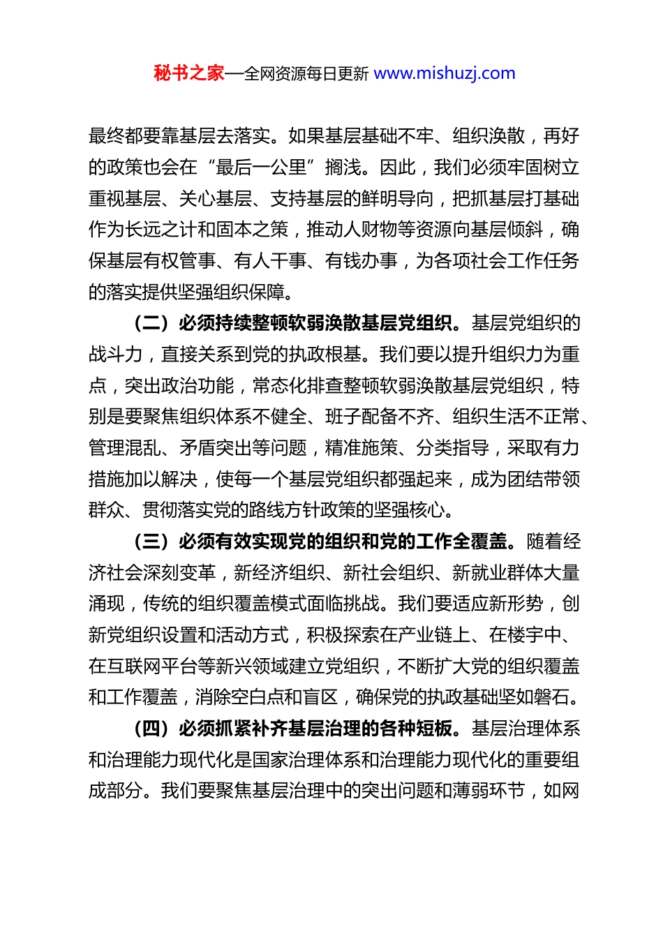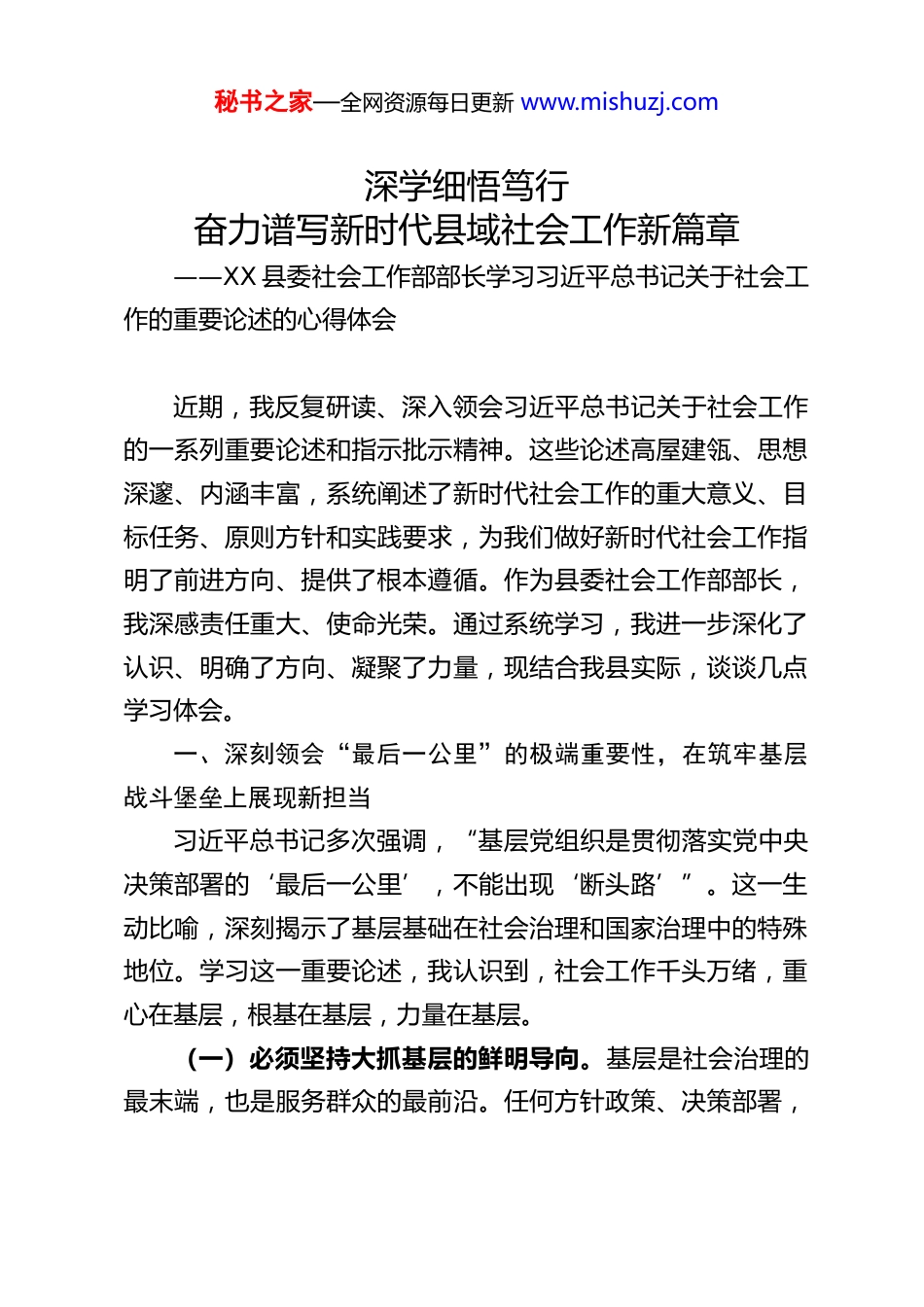 秘书之家—全网资源每日更新 www.mishuzj.com深学细悟笃行奋力谱写新时代县域社会工作新篇章——XX 县委社会工作部部长学习习近平总书记关于社会工作的重要论述的心得体会近期,我反复研读、深入领会习近平总书记关于社会工作的一系列重要论述和指示批示精神。这些论述高屋建瓴、思想深邃、内涵丰富,系统阐述了新时代社会工作的重大意义、目标任务、原则方针和实践要求,为我们做好新时代社会工作指明了前进方向、提供了根本遵循。作为县委社会工作部部长,我深感责任重大、使命光荣。通过系统学习,我进一步深化了认识、明确了方向、凝聚了力量,现结合我县实际,谈谈几点学习体会。一、深刻领会“最后一公里”的极端重要性,在筑牢基层战斗堡垒上展现新担当习近平总书记多次强调,“基层党组织是贯彻落实党中央决策部署的‘最后一公里’,不能出现‘断头路’”。这一生动比喻,深刻揭示了基层基础在社会治理和国家治理中的特殊地位。学习这一重要论述,我认识到,社会工作千头万绪,重心在基层,根基在基层,力量在基层。(一)必须坚持大抓基层的鲜明导向。基层是社会治理的最末端,也是服务群众的最前沿。任何方针政策、决策部署,秘书之家—全网资源每日更新 www.mishuzj.com最终都要靠基层去落实。如果基层基础不牢、组织涣散,再好的政策也会在“最后一公里”搁浅。因此,我们必须牢固树立重视基层、关心基层、支持基层的鲜明导向,把抓基层打基础作为长远之计和固本之策,推动人财物等资源向基层倾斜,确保基层有权管事、有人干事、有钱办事,为各项社会工作任务的落实提供坚强组织保障。(二)必须持续整顿软弱涣散基层党组织。基层党组织的战斗力,直接关系到党的执政根基。我们要以提升组织力为重点,突出政治功能,常态化排查整顿软弱涣散基层党组织,特别是要聚焦组织体系不健全、班子配备不齐、组织生活不正常、管理混乱、矛盾突出等问题,精准施策、分类指导,采取有力措施加以解决,使每一个基层党组织都强起来,成为团结带领群众、贯彻落实党的路线方针政策的坚强核心。(三)必须有效实现党的组织和党的工作全覆盖。随着经济社会深刻变革,新经济组织、新社会组织、新就业群体大量涌现,传统的组织覆盖模式面临挑战。我们要适应新形势,创新党组织设置和活动方式,积极探索在产业链上、在楼宇中、在互联网平台等新兴领域建立党组织,不断扩大党的组织覆盖和工作覆盖,消除空白点和盲区,确保党的执政基础坚如磐石。(四)必须抓紧补齐基层治理的各种短板。基层治理体系和治理能力现代化是国家治理体系和治理能力现代化的重要组成部分。我们要聚焦基层治理中的突出问题和薄弱环节,如网秘书之家—全网资源每日更新 www.mishuzj.com格化管理不够精细、服务群众能力不足、信息化支撑不强、矛盾纠纷化解机制不健全等,下大力气研究解决,加快补齐短板弱项,不断提升基层治理效能,切实把各领域基层党组织建设成为实现党的领导的坚强战斗堡垒。二、准确把握新时代群众工作的规律特点,在践行党的群众路线上达到新高度习近平总书记深刻指出,“现在,群众工作对象更加多元群众诉求更加多样,群众工作环境更加复杂”,并要求我们“深入研究和准确把握新形势下群众工作的特点和规律,改进群众工作方法,提高群众工作水平”。这些重要论述,为我们做好新时代群众工作提供了科学指引。(一)必须深刻认识群众工作的新变化新挑战。当前,我国社会结构、利益格局、思想观念发生深刻变化,群众的民主意识、法治意识、权利意识不断增强,对美好生活的向往呈现多层次、多样化的特点。同时,互联网的快速发展改变了信息传播和人际交往方式,给群众工作带来了新的机遇和挑战。我们必须保持清醒头脑,深入研究这些新变化,准确把握不同群体、不同领域的诉求特点和工作规律,增强工作的预见性、针对性和有效性。(二)必须坚持和践行新时代党的群众路线。群众路线是党的生命线和根本工作路线。走好新时代群众路线,要求我们必须放下架子、扑下身子,深入实际、深入群众,与群众面对秘书之家—全网资源每日更新 www.mishuzj.com面、心贴心交流。要在躬身实践中增进对群众的感情...
