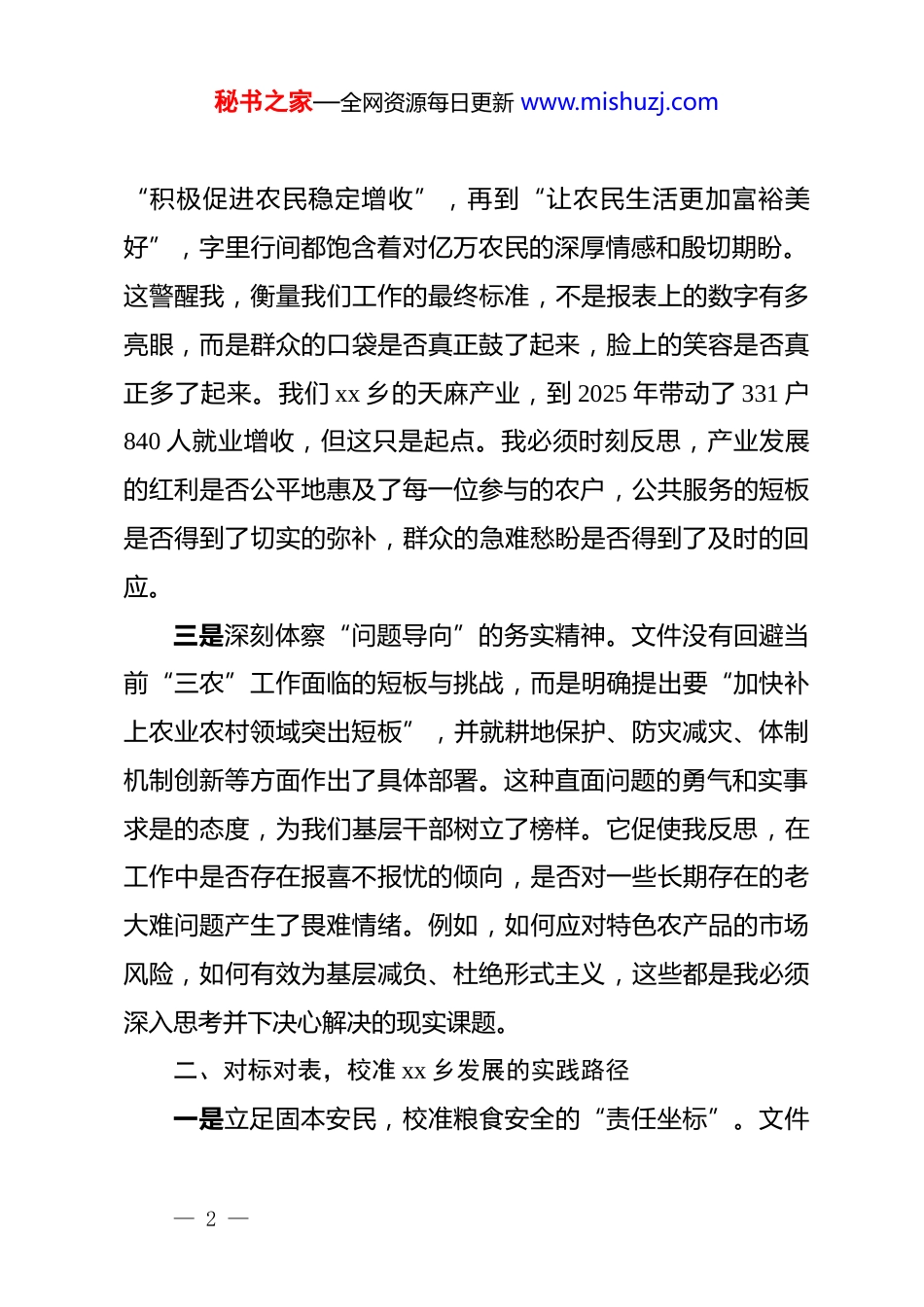秘书之家—全网资源每日更新 www.mishuzj.com乡镇*委书记学习 2026 年中央一号文件精神心得体会2026 年是“十五五”规划的开局之年,中央一号文件如期而至,为新一年的“三农”工作指明了方向,擘画了蓝图。作为一名乡镇*委书记,我第一时间组织并参与了中心组的专题学习。通过逐字逐句的研读和深入思考,我对文件精神有了更深刻的领会,对自己肩负的责任有了更清醒的认识。下面,我结合个人思想和工作实际,谈几点不成熟的心得体会。一、深学细悟,把握乡村振兴的时代方位一是深刻领悟“国之大者”的战略高度。文件开宗明义指出,“农业农村现代化关系中国式现代化全局和成色”。这让我深切感受到,我们身处基层一线,所做的每一项工作,都并非偏于一隅的琐碎事务,而是与国家发展大局紧密相连。过去,我可能更多地从本乡镇发展的角度思考问题,但现在我认识到,推动 xx 乡的发展,实际上就是在为中国式现代化夯实根基、增添成色。这份沉甸甸的责任感,要求我必须跳出“一亩三分地”的思维局限,站在更高的站位上谋划和推进工作。二是深刻体悟“民之关切”的价值取向。文件通篇贯穿着以人民为中心的发展思想,从“守牢国家粮食安全底线”到— 1 —秘书之家—全网资源每日更新 www.mishuzj.com“积极促进农民稳定增收”,再到“让农民生活更加富裕美好”,字里行间都饱含着对亿万农民的深厚情感和殷切期盼。这警醒我,衡量我们工作的最终标准,不是报表上的数字有多亮眼,而是群众的口袋是否真正鼓了起来,脸上的笑容是否真正多了起来。我们 xx 乡的天麻产业,到 2025 年带动了 331 户840 人就业增收,但这只是起点。我必须时刻反思,产业发展的红利是否公平地惠及了每一位参与的农户,公共服务的短板是否得到了切实的弥补,群众的急难愁盼是否得到了及时的回应。三是深刻体察“问题导向”的务实精神。文件没有回避当前“三农”工作面临的短板与挑战,而是明确提出要“加快补上农业农村领域突出短板”,并就耕地保护、防灾减灾、体制机制创新等方面作出了具体部署。这种直面问题的勇气和实事求是的态度,为我们基层干部树立了榜样。它促使我反思,在工作中是否存在报喜不报忧的倾向,是否对一些长期存在的老大难问题产生了畏难情绪。例如,如何应对特色农产品的市场风险,如何有效为基层减负、杜绝形式主义,这些都是我必须深入思考并下决心解决的现实课题。二、对标对表,校准 xx 乡发展的实践路径一是立足固本安民,校准粮食安全的“责任坐标”。文件— 2 —秘书之家—全网资源每日更新 www.mishuzj.com将“提升农业综合生产能力”置于首位,并明确了稳定粮食产量在 1.4 万亿斤左右的目标。xx 乡虽是山区乡镇,不是粮食主产区,但这绝不意味着我们可以置身事外。保障粮食安全是每个地方的共同责任。我将以此为准绳,重新审视全乡的耕地保护工作,坚决落实“严守耕地红线”的要求,学习借鉴一些*员干部带领群众抓好秋种、提高土地利用率的经验做法,确保每一寸耕地都真正用于农业生产,为国家粮食安全大局贡献 xx 乡的一份力量。二是立足特色优势,校准产业发展的“升级坐标”。文件强调要“培育壮大县域富民产业”,推动“农村一二三产业深度融合”。这为 xx 乡的产业发展指明了方向。我们的天麻产业已初具规模,2025 年种植面积达到 70 万平方米,年产量 473 吨。但对标文件要求,我感到我们还有很长的路要走。下一步,我将思考如何推动天麻产业从单纯的种植向精深加工、品牌培育延伸,提升附加值。同时,要深入挖掘我们乡保存完好的土家花灯等民俗文化资源,探索农文旅融合的新路径,避免产业发展的同质化和“一哄而上”,真正把资源优势转化为经济优势和发展胜势。三是立足治理效能,校准乡村建设的“创新坐标”。文件提出要“提升乡村治理水平”,并对数字乡村建设提出了新要— 3 —秘书之家—全网资源每日更新 www.mishuzj.com求。当前,数字技术正深刻改变着社会生活的方方面面。我认识到,不能再用老眼光看待乡村治理。我将积极学习借鉴“院落微治理”等先进模式,探索利用数字平台推动村务公开、线上议事,让治理更加透明、高效。同...
