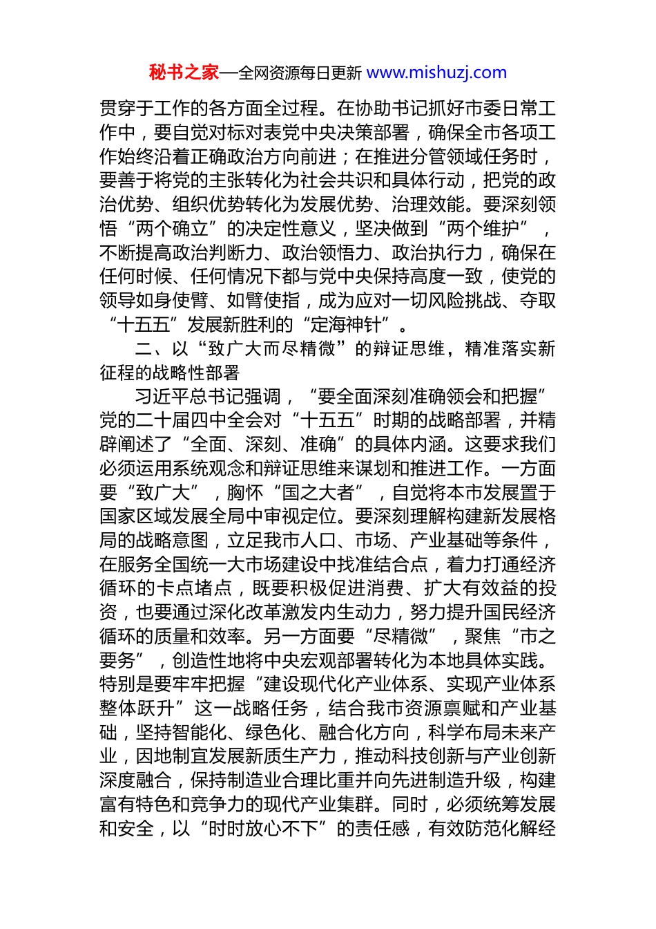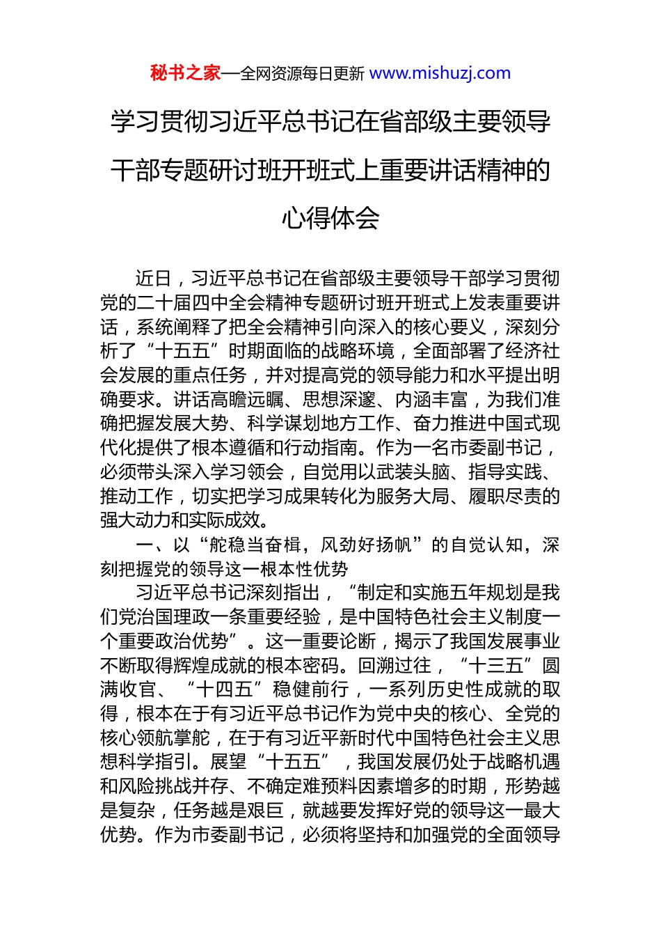 秘书之家—全网资源每日更新 www.mishuzj.com学习贯彻习近平总书记在省部级主要领导干部专题研讨班开班式上重要讲话精神的心得体会近日,习近平总书记在省部级主要领导干部学习贯彻党的二十届四中全会精神专题研讨班开班式上发表重要讲话,系统阐释了把全会精神引向深入的核心要义,深刻分析了“十五五”时期面临的战略环境,全面部署了经济社会发展的重点任务,并对提高党的领导能力和水平提出明确要求。讲话高瞻远瞩、思想深邃、内涵丰富,为我们准确把握发展大势、科学谋划地方工作、奋力推进中国式现代化提供了根本遵循和行动指南。作为一名市委副书记,必须带头深入学习领会,自觉用以武装头脑、指导实践、推动工作,切实把学习成果转化为服务大局、履职尽责的强大动力和实际成效。一、以“舵稳当奋楫,风劲好扬帆”的自觉认知,深刻把握党的领导这一根本性优势习近平总书记深刻指出,“制定和实施五年规划是我们党治国理政一条重要经验,是中国特色社会主义制度一个重要政治优势”。这一重要论断,揭示了我国发展事业不断取得辉煌成就的根本密码。回溯过往,“十三五”圆满收官、“十四五”稳健前行,一系列历史性成就的取得,根本在于有习近平总书记作为党中央的核心、全党的核心领航掌舵,在于有习近平新时代中国特色社会主义思想科学指引。展望“十五五”,我国发展仍处于战略机遇和风险挑战并存、不确定难预料因素增多的时期,形势越是复杂,任务越是艰巨,就越要发挥好党的领导这一最大优势。作为市委副书记,必须将坚持和加强党的全面领导秘书之家—全网资源每日更新 www.mishuzj.com贯穿于工作的各方面全过程。在协助书记抓好市委日常工作中,要自觉对标对表党中央决策部署,确保全市各项工作始终沿着正确政治方向前进;在推进分管领域任务时,要善于将党的主张转化为社会共识和具体行动,把党的政治优势、组织优势转化为发展优势、治理效能。要深刻领悟“两个确立”的决定性意义,坚决做到“两个维护”,不断提高政治判断力、政治领悟力、政治执行力,确保在任何时候、任何情况下都与党中央保持高度一致,使党的领导如身使臂、如臂使指,成为应对一切风险挑战、夺取“十五五”发展新胜利的“定海神针”。二、以“致广大而尽精微”的辩证思维,精准落实新征程的战略性部署习近平总书记强调,“要全面深刻准确领会和把握”党的二十届四中全会对“十五五”时期的战略部署,并精辟阐述了“全面、深刻、准确”的具体内涵。这要求我们必须运用系统观念和辩证思维来谋划和推进工作。一方面要“致广大”,胸怀“国之大者”,自觉将本市发展置于国家区域发展全局中审视定位。要深刻理解构建新发展格局的战略意图,立足我市人口、市场、产业基础等条件,在服务全国统一大市场建设中找准结合点,着力打通经济循环的卡点堵点,既要积极促进消费、扩大有效益的投资,也要通过深化改革激发内生动力,努力提升国民经济循环的质量和效率。另一方面要“尽精微”,聚焦“市之要务”,创造性地将中央宏观部署转化为本地具体实践。特别是要牢牢把握“建设现代化产业体系、实现产业体系整体跃升”这一战略任务,结合我市资源禀赋和产业基础,坚持智能化、绿色化、融合化方向,科学布局未来产业,因地制宜发展新质生产力,推动科技创新与产业创新深度融合,保持制造业合理比重并向先进制造升级,构建富有特色和竞争力的现代产业集群。同时,必须统筹发展和安全,以“时时放心不下”的责任感,有效防范化解经秘书之家—全网资源每日更新 www.mishuzj.com济金融、社会稳定、安全生产等各领域风险,筑牢安全发展屏障,为实现高质量发展提供稳定环境。三、以“为者常成,行者常至”的务实姿态,着力锤炼堪当重任的硬核性本领习近平总书记谆谆告诫,“顺利完成‘十五五’时期目标任务,必须着力提高党领导经济社会发展能力和水平”。这既是对全党的要求,更是对各级领导干部的鞭策。面对新形势新任务,作为市委副书记,深感能力提升的紧迫性和必要性。必须把加强学习作为第一要务,不仅要深钻党的创新理论,把握其世界观、方法论,也要钻研经济、科技、法律、管理等专业知识,克服本领恐慌,...