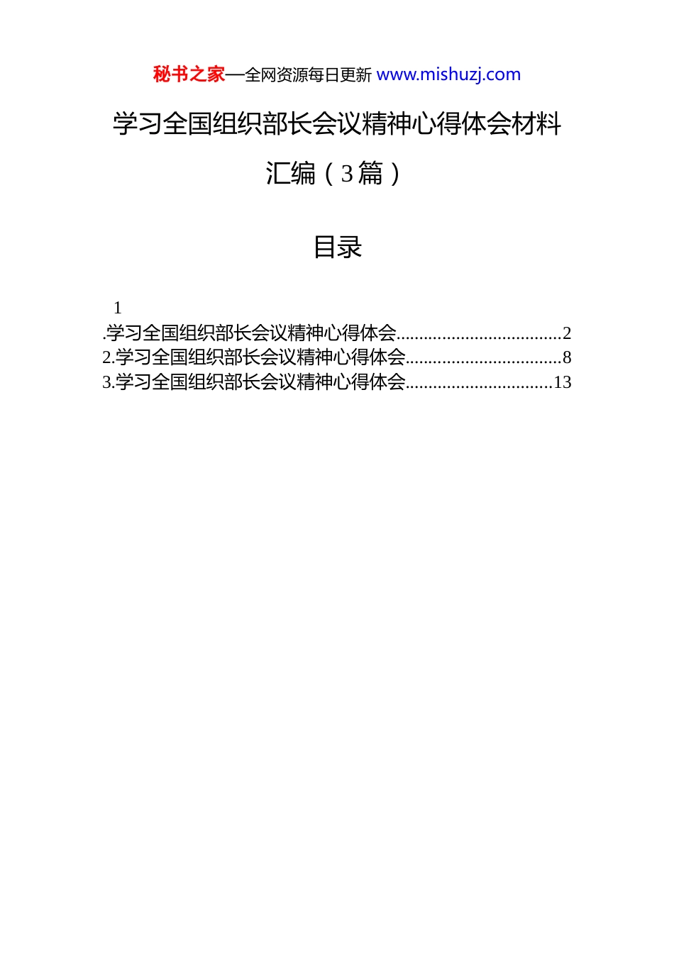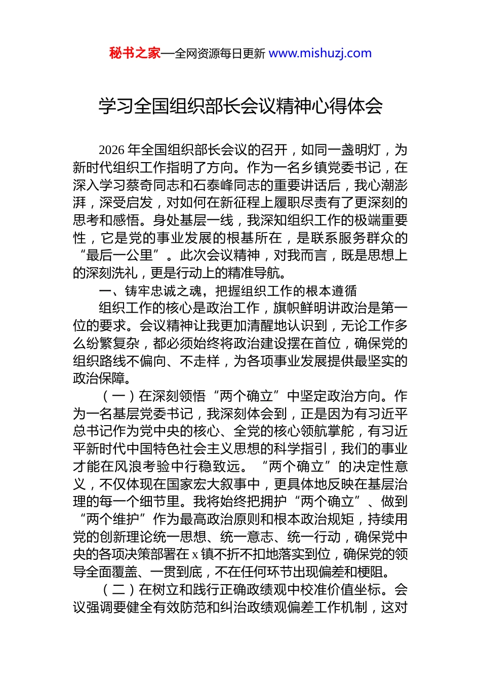 秘书之家—全网资源每日更新 www.mishuzj.com学习全国组织部长会议精神心得体会材料汇编(3 篇)目录1.学习全国组织部长会议精神心得体会....................................22.学习全国组织部长会议精神心得体会..................................83.学习全国组织部长会议精神心得体会................................13秘书之家—全网资源每日更新 www.mishuzj.com学习全国组织部长会议精神心得体会2026 年全国组织部长会议的召开,如同一盏明灯,为新时代组织工作指明了方向。作为一名乡镇党委书记,在深入学习蔡奇同志和石泰峰同志的重要讲话后,我心潮澎湃,深受启发,对如何在新征程上履职尽责有了更深刻的思考和感悟。身处基层一线,我深知组织工作的极端重要性,它是党的事业发展的根基所在,是联系服务群众的“最后一公里”。此次会议精神,对我而言,既是思想上的深刻洗礼,更是行动上的精准导航。一、铸牢忠诚之魂,把握组织工作的根本遵循组织工作的核心是政治工作,旗帜鲜明讲政治是第一位的要求。会议精神让我更加清醒地认识到,无论工作多么纷繁复杂,都必须始终将政治建设摆在首位,确保党的组织路线不偏向、不走样,为各项事业发展提供最坚实的政治保障。(一)在深刻领悟“两个确立”中坚定政治方向。作为一名基层党委书记,我深刻体会到,正是因为有习近平总书记作为党中央的核心、全党的核心领航掌舵,有习近平新时代中国特色社会主义思想的科学指引,我们的事业才能在风浪考验中行稳致远。“两个确立”的决定性意义,不仅体现在国家宏大叙事中,更具体地反映在基层治理的每一个细节里。我将始终把拥护“两个确立”、做到“两个维护”作为最高政治原则和根本政治规矩,持续用党的创新理论统一思想、统一意志、统一行动,确保党中央的各项决策部署在 x 镇不折不扣地落实到位,确保党的领导全面覆盖、一贯到底,不在任何环节出现偏差和梗阻。(二)在树立和践行正确政绩观中校准价值坐标。会议强调要健全有效防范和纠治政绩观偏差工作机制,这对秘书之家—全网资源每日更新 www.mishuzj.com我触动很深。在乡镇工作,最容易陷入追求短期效应、打造“盆景”工程的诱惑。我时常反思,我的工作究竟是为了谁?是为了一时的赞誉,还是为了群众长远的福祉?会议精神警醒我,必须坚持出于公心、实事求是,把工作的出发点和落脚点真正放到为民造福上。我将带头加强正确政绩观教育,引导全镇干部摒弃急功近利的思想,多做打基础、利长远、惠民生的实事,坚决不搞华而不实、劳民伤财的“形象工程”,以真抓实干推动 x 镇的高质量发展,创造经得起历史和人民检验的实绩。(三)在完善决策部署落实机制中强化责任担当。确保中央政令畅通,关键在落实。我认识到,作为抓落实的“一线总指挥”,必须在机制建设上下功夫。不能满足于开了会、发了文,更要关注执行的效果和群众的反馈。我将进一步完善 x 镇党委的议事决策和执行监督机制,对上级的重大决策部署,坚持第一时间学习、第一时间研究、第一时间部署,并建立台账、明确责任、跟踪问效,形成发现问题、反馈问题、解决问题的闭环管理,以钉钉子精神推动各项工作落地生根,确保党的领导力、组织力在基层得到最充分的体现。二、锻造过硬队伍,激活干事创业的内生动力事业发展,关键在人。组织工作的根本任务,就是把干部选好、把队伍建强。作为党委书记,选人用人是我的重要职责,激发干部队伍的整体活力是我必须破解的课题。会议精神为如何建设一支忠诚干净担当的干部队伍提供了清晰的路径。(一)坚持事业为上选优配强骨干力量。会议强调要坚持正确用人导向,以换届为契机选优配强各级领导班子。这为我们即将开展的村(社区)“两委”换届工作提供了根本遵循。我将坚决把政治标准放在首位,严格考察把关,坚持事业为上、人岗相适的原则,把那些想干事、能干事、干成事,并且在群众中有口碑、有威信的优秀人秘书之家—全网资源每日更新 www.mishuzj.com才选拔到关键岗位上来。匡正选人用人风气,不仅是对事业负责,更是对干部负责、对群众负责。我将以对党和人民高度负责的态度,确保换届工作风清气正,为 ...