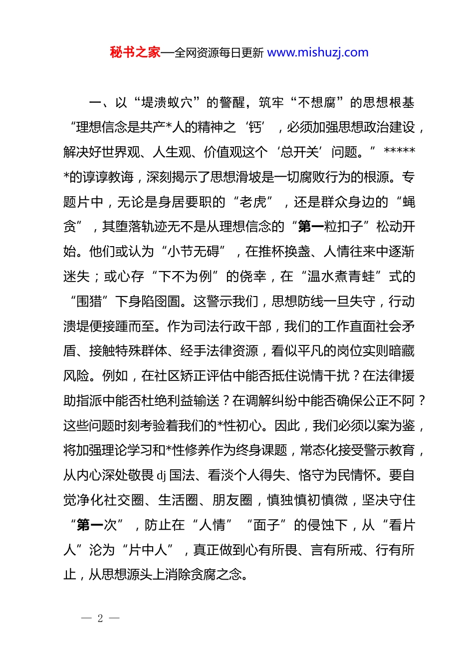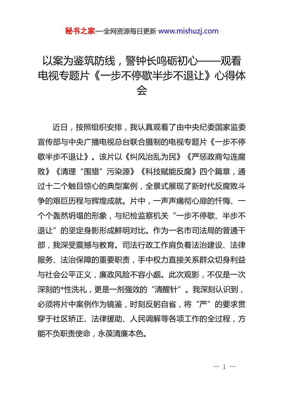 秘书之家—全网资源每日更新 www.mishuzj.com以案为鉴筑防线,警钟长鸣砺初心——观看电视专题片《一步不停歇半步不退让》心得体会近日,按照组织安排,我认真观看了由中央纪委国家监委宣传部与中央广播电视总台联合摄制的电视专题片《一步不停歇半步不退让》。该片以《纠风治乱为民》《严惩政商勾连腐败》《清理“围猎”污染源》《科技赋能反腐》四个篇章,通过十二个触目惊心的典型案例,全景式展现了新时代反腐败斗争的艰巨历程与辉煌成就。片中,一声声痛彻心扉的忏悔、一个个轰然坍塌的形象,与纪检监察机关“一步不停歇、半步不退让”的坚定身影形成鲜明对比。作为一名市司法局的普通干部,我深受震撼与教育。司法行政工作肩负着法治建设、法律服务、法治保障的重要职责,手中权力直接关系群众切身利益与社会公平正义,廉政风险不容小觑。此次观影,不仅是一次深刻的*性洗礼,更是一剂强效的“清醒针”。我深刻认识到,必须将片中案例作为镜鉴,时刻反躬自省,将“严”的要求贯穿于社区矫正、法律援助、人民调解等各项工作的全过程,方能不负职责使命,永葆清廉本色。— 1 —秘书之家—全网资源每日更新 www.mishuzj.com一、以“堤溃蚁穴”的警醒,筑牢“不想腐”的思想根基“理想信念是共产*人的精神之‘钙’,必须加强思想政治建设,解决好世界观、人生观、价值观这个‘总开关’问题。”******的谆谆教诲,深刻揭示了思想滑坡是一切腐败行为的根源。专题片中,无论是身居要职的“老虎”,还是群众身边的“蝇贪”,其堕落轨迹无不是从理想信念的“第一粒扣子”松动开始。他们或认为“小节无碍”,在推杯换盏、人情往来中逐渐迷失;或心存“下不为例”的侥幸,在“温水煮青蛙”式的“围猎”下身陷囹圄。这警示我们,思想防线一旦失守,行动溃堤便接踵而至。作为司法行政干部,我们的工作直面社会矛盾、接触特殊群体、经手法律资源,看似平凡的岗位实则暗藏风险。例如,在社区矫正评估中能否抵住说情干扰?在法律援助指派中能否杜绝利益输送?在调解纠纷中能否确保公正不阿?这些问题时刻考验着我们的*性初心。因此,我们必须以案为鉴,将加强理论学习和*性修养作为终身课题,常态化接受警示教育,从内心深处敬畏 dj 国法、看淡个人得失、恪守为民情怀。要自觉净化社交圈、生活圈、朋友圈,慎独慎初慎微,坚决守住“第一次”,防止在“人情”“面子”的侵蚀下,从“看片人”沦为“片中人”,真正做到心有所畏、言有所戒、行有所止,从思想源头上消除贪腐之念。— 2 —秘书之家—全网资源每日更新 www.mishuzj.com二、以“风腐同查”的韧劲,织密“不能腐”的作风篱笆“作风建设永远在路上,任何时候都不能松懈。”专题片《纠风治乱为民》集中揭示,不正之风是滋生腐败的温床,腐败问题往往由作风问题演变而来,必须坚持“风腐同查同治”。片中披露,许多腐败分子的违纪违法行为,始于对一顿饭、一张卡、一次公车私用等“四风”问题的麻木不仁。这表明,作风问题无小事,看似不起眼的“小管涌”,若不及时封堵,极易演变成吞噬政治生命的“大塌方”。司法行政机关是政治机关、法治部门,其作风直接关系到司法公信力和政府形象。结合我的工作实际,必须深刻反思:在接待来访群众时,是否存在态度生硬、推诿塞责的现象?在开展法治宣传、执法监督时,是否存在形式主义、走过场的问题?在管理使用办公经费、公共资源时,是否做到了厉行节约、规范透明?这些日常工作中的作风细节,正是检验我们是否真正做到“以人民为中心”的试金石。我们必须以“一步不停歇”的执着,严格执行中央八项规定及其实施细则精神,将整治群众身边不正之风和腐败问题作为分内之责。要聚焦法律服务、行政审批、刑罚执行等关键环节,深入排查廉政风险点,紧盯可能存在的“吃拿卡要”、庸政懒政等作风顽疾,做到早发现、早提醒、早纠正。通过严肃的作风锤炼,确保权力的每一个运行环节都受到有效约束,— 3 —秘书之家—全网资源每日更新 www.mishuzj.com让歪风邪气无处遁形,从行为机制上阻断由风及腐的通道。三、以“科技赋能”的锐眼,扎紧“不敢腐”的制度笼子“要健全权力运行制约和监督...