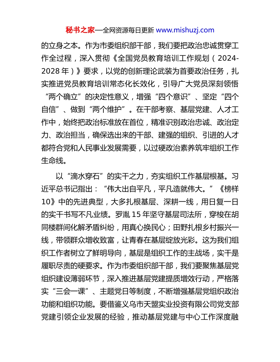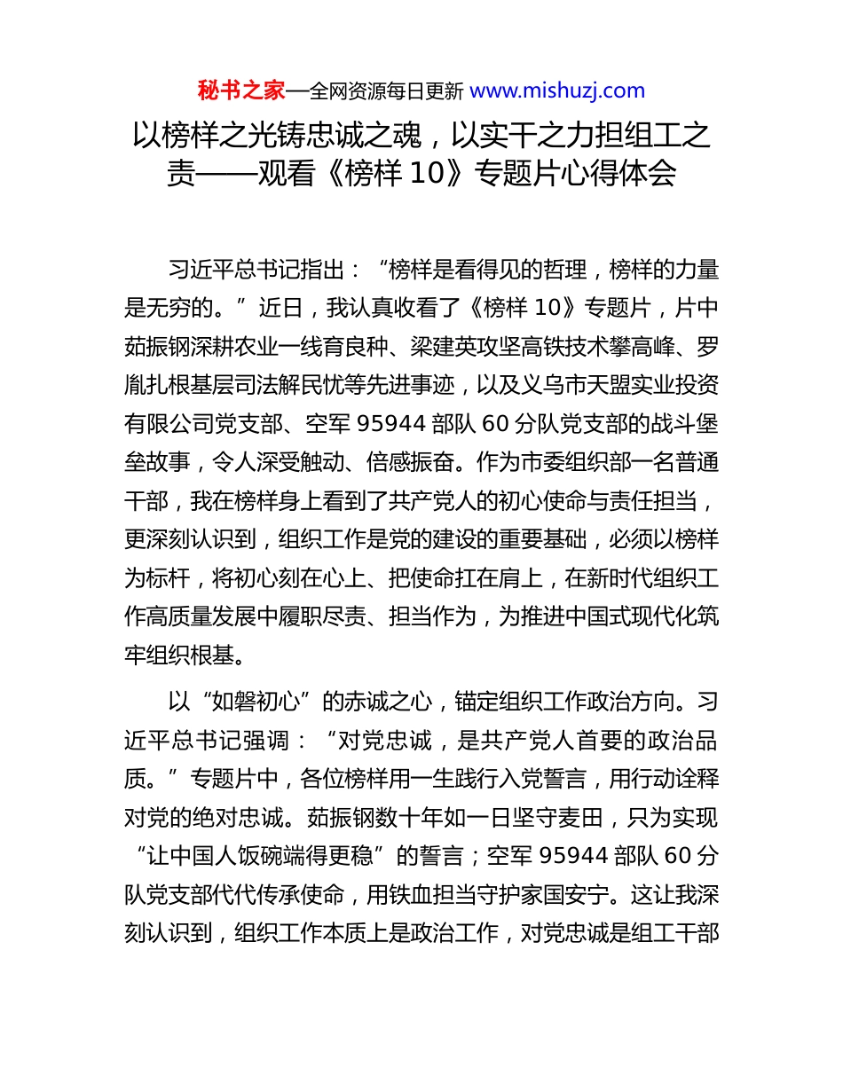 秘书之家—全网资源每日更新 www.mishuzj.com以榜样之光铸忠诚之魂,以实干之力担组工之责——观看《榜样 10》专题片心得体会习近平总书记指出:“榜样是看得见的哲理,榜样的力量是无穷的。”近日,我认真收看了《榜样 10》专题片,片中茹振钢深耕农业一线育良种、梁建英攻坚高铁技术攀高峰、罗胤扎根基层司法解民忧等先进事迹,以及义乌市天盟实业投资有限公司党支部、空军 95944 部队 60 分队党支部的战斗堡垒故事,令人深受触动、倍感振奋。作为市委组织部一名普通干部,我在榜样身上看到了共产党人的初心使命与责任担当,更深刻认识到,组织工作是党的建设的重要基础,必须以榜样为标杆,将初心刻在心上、把使命扛在肩上,在新时代组织工作高质量发展中履职尽责、担当作为,为推进中国式现代化筑牢组织根基。以“如磐初心”的赤诚之心,锚定组织工作政治方向。习近平总书记强调:“对党忠诚,是共产党人首要的政治品质。”专题片中,各位榜样用一生践行入党誓言,用行动诠释对党的绝对忠诚。茹振钢数十年如一日坚守麦田,只为实现“让中国人饭碗端得更稳”的誓言;空军 95944 部队 60 分队党支部代代传承使命,用铁血担当守护家国安宁。这让我深刻认识到,组织工作本质上是政治工作,对党忠诚是组工干部秘书之家—全网资源每日更新 www.mishuzj.com的立身之本。作为市委组织部干部,我们要把政治忠诚贯穿工作全过程,深入贯彻《全国党员教育培训工作规划(2024-2028 年)》要求,以党的创新理论武装为首要政治任务,扎实推进党员教育培训常态化长效化,引导广大党员深刻领悟“两个确立”的决定性意义,增强“四个意识”、坚定“四个自信”、做到“两个维护”。在干部考察、基层党建、人才工作中,始终把政治标准放在首位,精准识别政治忠诚、政治定力、政治担当,确保选出来的干部、建强的组织、引进的人才都符合党和人民事业发展需要,以过硬政治素养筑牢组织工作生命线。以“滴水穿石”的实干之力,夯实组织工作基层根基。习近平总书记指出:“伟大出自平凡,平凡造就伟大。”《榜样10》中的先进典型,大多扎根基层、深耕一线,用日复一日的实干书写不凡业绩。罗胤 15 年坚守基层司法所,穿梭在胡同楼群间化解矛盾纠纷,用真心换民心;田野扎根乡村振兴一线,带领群众增收致富,让青春在基层绽放光彩。这为我们组织工作者树立了鲜明导向,基层是组织工作的主战场,实干是履职尽责的硬要求。作为市委组织部干部,我们要聚焦基层党组织建设薄弱环节,深入推进基层党建提质增效行动,严格落实“三会一课”、主题党日等制度,不断增强基层党组织政治功能和组织功能。要借鉴义乌市天盟实业投资有限公司党支部党建引领企业发展的经验,推动基层党建与中心工作深度融秘书之家—全网资源每日更新 www.mishuzj.com合,在乡村振兴、基层治理、产业发展中发挥党组织战斗堡垒作用。要坚持深入基层、深入群众,常态化开展调研走访,精准掌握基层党组织运行、干部队伍建设、党员作用发挥等情况,找准问题症结、拿出破解之策,以“钉钉子”精神把组织工作各项任务落到实处,让党的旗帜在基层一线高高飘扬。以“甘为人梯”的奉献之德,涵养组织工作优良作风。习近平总书记强调:“我们共产党人讲奉献,就要有一颗为党为人民矢志奋斗的心。”专题片中,榜样们不计名利、无私奉献,用奉献诠释共产党人的精神底色。梁建英潜心钻研高铁技术,放弃诸多机会,把毕生精力投入到祖国轨道交通事业;冷晓琨扎根科技前沿,带领团队攻坚克难,用创新成果赋能高质量发展。这让我深刻体会到,组织工作者作为“管干部的干部、管党员的党员”,更要涵养无私奉献、甘为人梯的优良作风。作为市委组织部干部,我们要学习榜样们淡泊名利、甘于奉献的精神,始终把党和人民的利益放在首位,在干部选拔任用中坚持公道正派,不徇私情、不谋私利,当好干部成长的“铺路石”。要严格落实党纪学习教育常态化长效化要求,时刻绷紧纪律规矩这根弦,严守组织人事纪律和保密纪律,做到心有所畏、言有所戒、行有所止。要立足岗位实际,主动担当作为,面对组织工作中的难点堵点问题,敢于迎难而上、善于攻坚克...