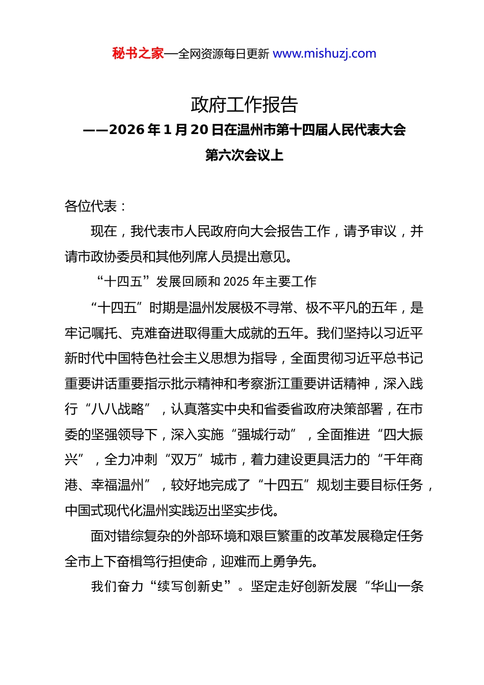 秘书之家—全网资源每日更新 www.mishuzj.com政府工作报告——2026 年 1 月 20 日在温州市第十四届人民代表大会第六次会议上各位代表:现在,我代表市人民政府向大会报告工作,请予审议,并请市政协委员和其他列席人员提出意见。“十四五”发展回顾和 2025 年主要工作“十四五”时期是温州发展极不寻常、极不平凡的五年,是牢记嘱托、克难奋进取得重大成就的五年。我们坚持以习近平新时代中国特色社会主义思想为指导,全面贯彻习近平总书记重要讲话重要指示批示精神和考察浙江重要讲话精神,深入践行“八八战略”,认真落实中央和省委省政府决策部署,在市委的坚强领导下,深入实施“强城行动”,全面推进“四大振兴”,全力冲刺“双万”城市,着力建设更具活力的“千年商港、幸福温州”,较好地完成了“十四五”规划主要目标任务,中国式现代化温州实践迈出坚实步伐。面对错综复杂的外部环境和艰巨繁重的改革发展稳定任务全市上下奋楫笃行担使命,迎难而上勇争先。我们奋力“续写创新史”。坚定走好创新发展“华山一条秘书之家—全网资源每日更新 www.mishuzj.com路”,统筹推进“五大创新”,持续擦亮“创新”这个最大的金字招牌,习近平总书记复信肯定温州肯恩大学办学成果,世界青年科学家峰会汇聚全球创新资源,建成千万平方大孵化器集群,实现“百万人才聚温州”,跻身全国最具人才吸引力城市 20 强;坚定扛起探路者使命担当,累计承接国家级重大改革试点 155 个,320 多项改革经验在全国全省复制推广。我们提速“打造第三极”。坚持发展硬道理,做强经济硬实力,地区生产总值突破万亿大关、排名前移至全国第 28 位、重返地级市 10 强。推动浙南区域合作发展,探索市域空间管理“不变体制变机制”,加快“五城三园”建设,巩固提升科技、教育、文化、医疗带动服务能力,区域中心城市加速崛起。长三角地区主要领导座谈会、省委城市工作会议在温召开。我们聚力“抓好关键事”。牢牢把握产业型城市定位,大力推进实体经济攀高向强,工业总产值突破 1.5 万亿元,夺得全省首批“浙江制造天工鼎”金鼎;把扩大开放摆在突出位置,港产城融合发展再行起势,金丽温开放大通道纳入国家总体开放布局,近洋航运中心、国际陆港、区域性国际航空枢纽提速建设;高质量协办第 19 届亚运会,数安大会共绘数智未来,海丝大会链接五洲四海,世界温州人大会凝聚乡情力量,侨创会激发青创活力。秘书之家—全网资源每日更新 www.mishuzj.com我们坚定“走好共富路”。以缩小“三大差距”为主攻方向,着力破解“高山低谷”问题,平阳、永嘉、苍南调出山区海岛县名单,城乡居民人均可支配收入分别提高到 84347 元、46446 元,城乡收入倍差从 1.96 缩小至 1.82;以满足群众美好生活需要为价值取向,全龄友好建设、公共服务“七优享”实现国家级试点全覆盖,夺得全国文明城市“四连冠”,连续七年获评最具幸福感城市。五年来,我们把产业振兴作为强市之基,动能转换成势见效。创新浓度加速提升。 全社会 R&D 经费投入年均增长14.2%,国家创新型城市排名进入全国前 30%,城市科技创新竞争力排名全国第 26 位,高新技术企业数量实现翻番。教科人一体改革发展有力推进,温州医科大学团队项目获国家自然科学奖二等奖,温州大学增列为博士学位授予单位,温州理工学院获批设立,新增全国重点实验室和国家级技术中心各 2 家,累计引育香港理工、南洋理工温州研究院等高能级科创平台 75家,顶尖人才实现“从 1 到 30”的跃升。“一港五谷”竞相发力,中国数安港打造大模型应用等十大社区,中国眼谷投用 57万方科创园区,基因药谷加快建设“生长因子之城”,国际云软件谷集聚数字经济企业超 3000 家,新光谷激光产业产值达230 亿元,智能谷人工智能产业营收超百亿。秘书之家—全网资源每日更新 www.mishuzj.com产业集群做优做强。开展“336X”重点产业培育攻坚,电气产业入选国家先进制造业集群,永嘉泵阀、乐清通信连接器、平阳印刷包装装备入选国家中小企业特色产业集群,落地华东深远海风电母港、打造 3000 亿级新能源产业集群,跻身中国数字百强市 20 强。...
