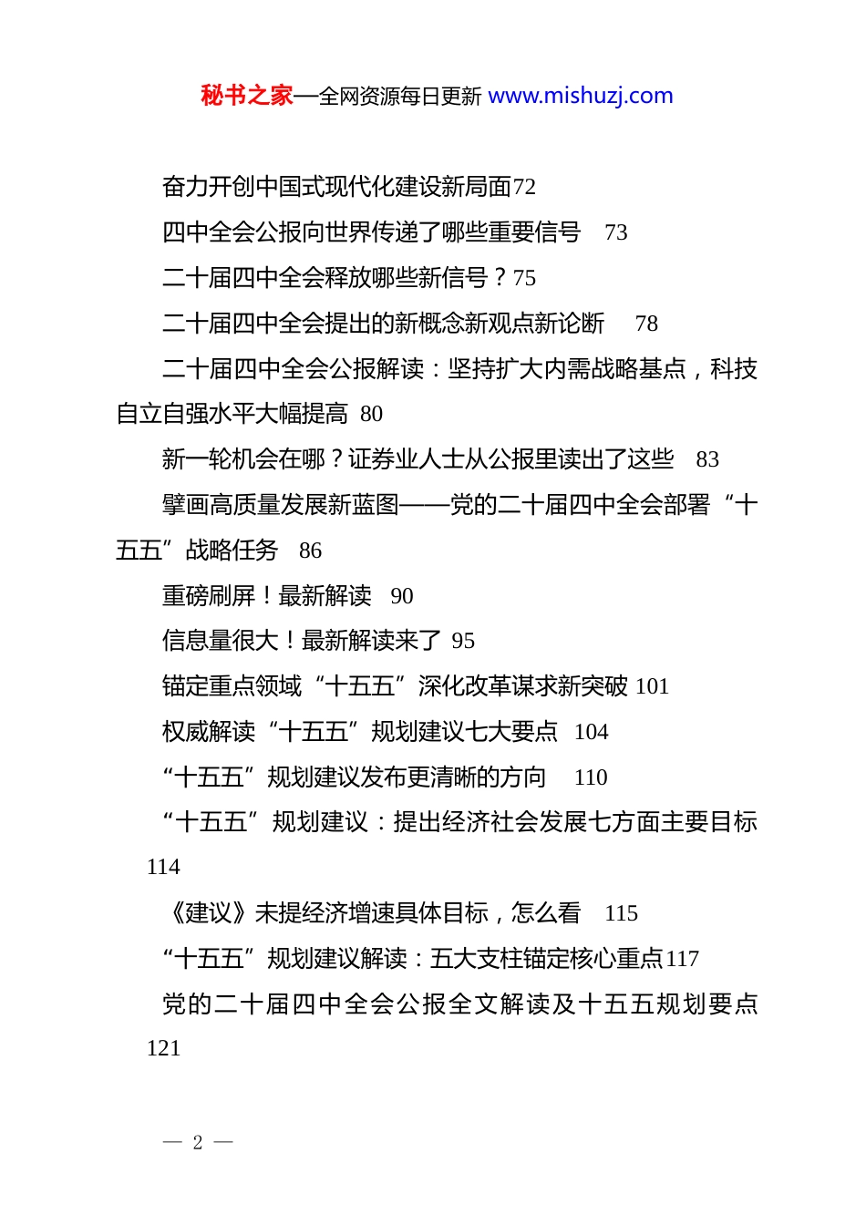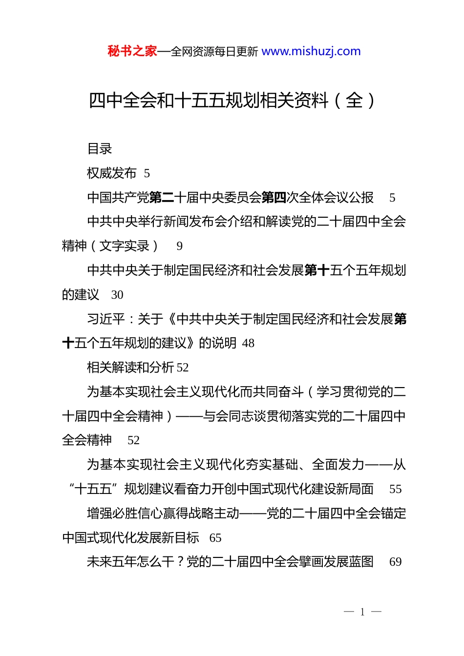 秘书之家—全网资源每日更新 www.mishuzj.com四中全会和十五五规划相关资料(全)目录权威发布 5中国共产党第二十届中央委员会第四次全体会议公报5中共中央举行新闻发布会介绍和解读党的二十届四中全会精神(文字实录)9中共中央关于制定国民经济和社会发展第十五个五年规划的建议30习近平:关于《中共中央关于制定国民经济和社会发展第十五个五年规划的建议》的说明 48相关解读和分析 52为基本实现社会主义现代化而共同奋斗(学习贯彻党的二十届四中全会精神)——与会同志谈贯彻落实党的二十届四中全会精神52为基本实现社会主义现代化夯实基础、全面发力——从“十五五”规划建议看奋力开创中国式现代化建设新局面55增强必胜信心赢得战略主动——党的二十届四中全会锚定中国式现代化发展新目标65未来五年怎么干?党的二十届四中全会擘画发展蓝图69— 1 —秘书之家—全网资源每日更新 www.mishuzj.com奋力开创中国式现代化建设新局面72四中全会公报向世界传递了哪些重要信号73二十届四中全会释放哪些新信号?75二十届四中全会提出的新概念新观点新论断78二十届四中全会公报解读:坚持扩大内需战略基点,科技自立自强水平大幅提高 80新一轮机会在哪?证券业人士从公报里读出了这些83擘画高质量发展新蓝图——党的二十届四中全会部署“十五五”战略任务86重磅刷屏!最新解读90信息量很大!最新解读来了 95锚定重点领域“十五五”深化改革谋求新突破 101权威解读“十五五”规划建议七大要点 104“十五五”规划建议发布更清晰的方向110“十五五”规划建议:提出经济社会发展七方面主要目标114《建议》未提经济增速具体目标,怎么看115“十五五”规划建议解读:五大支柱锚定核心重点117党的二十届四中全会公报全文解读及十五五规划要点121— 2 —秘书之家—全网资源每日更新 www.mishuzj.com华福证券:迈入中等发达国家水平的关键时期 127华泰证券:承前启后,全面“进阶”的十五五 129中信建投:“十五五”规划建议稿解读 131张奥平:四中全会公报解读——“十五五”时期市场七大机遇与重点产业方向 135付一夫:如何理解“投资于物与投资于人紧密结合”?145从“十五五”全球热词看中国新机遇 150署名文章 152李强:“十五五”时期经济社会发展的指导方针 152丁薛祥:“十五五”时期经济社会发展的主要目标157郑栅洁:高质量做好“十五五”规划编制工作 161蔡奇:持之以恒推进全面从严治党167张玉卓:持续推动央企与各类企业共享机遇、共谋发展、共创未来171以推动高质量发展为主题奋力开创中国式现代化建设新局面——多部门负责人在《〈中共中央关于制定国民经济和社会发展第十五个五年规划的建议〉辅导读本》发表署名文章172广西壮族自治区主席韦韬:为开创中国式现代化建设新局— 3 —秘书之家—全网资源每日更新 www.mishuzj.com面担当实干 178山东省委书记林武:努力打造北方地区经济重要增长极182领导讲话 188上海市:学习贯彻党的二十届四中全会精神中央宣讲团报告会举行188天津市:学习贯彻党的二十届四中全会精神学习贯彻党的二十届四中全会精神中央宣讲团报告会在津举行190重庆市:学习贯彻党的二十届四中全会精神中央宣讲团宣讲报告会在渝举行192重庆市:市委召开全市领导干部会议传达学习贯彻党的二十届四中全会精神194江西省:学习贯彻党的二十届四中全会精神中央宣讲团报告会在昌举行 197江西省:召开领导干部会议强调深入学习宣传贯彻党的二十届四中全会精神凝心聚力担当实干谱写中国式现代化江西篇章 198广东省:传达学习贯彻党的二十届四中全会精神干部大会召开 200河南省:刘宁主持召开省级党员领导干部会议宣讲党的二— 4 —秘书之家—全网资源每日更新 www.mishuzj.com十届四中全会精神202湖北省:王忠林主持研究“十五五”规划建议起草工作深入学习贯彻党的二十届四中全会精神高质高效完成我省“十五五”规划建议起草任务 203深圳市:全市传达学习贯彻党的二十届四中全会精神干部大会召开204权威发布中国共产党第二十届中央委员会第四次全体会议公报(2025 年 10 月 23 日中国共产党第二十届中央委员会第四次全体会议通...