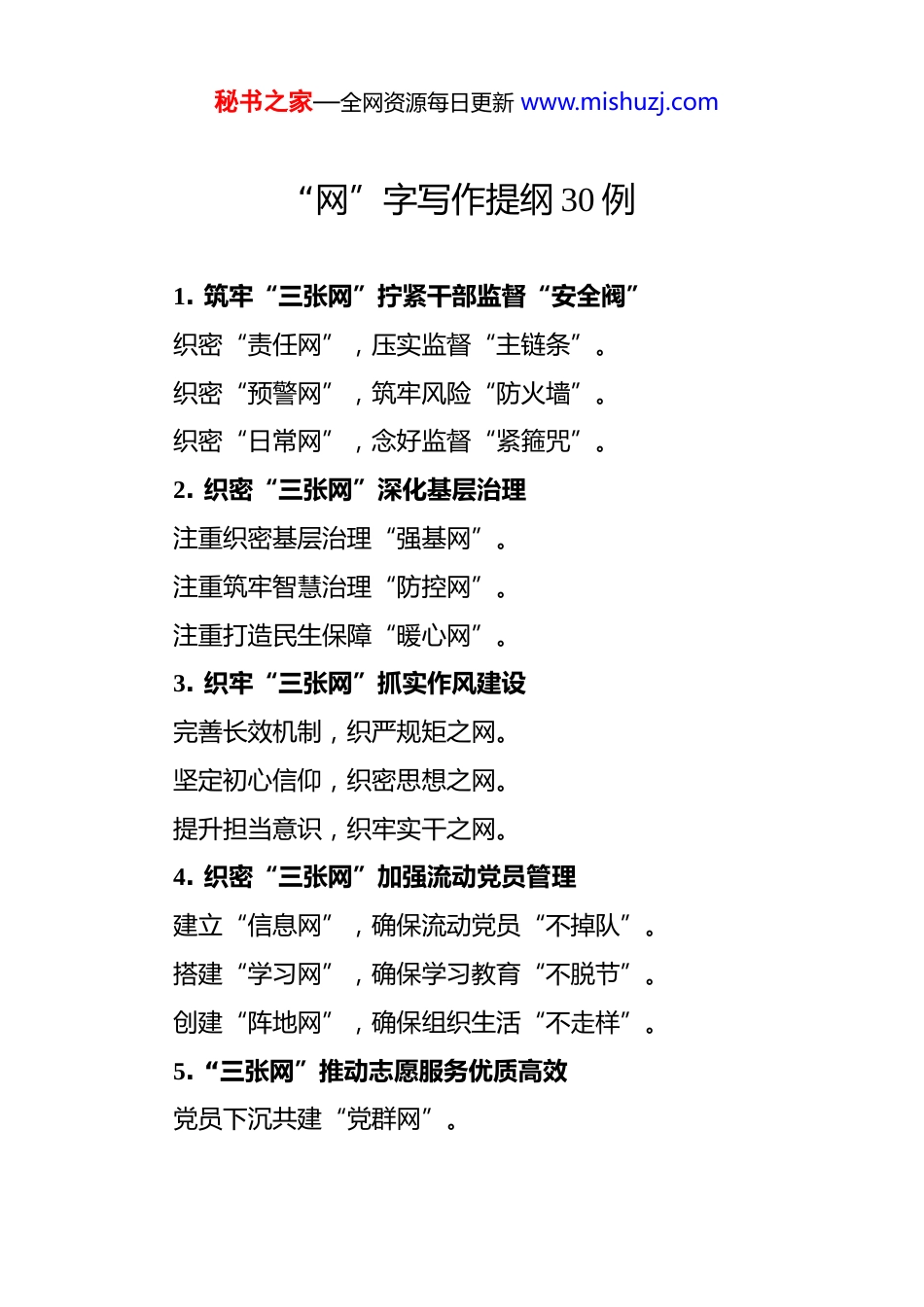 秘书之家—全网资源每日更新 www.mishuzj.com“网”字写作提纲 30 例 1. 筑牢“三张网”拧紧干部监督“安全阀”织密“责任网”,压实监督“主链条”。织密“预警网”,筑牢风险“防火墙”。织密“日常网”,念好监督“紧箍咒”。2. 织密“三张网”深化基层治理注重织密基层治理“强基网”。注重筑牢智慧治理“防控网”。注重打造民生保障“暖心网”。3. 织牢“三张网”抓实作风建设完善长效机制,织严规矩之网。坚定初心信仰,织密思想之网。提升担当意识,织牢实干之网。4. 织密“三张网”加强流动党员管理建立“信息网”,确保流动党员“不掉队”。搭建“学习网”,确保学习教育“不脱节”。创建“阵地网”,确保组织生活“不走样”。5. “三张网”推动志愿服务优质高效党员下沉共建“党群网”。秘书之家—全网资源每日更新 www.mishuzj.com全程跟踪织密“沟通网”。立足需求打造“服务网”。6. 织密“三张网”推动农村党建提质增效织密“考核网”,提升工作质效。织密“人才网”,激活党建活力。织密“服务网”,绘就幸福生活。7. 密织“三张网”提升为民服务实效密织组织体系网,推动网格管理全覆盖。密织共驻共建网,推动问题解决高效能。密织居民服务网,推动为民服务零距离。8. 织密“三张网”打通基层治理“神经末梢”强化组织保障,夯实“党建网”。做细治理单元,搭建“互动网”。延伸管理触角,筑牢“服务网”。9. 坚持党建引领 织密织牢基层治理“三张网”组织建设筑根基,织起基层治理“保障网”。多元共治聚合力,织密基层治理“共治网”。为民服务办实事,织牢基层治理“连心网”。10. 织密“三张网”提升驻村帮扶硬实力上下联动织密学习培训网。秘书之家—全网资源每日更新 www.mishuzj.com齐抓共管织严管理机制网。多维支持织牢激励保障网。11. 织密“三张网”锻造驻村帮扶硬队伍织密学习培训网。织严管理机制网。织牢激励保障网。12. 织好“三张网”筑牢防返贫致贫“防火墙”织好政治“保障网”,夯实防返贫致贫基线。织好制度“组织网”,拓宽防返贫致贫路线。织好预警“监测网”,筑牢防返贫致贫底线。13. 巧构“三张网”扎实稳步推进公务员登记工作织好政策“明白网”。织牢审核“监督网”。织密服务“保障网”。14. 织密干部监督“三张网”,为高质量发展保驾护航抓早抓小,织密“日常监督网”。精准发力,织密“专项监督网”。建章立制,织密“长效监督网”。15. 织密年轻干部教育监督“三张网”护航青苗茁壮成长常念纪律“紧箍咒”,拧紧思想“总开关”。秘书之家—全网资源每日更新 www.mishuzj.com早打思想“预防针”,筑牢廉政“防火墙”。勤扎制度“铁篱笆”,织密成长“守护网”。16. 织密“三张网”助推党员教育管理提质增效织密“组织网”,凝心聚力强基础。织密“管理网”,提升党员队伍质量。织密“服务网”,架起干群“连心桥”。17. 织密“三张网”加强公务员管理工作严把关口,织密“过滤网”。规范管理,织密“信息网”。关心关爱,织密“鼓励网”。18. 城乡管理三张网 统揽民生大小事建强“组织网”,一网聚合服务资源力量。用好“收集网”,一网兜起群众急难愁盼。织密“服务网”,一网打尽民生难题要事。19. 穿“针”引“线”织好基层治理“三张网”穿“全局针”引“覆盖线”,为基层治理织出“集成”网。穿“为民针”引“服务线”,为人民群众织出“幸福”网。穿“责任针”引“落实线”,为规范运作织出“制度”网。20. 织密防控“四张网”坚决打赢阻击战加强组织领导,织密防控工作“责任网”。秘书之家—全网资源每日更新 www.mishuzj.com上下通力协作,织密疫情传播“排查网”。力求广而告之,织密防控知识“宣传网”。强化物资保障,织密群众需求“服务网”。21. 织密防控“四张网”筑牢群众“安全墙”建强堡垒,织严“责任网”。强化摸排,构建“监控网”。日夜坚守,筑牢“外防网”。强化引导,织密“宣传网”。22. 打造“三张网”,助力合作区高质量发展完善数据信息管控 打造“智能识别网”。推进执法问题解决 夯实“法治保护网”。深化跨区联防联控 构建“协同防控网”。23. 织密“三张网...