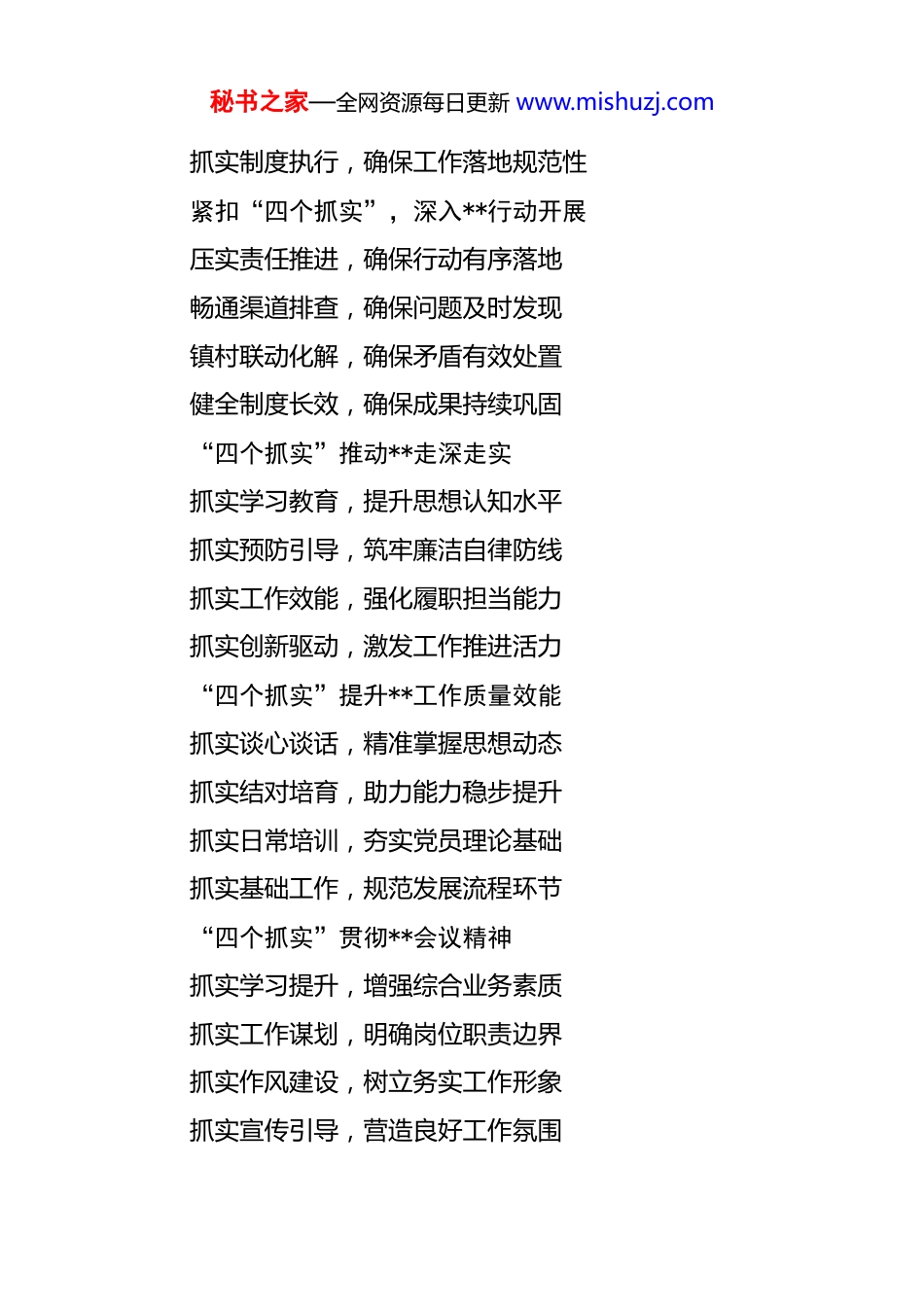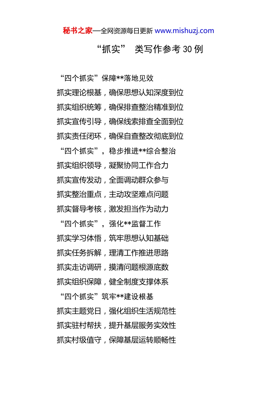 秘书之家—全网资源每日更新 www.mishuzj.com“抓实” 类写作参考 30 例 “四个抓实”保障**落地见效抓实理论根基,确保思想认知深度到位抓实组织统筹,确保排查整治精准到位抓实宣传引导,确保线索排查全面到位抓实责任闭环,确保自查整改彻底到位“四个抓实”,稳步推进**综合整治抓实组织领导,凝聚协同工作合力抓实宣传发动,全面调动群众参与抓实整治重点,主动攻坚难点问题抓实督导考核,激发担当作为动力“四个抓实”,强化**监督工作抓实学习体悟,筑牢思想认知基础抓实任务拆解,理清工作推进思路抓实走访调研,摸清问题根源底数抓实组织保障,健全制度支撑体系“四个抓实”筑牢**建设根基抓实主题党日,强化组织生活规范性抓实驻村帮扶,提升基层服务实效性抓实村级值守,保障基层运转顺畅性秘书之家—全网资源每日更新 www.mishuzj.com抓实制度执行,确保工作落地规范性紧扣“四个抓实”,深入**行动开展压实责任推进,确保行动有序落地畅通渠道排查,确保问题及时发现镇村联动化解,确保矛盾有效处置健全制度长效,确保成果持续巩固“四个抓实”推动**走深走实抓实学习教育,提升思想认知水平抓实预防引导,筑牢廉洁自律防线抓实工作效能,强化履职担当能力抓实创新驱动,激发工作推进活力“四个抓实”提升**工作质量效能抓实谈心谈话,精准掌握思想动态抓实结对培育,助力能力稳步提升抓实日常培训,夯实党员理论基础抓实基础工作,规范发展流程环节“四个抓实”贯彻**会议精神抓实学习提升,增强综合业务素质抓实工作谋划,明确岗位职责边界抓实作风建设,树立务实工作形象抓实宣传引导,营造良好工作氛围秘书之家—全网资源每日更新 www.mishuzj.com“四个抓实”推动**见行见效抓实思想教育,坚定初心使命信念抓实企业调研,提升精准服务水平抓实监管职责,守护市场安全稳定抓实队伍建设,凝聚干事创业合力“四个抓实”为**提供保障抓实法治课堂,转变基层法治思维抓实基层实践,增强群众法治观念抓实以案释法,提升全民法律素养抓实普法阵地,营造浓厚法治氛围推进“四个抓实”,精准谋划工作思路抓实高新技术培育,壮大科技创新主体队伍抓实科技招商引智,加大科技成果引进力度抓实平台创建运营,提升科技孵化服务功能抓实政策落地执行,打造良好创新生态环境“四个抓实”强化**工作成效抓实硬件建设,夯实教育基础保障抓实队伍培育,提升教育教学素质抓实管理创新,探索教育模式方法抓实活动组织,围绕中心工作发力聚焦四个抓实,打造高素质过硬队伍秘书之家—全网资源每日更新 www.mishuzj.com抓实政治引领,在理论学习中提升素养抓实岗位练兵,在履职尽责中增强本领抓实作风转变,在精准服务中提高能力抓实制度规范,在监督管理中激发动力“四个抓实”全力冲刺**目标抓实思想统一,凝聚攻坚奋进共识抓实工作进度,确保任务按时推进抓实重点突破,攻克工作难点堵点抓实监督考核,保障目标顺利达成“四个抓实”推动**提质增效抓实基层支部建设,筑牢党建工作根基抓实基层队伍建设,提升党员整体素质抓实基本阵地建设,完善党建服务载体抓实典型示范带动,营造比学赶超氛围“四个抓实”促进**稳步提升抓实集体备课,凝聚教学智慧力量抓实课堂教学,提升课堂授课质量抓实单元自测,及时掌握学习成效抓实作业监管,规范作业设计批改围绕“四个抓实”,推动**入脑入心抓深“学习环节”,强化会议精神要点掌握秘书之家—全网资源每日更新 www.mishuzj.com抓活“讨论交流”,推动学习心得分享互鉴抓实“实践转化”,促进改造效果稳步提升抓严“总结反思”,推动问题剖析及时修正“四个抓实”确保**平衡有序抓实开学防疫,筑牢校园健康防线抓实隐患排查,消除校园安全风险抓实后勤保障,满足教学运转需求抓实教学准备,保障开学顺利授课坚持“四个抓实”,加强**管理建设抓实驻村队员培养,助力能力全面提升抓实驻村工作要求,明确工作标准方向抓实驻村队员管理,规范日常工作行为抓实驻村工作建设,提升帮扶工作实效“四个抓实”推动**扎实成效开展专题培训,抓实以训促学效果开展专题宣讲,抓实以讲促学氛围开展理论考试,抓实以考促学质量观看警示视频,抓...