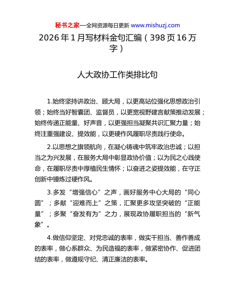 秘书之家—全网资源每日更新 www.mishuzj.com2026 年 1 月写材料金句汇编(398 页 16 万字)人大政协工作类排比句1.始终坚持讲政治、顾大局,以更高站位强化思想政治引领;始终当好智囊团、监督员,以更宽视野建言献策推动发展;始终传递正能量、好声音,以更强担当凝聚共识汇聚力量;始终注重强建设、提效能,以更硬作风履职尽责践行使命。2.以思想之旗领航向,在凝心铸魂中筑牢政治忠诚;以担当之为兴发展,在服务大局中彰显政协价值;以为民之心践使命,在履职尽责中厚植民生情怀;以奋进之姿提效能,在守正创新中锤炼过硬作风。3.多发“增强信心”之声,画好服务中心大局的“同心圆”;多献“迎难而上”之策,汇聚更多攻坚突破的“正能量”;多聚“奋发有为”之力,展现政协履职担当的“新气象”。4.做信仰坚定、对党忠诚的表率,做实干担当、善作善成的表率,做心系群众、为民造福的表率,做紧密协作、促进团结的表率,做遵规守纪、清正廉洁的表率。秘书之家—全网资源每日更新 www.mishuzj.com5.在增强服务意识上树立新观念,在形成科学决策中多出新点子,在推动工作落实上寻求新突破,在加强统筹协调上力争新作为,在提高工作水平上实现新飞跃。6.坚持守正创新、开拓进取,注重精耕细作、因地制宜,增强本领能力、敢作善为,树立鲜明导向、激扬干劲,广泛凝心聚力、团结奋斗。7.在倾听民意上“零距离”,让联系更有深度;在服务群众上“实打实”,让幸福更有质感;在凝聚共识上“心贴心”,让民生更有温度。8.是一次牢记嘱托、感恩奋进的全面对标,是一次思路清晰、举措务实的全面部署,是一次提振士气、激发斗志的全面动员。9.开出了高举旗帜、凝心铸魂的好效果,开出了团结民主、群策群力的好氛围,开出了实干笃行、奋勇争先的好局面。10.秉持团结奋斗的优良传统,落实创新突破的任务目标,在团结奋斗中服务中心大局,在创新突破中书写履职新篇。11.是一次民主求实、团结和谐的大会,是一次振奋人心、催人奋进的大会,是一次承前启后、继往开来的大会。12.是一次民主团结、凝聚共识的大会,是一次求真务实、加油鼓劲的大会,是一次擘画蓝图、续写华章的大会。秘书之家—全网资源每日更新 www.mishuzj.com13.是一次高举旗帜、团结奋进的大会,是一次凝聚共识、提振信心的大会,是一次击鼓催征、砥砺奋进的大会。14.淬炼坚如磐石的政治定力,增强共谋发展的协商效力,汇聚同心筑梦的奋进合力,提高勇担使命的履职能力。15.在同向发力服务大局上深化合作,在同题共答发展民主上密切配合,在同频共振奋勇争先上携手并进。16.听民意、察民情,架好“连心桥”;发民声、诉民愿,当好“代言人”;解民忧、纾民困,办好“暖心事”。17.在建言资政上多献良策,在民主监督上多进诤言,在社会服务上多出实招,在凝心聚力上多下功夫。18.以“初心”维护“核心”,以“言值”体现“价值”,以“共为”凝聚“共识”,以“建设”增加“建树”。19.在对标对表中把牢“大方向”,在站高谋远中绘好“新蓝图”,在开门问策中体现“引领性”。20.以高度的站位汇聚“向心力”,以开阔的视野扩大“朋友圈”,以积极的作为传播“正能量”。21.在强化监督上务实功,在增进合力上出实招,在奋勇争先上用实劲,在提升能力上求实效。22.打造思想引领新高地,展现服务大局新作为,构筑协商民主新格局,形成团结奋斗新态势。秘书之家—全网资源每日更新 www.mishuzj.com23.讲党性重品行作表率,讲实干重担当出实绩,讲宣传重凝聚强带动,讲纪律重自律守规矩。24.在参政议政中聚众智,在民主监督中建诤言,在政党协商中献良策,在社会服务中出实招。25.多形式开展协商议政,多举措创新民主监督,多渠道为民代言发声,多方位丰富界别履职。26.以更超脱的态度理性思考,以更超前的思维精准问计,以更系统的研究广泛协商。27.瞄准大事,深化政治协商;紧盯难事,加强民主监督;聚焦实事,积极参政议政。28.打造法治护航发展新范式,优化法治改善民生新路径,彰显法治促进改革新优势。29.多发“增强信心”之声,多献“迎难而上”之策,多聚“奋发有为”之力。30.建言资政有分量,凝聚共识有能量,...