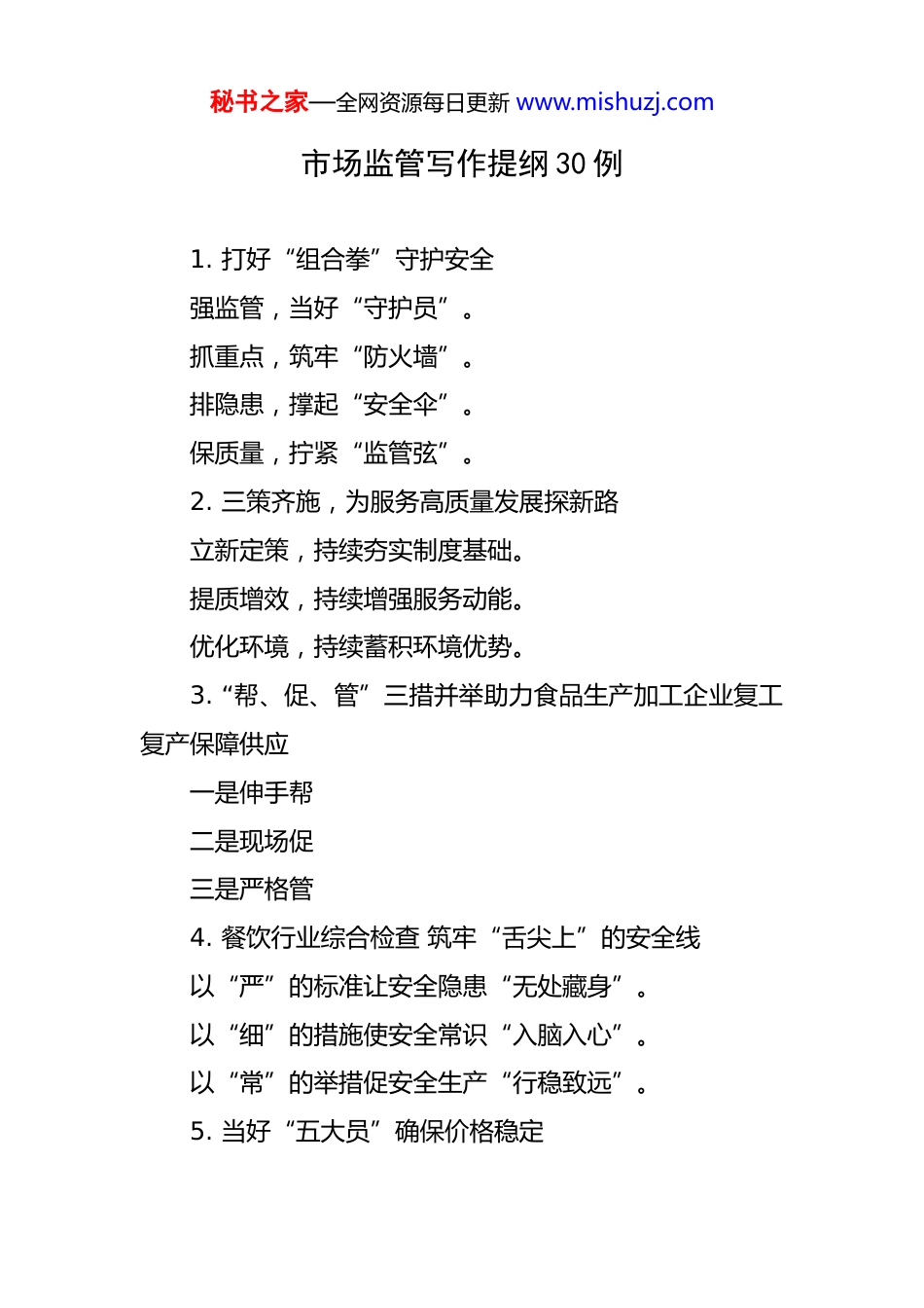 秘书之家—全网资源每日更新 www.mishuzj.com市场监管写作提纲 30 例 1. 打好“组合拳”守护安全强监管,当好“守护员”。抓重点,筑牢“防火墙”。排隐患,撑起“安全伞”。保质量,拧紧“监管弦”。2. 三策齐施,为服务高质量发展探新路立新定策,持续夯实制度基础。提质增效,持续增强服务动能。优化环境,持续蓄积环境优势。3. “帮、促、管”三措并举助力食品生产加工企业复工复产保障供应一是伸手帮二是现场促三是严格管4. 餐饮行业综合检查 筑牢“舌尖上”的安全线以“严”的标准让安全隐患“无处藏身”。以“细”的措施使安全常识“入脑入心”。以“常”的举措促安全生产“行稳致远”。5. 当好“五大员”确保价格稳定秘书之家—全网资源每日更新 www.mishuzj.com密切关注市场动态,当好价格动态“监测员”。严格市场监管执法,当好价格行为“监督员”。积极主动热情服务,当好价格监管“指导员”。加大政策宣传力度,当好价格政策“宣传员”。畅通投诉举报渠道,当好价格矛盾“调解员”。6. 四举措助力市场经济高质量发展加强组织领导,聚力精准管控。靠前对接服务,助企纾困解难。凝聚党员力量,发挥政治优势。全面履职尽责,落实保供稳价。7. 严守三条红线 加强食品生产安全监管严守“标准红线”,以规范夯实安全基础。严守“过程红线”,以监督消除风险隐患。严守“责任红线”,以执法形成有效震慑。8. 舌尖安全同守护 共治共享谱新篇主题活动“宣食安”。校园行动“筑食安”。云上宣贯“学食安”。9. 多维赋能筑基石 护航科技发展标准体系“强支撑”,抢占行业发展制高点。知识产权“强保护”,激活创新动能新引擎。秘书之家—全网资源每日更新 www.mishuzj.com检验检测“固根基”,严守产品质量基准线。精准服务“提质效”,优化产业发展生态链。10. 着力防范安全风险坚决守护“四大安全”底线当好舌尖安全“护航员”。筑牢药品安全“防火墙”。撑起特种设备“保护伞”。拧紧产品质量“安全阀”。11. “三措并举”严守药品安全底线“四个最严”强化监管执法成效强化组织领导,创新监管方式推进专项整治,守牢安全底线严查购销渠道,保障市场安全12. 高质量发展信用样板精准信用评级,夯实县域“信用基础”强化信用赋能,增值政务“信用服务”集成信用应用,深化培育“信用红利”13. 激活信用监管“新引擎”擦亮营商环境“金名片”“线上线下”强宣传。“多报合一”减负担。“联合惩戒”强监管。“信用提升”优服务。秘书之家—全网资源每日更新 www.mishuzj.com“分类处理”有温度。14. 创新社会治理深化平安建设担当新使命,凝聚工作合力。构建新机制,夯实基层基础。适应新形势,强化信息支撑。营造新环境,筑牢坚固防线。15. 聚焦行风建设,多措并举提升双随机监管效能一是监管范围大幅拓展。二是信用分类广泛应用。三是重复抽查彻底纠治。16. 三重赋能,为推动全面创新添动力专心致“质”,扎实推进质量强市建设。知产变现,发挥知识产权赋能优势。标准引领,运用标准助推产业升级。17. 三举措筑牢药品稳价保质“防护网”聚合力保障供应。全过程确保质量。多举措稳定价格。18. 筑牢食品安全防线护航“舌尖上的安全”加强领导强保障。源头治理强管控。秘书之家—全网资源每日更新 www.mishuzj.com安全隐患强排查。智慧监管强效能。从严惩处强执法。加快认证强品牌。19. 加强知识产权保护赋能经济高质量发展培育壮大总量,助力强县建设。注重转化应用,提升竞争能力。加大执法力度,保护合法权益。20. 三措并举,为优化社会治理提效能智慧监管,加速提升市场监管效能。强化执法,加大市场秩序维护力度。社会共治,加快提升基层综治水平。21. 多措并举提升旅游服务质量抓宣传引导,激发发展活力。抓服务指导,规范经营行为。抓示范创建,营造良好环境。抓执法监督,守牢安全底线。22. 打好“组合拳”守护节前安全强监管,当好“守护员”。抓重点,筑牢“防火墙”。排隐患,撑起“安全伞”。秘书之家—全网资源每日更新 www.mishuzj.com保质量,拧紧“监管弦”。23. 推动非公党建高质量发展坚持理论学习,提升政治“引领力”。坚...