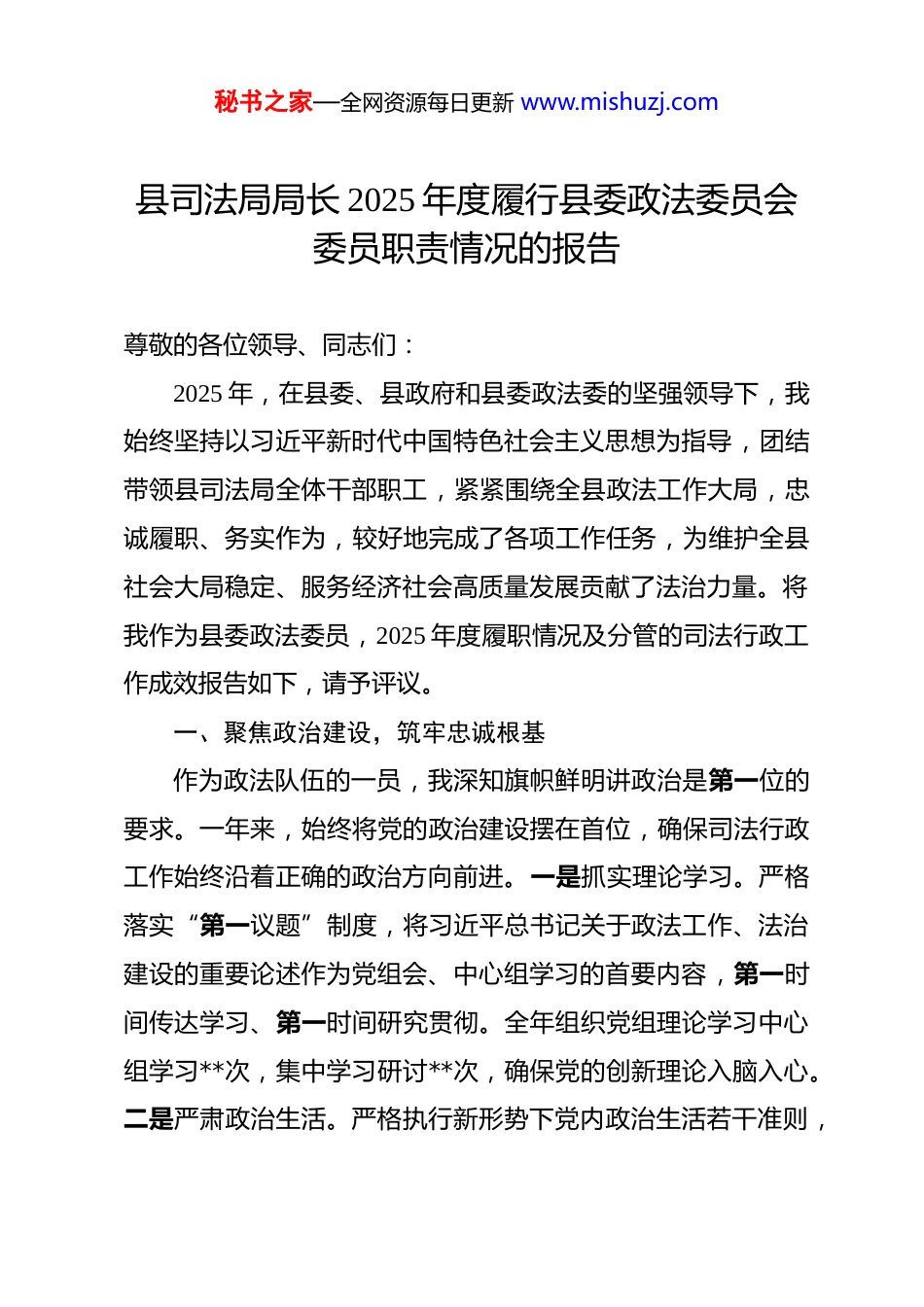 秘书之家—全网资源每日更新 www.mishuzj.com县司法局局长 2025 年度履行县委政法委员会委员职责情况的报告 尊敬的各位领导、同志们:2025 年,在县委、县政府和县委政法委的坚强领导下,我始终坚持以习近平新时代中国特色社会主义思想为指导,团结带领县司法局全体干部职工,紧紧围绕全县政法工作大局,忠诚履职、务实作为,较好地完成了各项工作任务,为维护全县社会大局稳定、服务经济社会高质量发展贡献了法治力量。将我作为县委政法委员,2025 年度履职情况及分管的司法行政工作成效报告如下,请予评议。一、聚焦政治建设,筑牢忠诚根基作为政法队伍的一员,我深知旗帜鲜明讲政治是第一位的要求。一年来,始终将党的政治建设摆在首位,确保司法行政工作始终沿着正确的政治方向前进。一是抓实理论学习。严格落实“第一议题”制度,将习近平总书记关于政法工作、法治建设的重要论述作为党组会、中心组学习的首要内容,第一时间传达学习、第一时间研究贯彻。全年组织党组理论学习中心组学习**次,集中学习研讨**次,确保党的创新理论入脑入心。二是严肃政治生活。严格执行新形势下党内政治生活若干准则,秘书之家—全网资源每日更新 www.mishuzj.com认真落实民主集中制,凡属“三重一大”事项,均由党组集体研究决定。高质量开好年度民主生活会,带头开展批评和自我批评,不断提高班子的凝聚力和战斗力。三是扛牢政治责任。教育引导全局干部职工深刻认识司法行政机关的政治属性,不断提高政治判断力、政治领悟力、政治执行力,坚决把县委和县委政法委的各项决策部署不折不扣落到实处。二、聚焦中心大局,护航经济发展紧紧围绕县委、县政府中心工作,主动将司法行政工作融入全县发展大局,全力以赴为高质量发展提供坚实法治保障。一是法治化营商环境持续优化。牵头深入开展“法治化营商环境提质升级年”活动,大力推行“扫码入企”和涉企检查“综合查一次”模式,全年涉企检查次数同比下降超过**%,最大限度减少对企业正常生产经营的干扰。坚持执法温度,严格落实“首违不罚”和“两轻一免”清单,全年办理相关案件**件,惠及市场主体**余家。二是涉企法律服务更加精准。组建产业发展法律服务团,深入园区、企业开展“法治体检”**场次,帮助企业防范化解法律风险。高效化解涉企矛盾纠纷**件,依法审结涉企行政复议案件**件,有力维护了公平竞争的市场秩序。三是行政争议化解成效显著。针对行政负责人“出庭不出声”问题,加强府院联动与业务指导,推动行政机关依法行政秘书之家—全网资源每日更新 www.mishuzj.com水平提升。2025 年,全县行政案件一审败诉率降至**%,同比降低**个百分点,败诉率为全市最低,法治政府建设根基更加牢固。三、聚焦民生福祉,优化法律服务始终坚持以人民为中心的发展思想,努力让人民群众在每一项法律服务中感受到公平正义和法治温暖。一是公共法律服务网络更健全。持续推进城乡公共法律服务均等化,深化“互联网+”模式,实现村(社区)法律顾问全覆盖。全年县管律师代理案件**件,开展线上线下法律服务**场次,解答群众咨询**人次,群众获得法律服务的便捷性大幅提升。二是困难群体权益保障更有力。不断降低法律援助门槛,扩大援助范围,全年共办理法律援助案件**件,为受援人挽回经济损失**万元。特别是在根治欠薪方面,全年为**名农民工追回劳动报酬**万元,切实维护了弱势群体的合法权益。三是公证服务质效再上新台阶。创新推出的公证处“小房”二手房交易提存平台经验,**次在全省公证系统培训会上作交流推广,负责人杜亦磊同志荣获司法部通报表扬。全年办理公证**件,提供上门服务**次,群众满意度达到**%。四、聚焦平安建设,维护社会稳定作为县委政法委委员,维护社会和谐稳定是我的首要职责。秘书之家—全网资源每日更新 www.mishuzj.com我始终牢固树立底线思维,全力以赴防风险、保安全、护稳定。一是筑牢矛盾化解“第一道防线”。健全县、乡、村三级人民调解组织网络,全面建成“诉调、警调、访调”对接平台,推动力量融合、工作联动。全年共排查化解各类矛盾纠纷**件,调解成功率达到**%以上,大量矛盾发现在早、化解在小。...