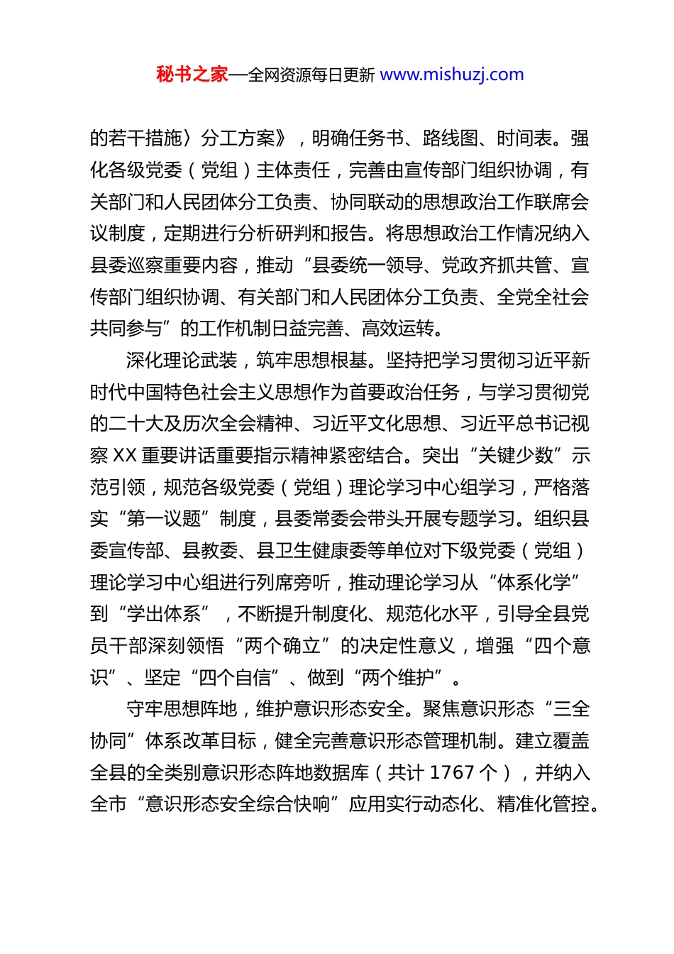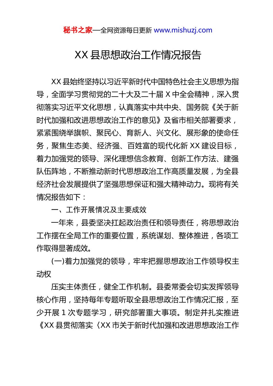 秘书之家—全网资源每日更新 www.mishuzj.comXX 县思想政治工作情况报告XX 县始终坚持以习近平新时代中国特色社会主义思想为指导,全面学习贯彻党的二十大及二十届 X 中全会精神,深入贯彻落实习近平文化思想,认真落实中共中央、国务院《关于新时代加强和改进思想政治工作的意见》及省市相关部署要求,紧紧围绕举旗帜、聚民心、育新人、兴文化、展形象的使命任务,聚焦生态美、经济强、百姓富的现代化新 XX 建设目标,着力加强党的领导、深化理想信念教育、创新工作方法、建强队伍阵地,不断推动新时代思想政治工作高质量发展,为全县经济社会发展提供了坚强思想保证和强大精神动力。现将有关情况报告如下:一、工作开展情况及主要成效一年来,县委坚决扛起政治责任和领导责任,将思想政治工作摆在全局工作的重要位置,系统谋划、整体推进,各项工作取得显著成效。(一)着力加强党的领导,牢牢把握思想政治工作领导权主动权压实主体责任,健全工作机制。县委常委会切实发挥领导核心作用,坚持每年专题听取全县思想政治工作情况汇报,至少开展 1 次专题学习,研究部署重大事项。制定并扎实推进《XX 县贯彻落实〈XX 市关于新时代加强和改进思想政治工作秘书之家—全网资源每日更新 www.mishuzj.com的若干措施〉分工方案》,明确任务书、路线图、时间表。强化各级党委(党组)主体责任,完善由宣传部门组织协调,有关部门和人民团体分工负责、协同联动的思想政治工作联席会议制度,定期进行分析研判和报告。将思想政治工作情况纳入县委巡察重要内容,推动“县委统一领导、党政齐抓共管、宣传部门组织协调、有关部门和人民团体分工负责、全党全社会共同参与”的工作机制日益完善、高效运转。深化理论武装,筑牢思想根基。坚持把学习贯彻习近平新时代中国特色社会主义思想作为首要政治任务,与学习贯彻党的二十大及历次全会精神、习近平文化思想、习近平总书记视察 XX 重要讲话重要指示精神紧密结合。突出“关键少数”示范引领,规范各级党委(党组)理论学习中心组学习,严格落实“第一议题”制度,县委常委会带头开展专题学习。组织县委宣传部、县教委、县卫生健康委等单位对下级党委(党组)理论学习中心组进行列席旁听,推动理论学习从“体系化学”到“学出体系”,不断提升制度化、规范化水平,引导全县党员干部深刻领悟“两个确立”的决定性意义,增强“四个意识”、坚定“四个自信”、做到“两个维护”。守牢思想阵地,维护意识形态安全。聚焦意识形态“三全协同”体系改革目标,健全完善意识形态管理机制。建立覆盖全县的全类别意识形态阵地数据库(共计 1767 个),并纳入全市“意识形态安全综合快响”应用实行动态化、精准化管控。秘书之家—全网资源每日更新 www.mishuzj.com严格各类报告会、研讨会、讲座等活动的审批备案管理。县委常委会定期研究意识形态工作,召开分析研判会议,开展专项清理行动,有效防范化解风险隐患。积极运用市级“文化·三情联动”平台加强意识形态领域监管。顺利完成上级巡视意识形态专项检查反馈意见的整改工作,确保了意识形态领域总体平稳可控、向上向好。(二)着力理想信念教育,有力推动思想政治工作常态化制度化深入开展群众性主题宣传教育。围绕“强国复兴有我”等主题,广泛开展形式多样的宣传教育活动,将社会主义核心价值观深度融入社会生活和基层实践。组织“党的二十届三中全会精神”、习近平总书记视察 XX 重要讲话重要指示精神、习近平文化思想等专题宣讲,推动党的创新理论飞入寻常百姓家,入脑入心入行。创新打造“理说丹乡”“XX 新声进基层”“科龙门阵”等基层宣讲品牌,通过院坝会、特色宣讲、微宣讲等形式,结合赠阅理论读物,实现理论传播的分众化、大众化、互动化。累计撰写高质量理论宣讲稿 180 余篇,其中 41 篇被人民网、《XX 学习论坛》、《XX 报》等主流媒体刊发,阅读量超 20 万人次。成功举办“XX 城市精神”表述语征集活动,线上线下联动,征集表述语 250 余条,凝聚了社会共识。全面加强思想道德建设。创新思政教育形式,打造“行走的思政课”品牌,结合气象科普、非遗传承、红色...