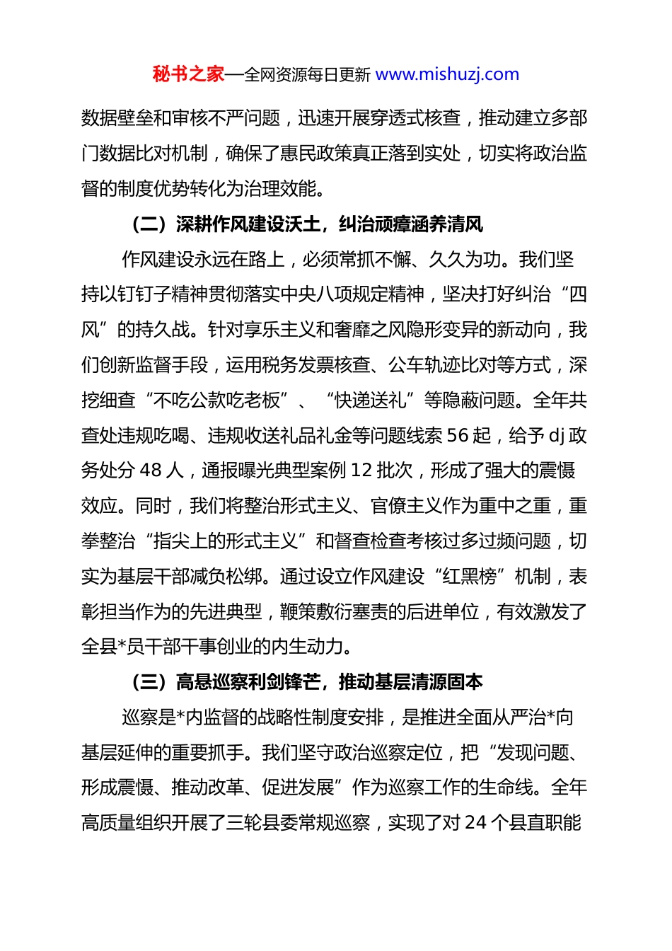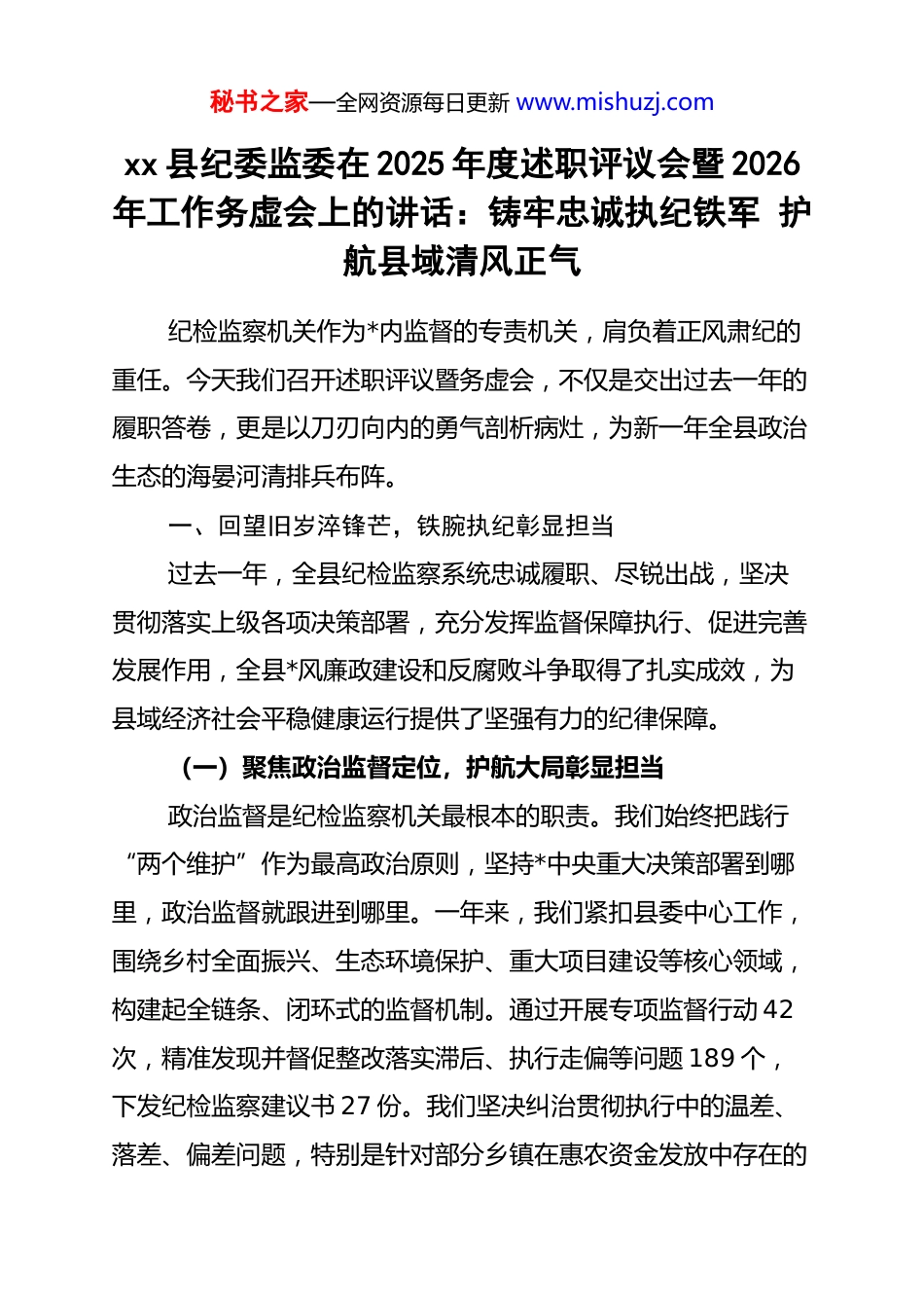 秘书之家—全网资源每日更新 www.mishuzj.comxx 县纪委监委在 2025 年度述职评议会暨 2026年工作务虚会上的讲话:铸牢忠诚执纪铁军 护航县域清风正气纪检监察机关作为*内监督的专责机关,肩负着正风肃纪的重任。今天我们召开述职评议暨务虚会,不仅是交出过去一年的履职答卷,更是以刀刃向内的勇气剖析病灶,为新一年全县政治生态的海晏河清排兵布阵。一、回望旧岁淬锋芒,铁腕执纪彰显担当过去一年,全县纪检监察系统忠诚履职、尽锐出战,坚决贯彻落实上级各项决策部署,充分发挥监督保障执行、促进完善发展作用,全县*风廉政建设和反腐败斗争取得了扎实成效,为县域经济社会平稳健康运行提供了坚强有力的纪律保障。(一)聚焦政治监督定位,护航大局彰显担当政治监督是纪检监察机关最根本的职责。我们始终把践行“两个维护”作为最高政治原则,坚持*中央重大决策部署到哪里,政治监督就跟进到哪里。一年来,我们紧扣县委中心工作,围绕乡村全面振兴、生态环境保护、重大项目建设等核心领域,构建起全链条、闭环式的监督机制。通过开展专项监督行动 42次,精准发现并督促整改落实滞后、执行走偏等问题 189 个,下发纪检监察建议书 27 份。我们坚决纠治贯彻执行中的温差、落差、偏差问题,特别是针对部分乡镇在惠农资金发放中存在的秘书之家—全网资源每日更新 www.mishuzj.com数据壁垒和审核不严问题,迅速开展穿透式核查,推动建立多部门数据比对机制,确保了惠民政策真正落到实处,切实将政治监督的制度优势转化为治理效能。(二)深耕作风建设沃土,纠治顽瘴涵养清风作风建设永远在路上,必须常抓不懈、久久为功。我们坚持以钉钉子精神贯彻落实中央八项规定精神,坚决打好纠治“四风”的持久战。针对享乐主义和奢靡之风隐形变异的新动向,我们创新监督手段,运用税务发票核查、公车轨迹比对等方式,深挖细查“不吃公款吃老板”、“快递送礼”等隐蔽问题。全年共查处违规吃喝、违规收送礼品礼金等问题线索 56 起,给予 dj 政务处分 48 人,通报曝光典型案例 12 批次,形成了强大的震慑效应。同时,我们将整治形式主义、官僚主义作为重中之重,重拳整治“指尖上的形式主义”和督查检查考核过多过频问题,切实为基层干部减负松绑。通过设立作风建设“红黑榜”机制,表彰担当作为的先进典型,鞭策敷衍塞责的后进单位,有效激发了全县*员干部干事创业的内生动力。(三)高悬巡察利剑锋芒,推动基层清源固本巡察是*内监督的战略性制度安排,是推进全面从严治*向基层延伸的重要抓手。我们坚守政治巡察定位,把“发现问题、形成震慑、推动改革、促进发展”作为巡察工作的生命线。全年高质量组织开展了三轮县委常规巡察,实现了对 24 个县直职能秘书之家—全网资源每日更新 www.mishuzj.com部门和 18 个乡镇的政治体检全覆盖。在巡察过程中,我们注重下沉一线,把巡察的触角延伸到村级*组织,紧盯村级“三资”管理、工程项目发包等微权力运行环节,深挖群众身边的“微腐败”。本年度巡察共发现各类突出问题 412 个,移交重点问题线索 68 件。针对巡察发现的共性问题,我们压实被巡察单位*组织整改主体责任,实行台账化管理和销号制落实,不仅解决了一批群众反映强烈的急难愁盼问题,更推动了相关部门完善规章制度 45 项,真正实现了巡视巡察上下联动、源头治理的良好政治效果。(四)坚守审查调查底线,惩治贪腐绝不手软惩治腐败是纪检监察机关的核心业务,必须保持零容忍的震慑高压。我们坚持严的主基调不动摇,有腐必反、有贪必肃。一年来,全县共受理信访举报 345 件,立案审查调查 128 件,结案 115 件,给予 dj 政务处分 112 人,采取留置措施 14 人,成功挽回直接经济损失 2850 万元。我们在办案过程中,坚持“风腐同查”理念,既查腐败案件背后的作风问题,也深挖作风问题中潜藏的权钱交易。针对医疗购销、工程招投标等腐败易发多发领域,我们集中力量查处了一批性质恶劣、影响极坏的典型案件,彻底清除了隐藏在系统内部的毒瘤。同时,我们始终把办案安全放在首位,严格落实审查调查安全工作责任制,常态化开展安全隐患排查和突发...